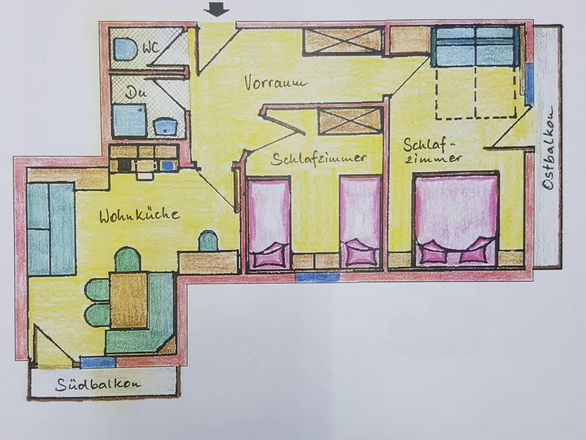 Schlafzimmer, Wohnraum, Küchenzeile, Dusche/WC, großer Südbalkon, Vorraum