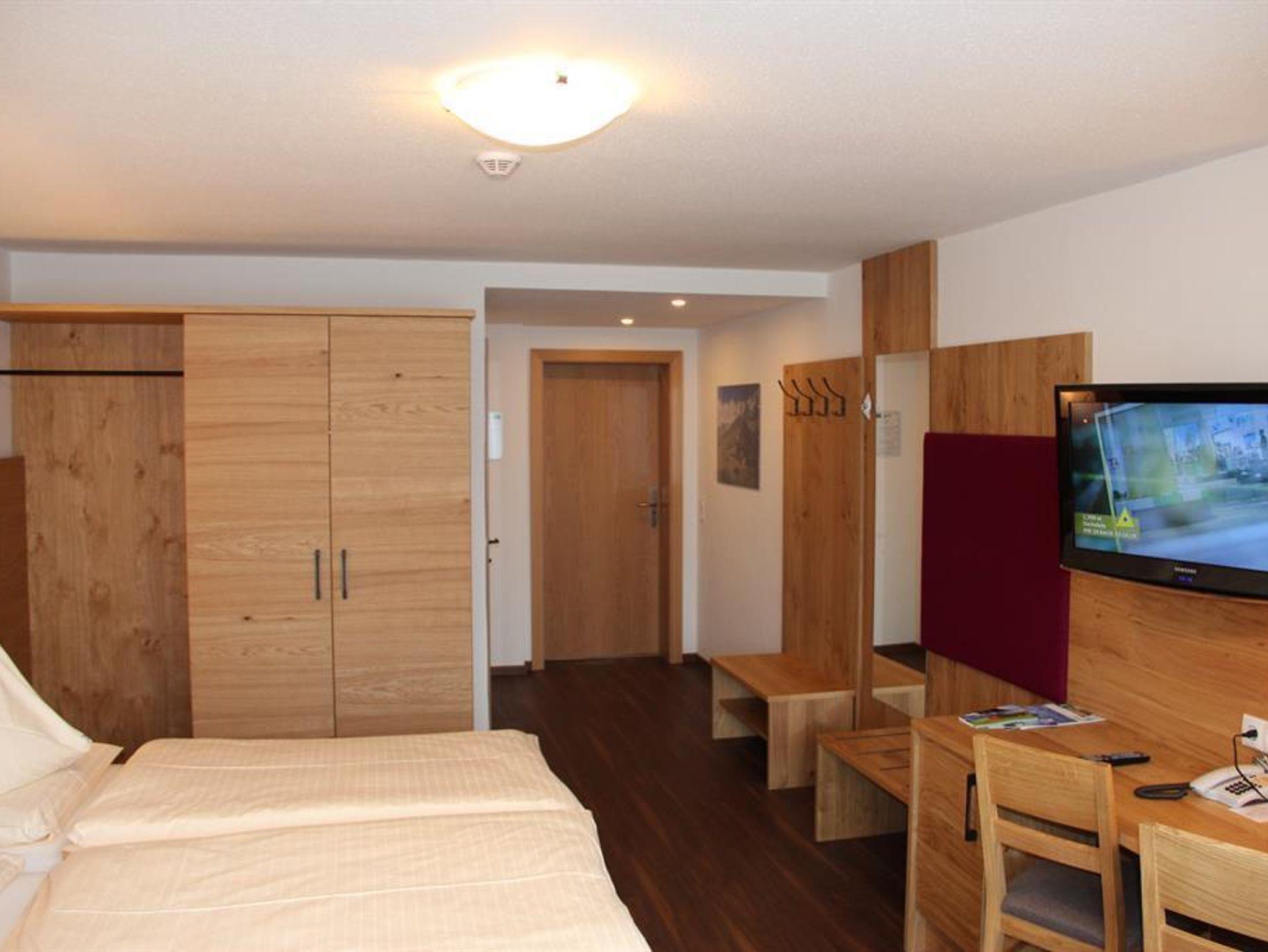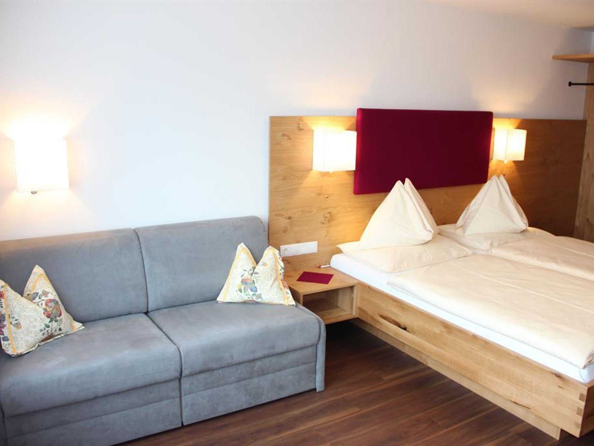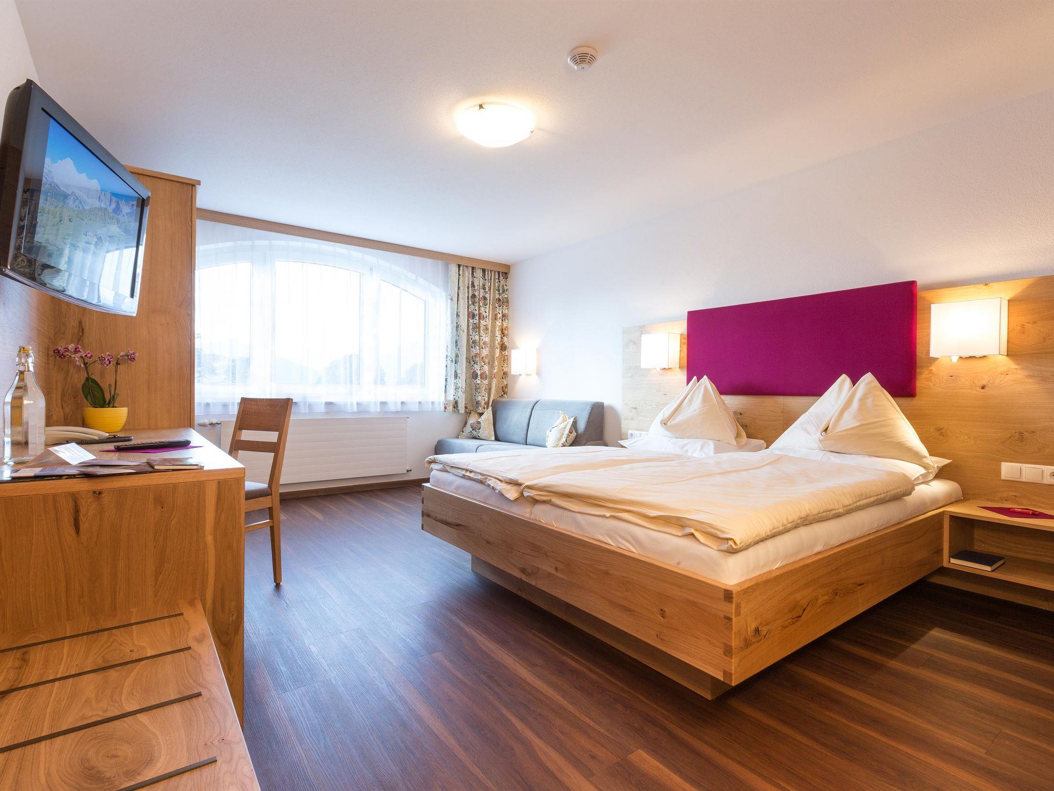 Geräumiges, gemütliches Doppelzimmer mit Couchbett (29m²) Südseitig großes Rundbogenfenster mit Blick auf die Schladminger Tauern (ohne Balkon) helles Badezimmer mit Dusche/WC, [Flachbild-TV, W-LAN gratis, Telefon, Haarfön, Safe] Bequem mit dem Etagenlift erreichbar.