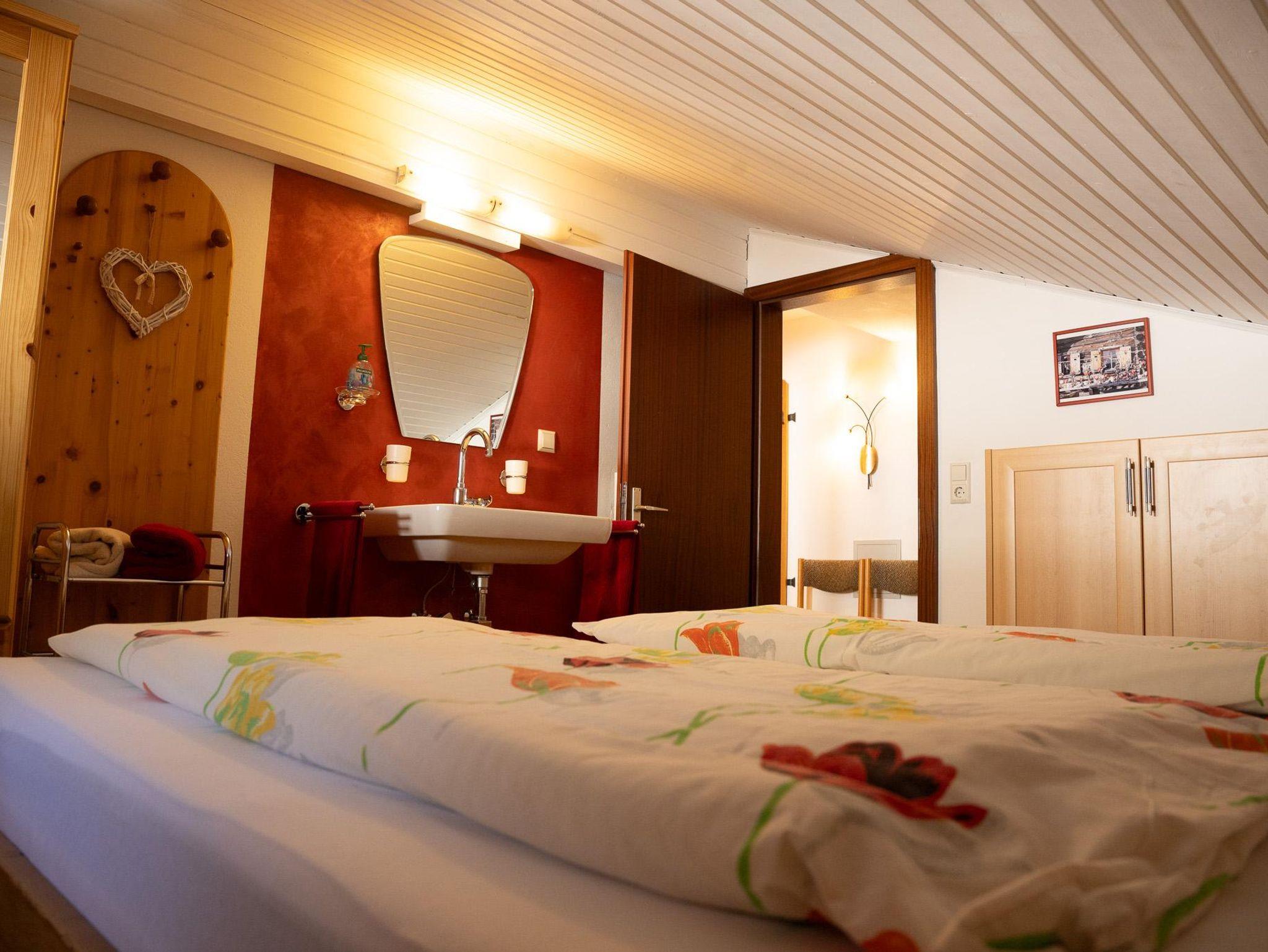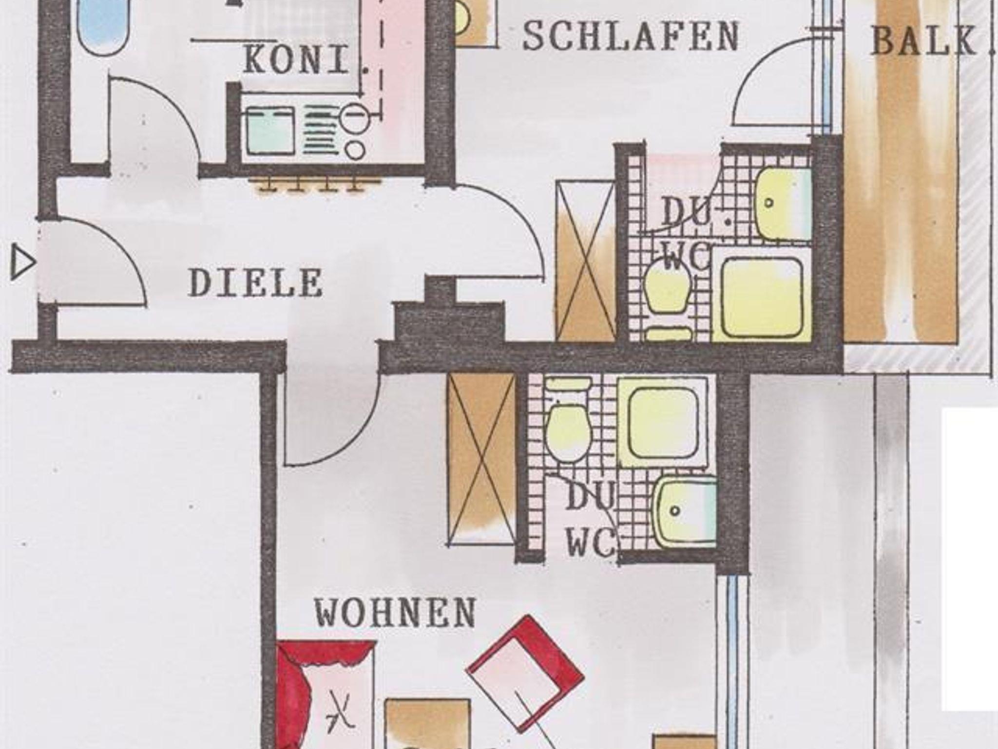 1 Doppelzimmer mit Dusche/WC, 1 Wohnzimmer mit Schlafgelegenheit für 2 Personen mit Dusche/WC, 1 Wohnküche, Sat-TV, Radio, Süd-, Ost- und Nordbalkon, für 2-5 Personen, 60 m²