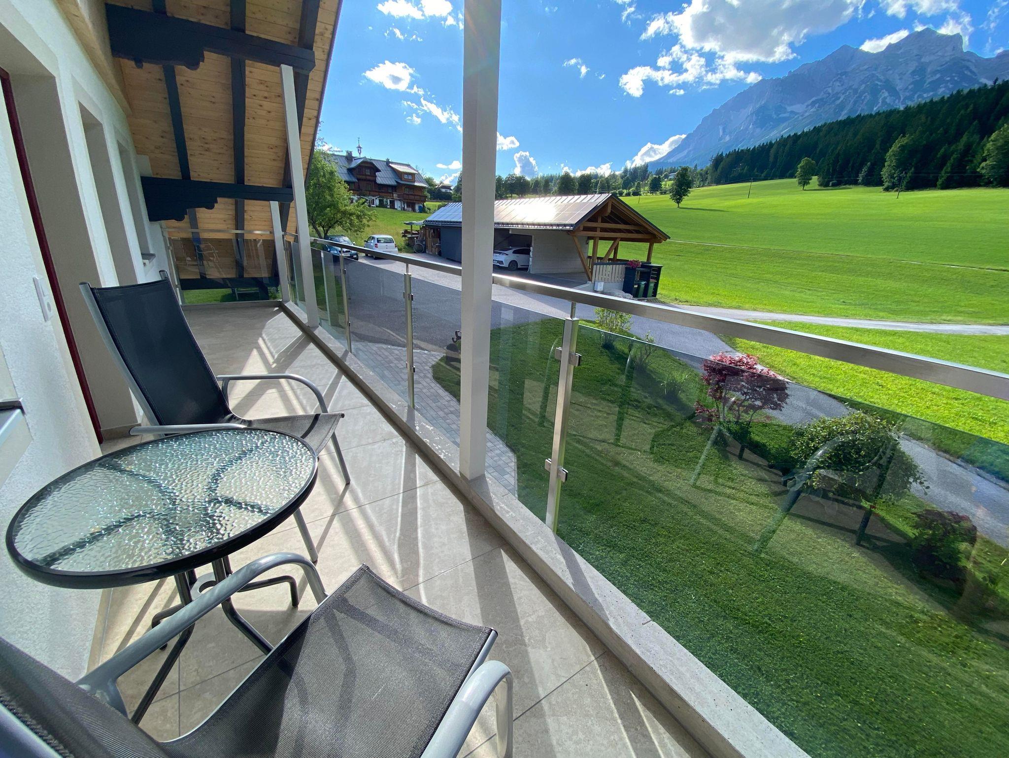 Die sonnigen Ferienwohnungen in unserem Haus Alpenblick sind mit rustikalen Holzmöbeln eingerichtet. Die Ferienwohnung Dachstein mit 72m² verfügt über zwei Badezimmer, eine vollausgestattete Küche inkl. Grill, Backrohr und Geschirrspülmaschine sowie eine gemütliche Sitzgelegenheit und einen nordseitigen Balkon. Auf der Südseite befindet sich der große Balkon mit viel Platz und einen fantastischen Ausblick auf die Schladminger Tauern.