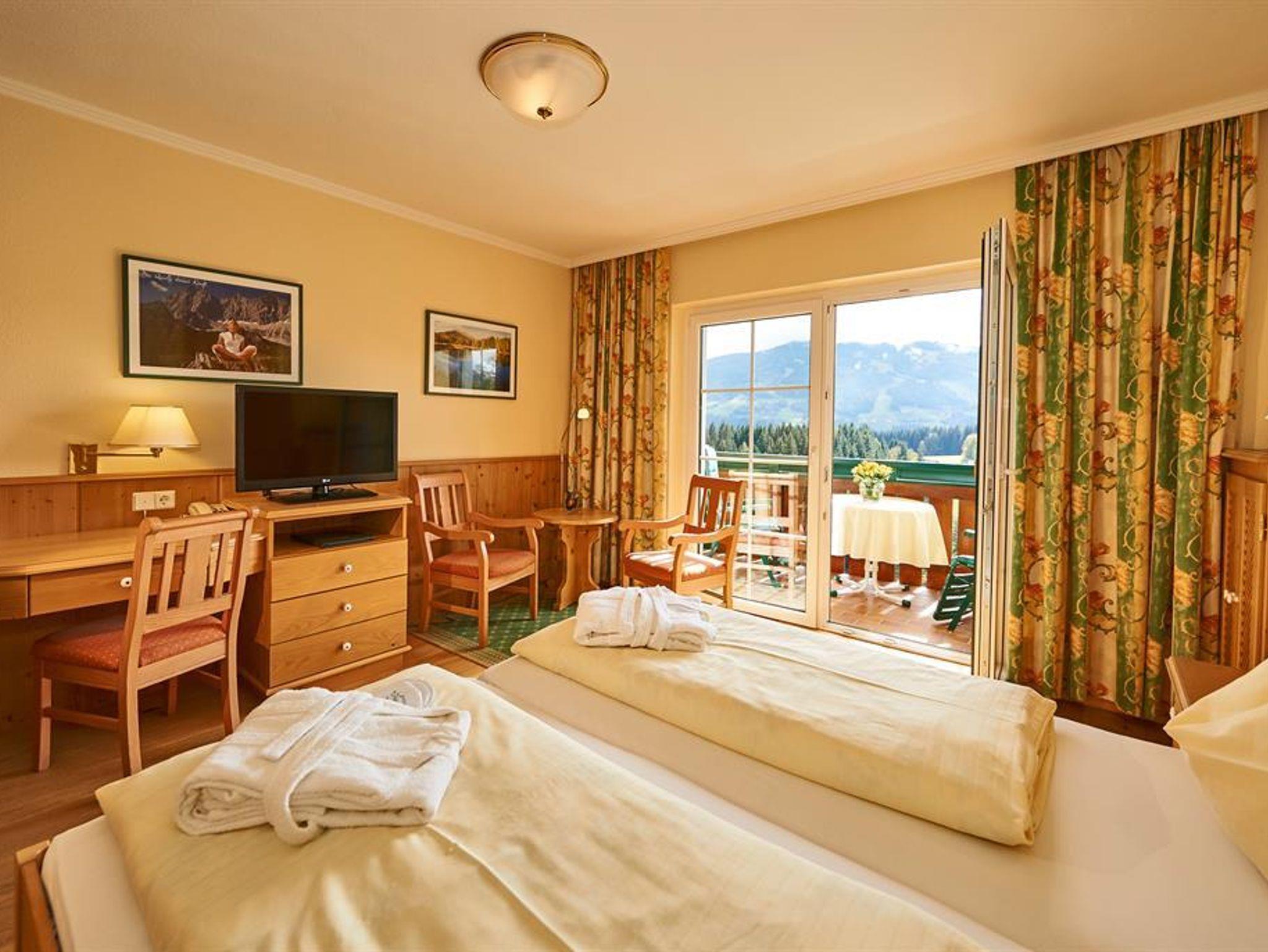 Familienzimmer = Doppelzimmer für 2 Personen mit Holzboden, mit Balkon und schönem Panoramablick, Badezimmer mit Dusche und WC, Fön, Bademäntel. Getrenntes kleines Kinderzimmer mit 2 Einzelbetten, Balkon mit schönem Panoramablick. Badezimmer mit Waschbecken und WC, Fön, Bademäntel. Beide Zimmer mit Sat-TV und Safe.