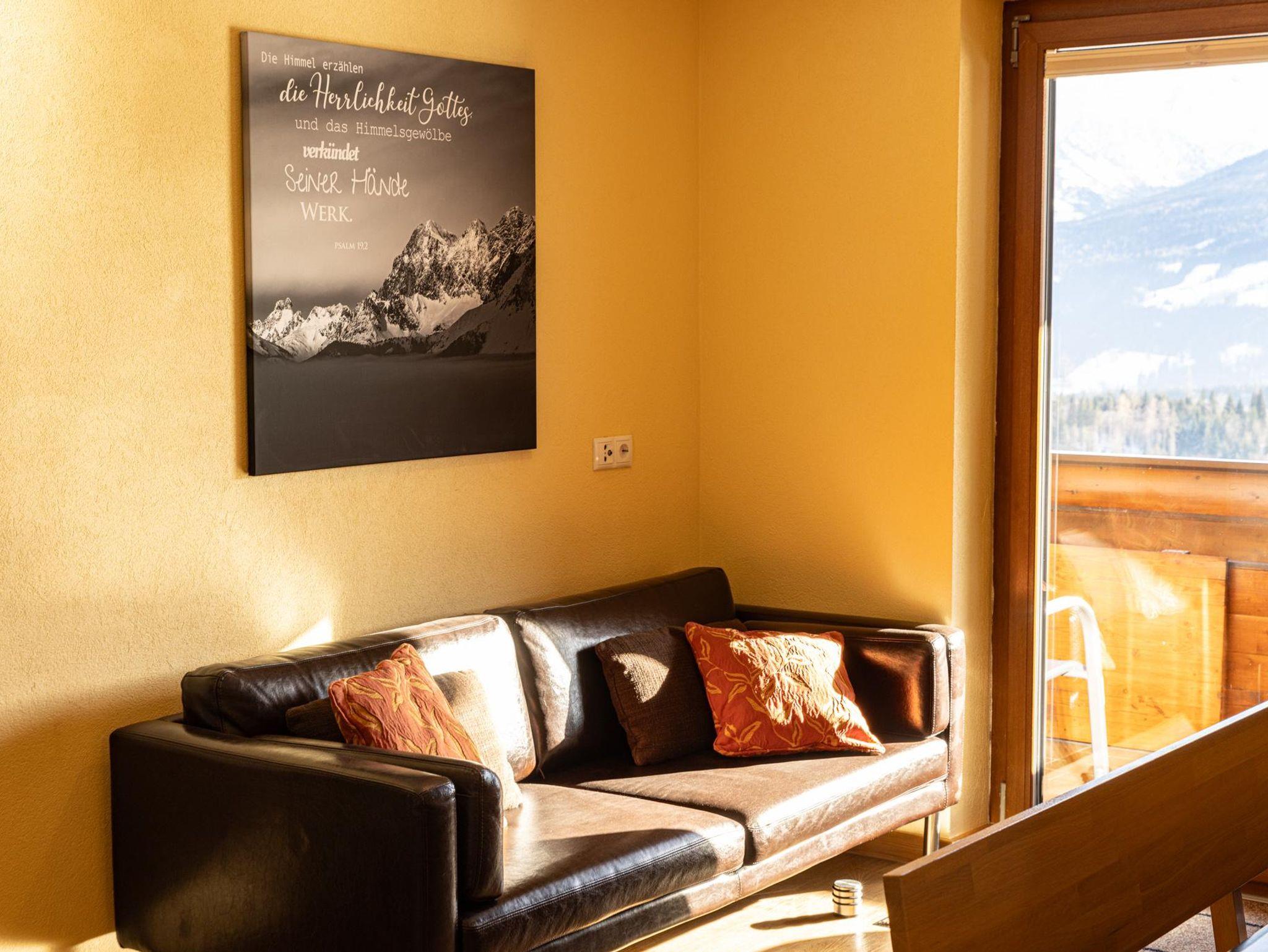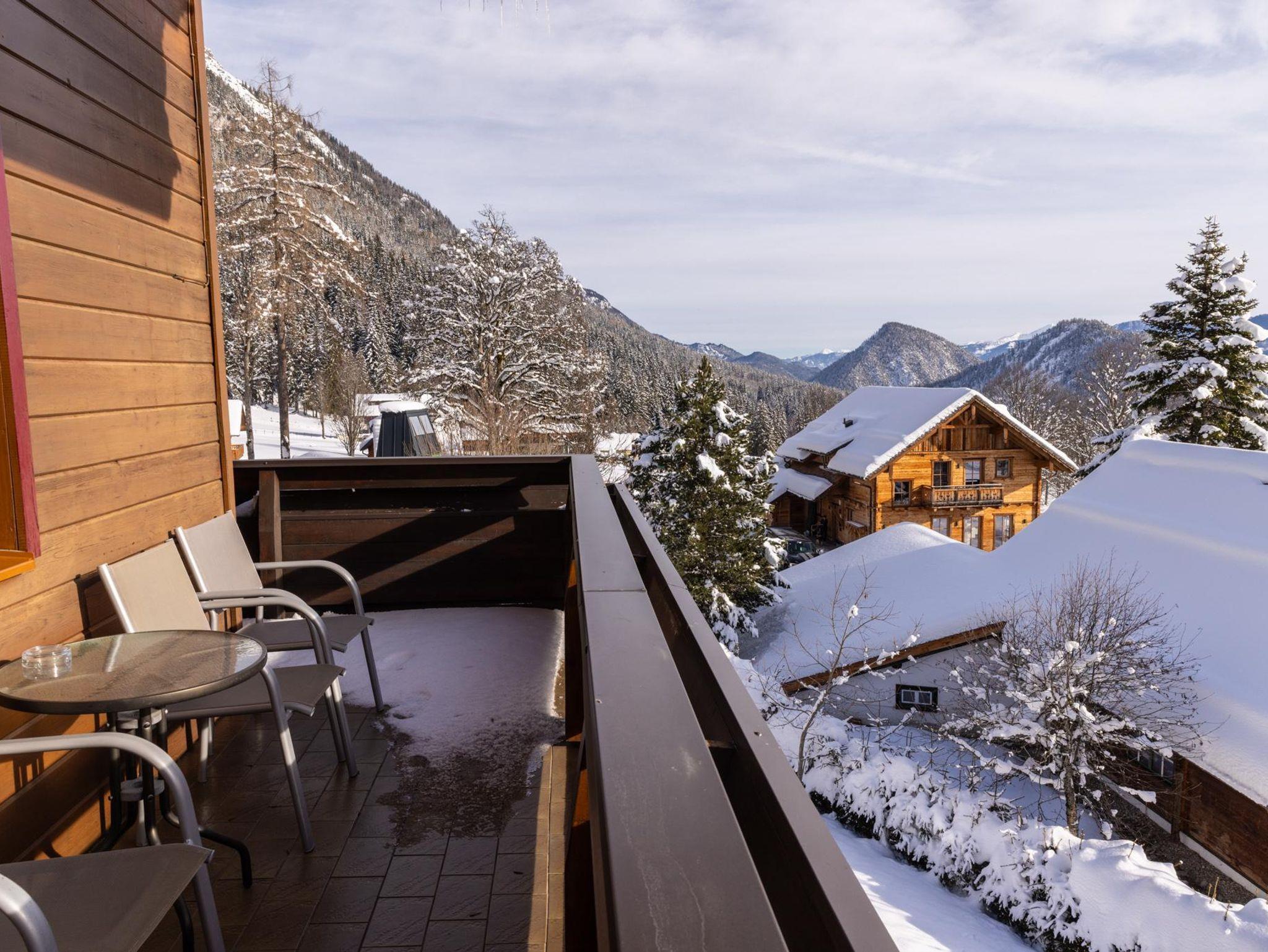 Balkon mit Sitzgelegenheit und wunderbarem Blick auf entweder die Schladminger Tauern oder das Dachsteinmassiv.