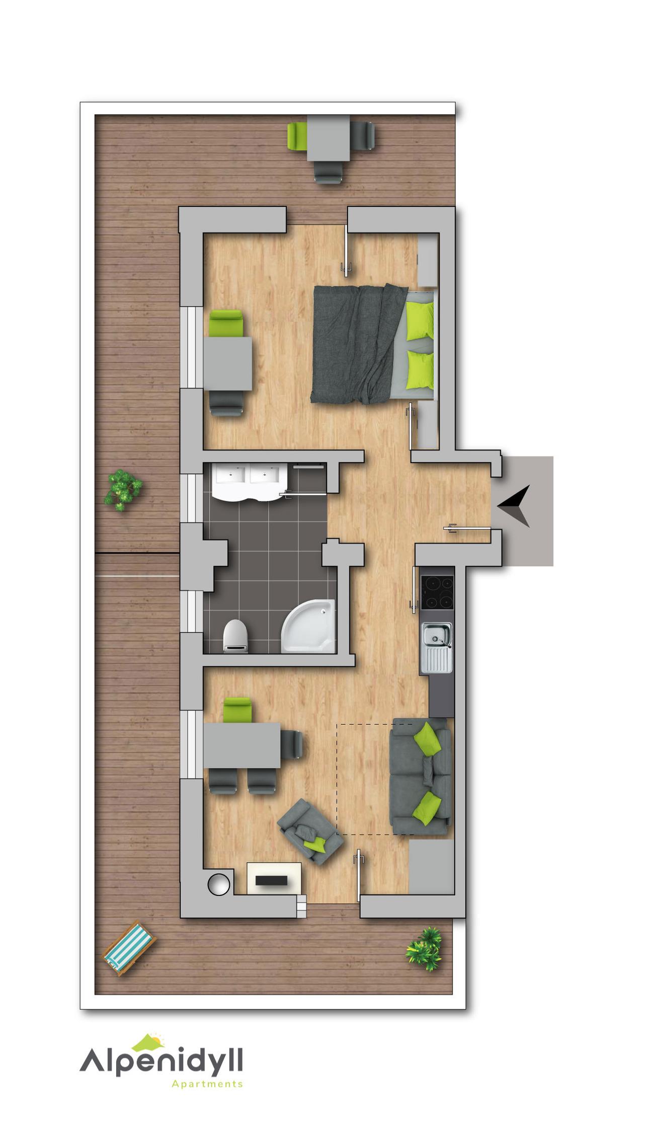 Ein helles geräumiges Apartment mit einem riesigen Balkon rund um die Ferienwohnung. Das gemütliche Wohnzimmer mit einer Schlafcouch, einem Esstisch mit 5 Stühlen und einer Kochnische bietet alles, was man für einen entspannten Urlaub benötigt.