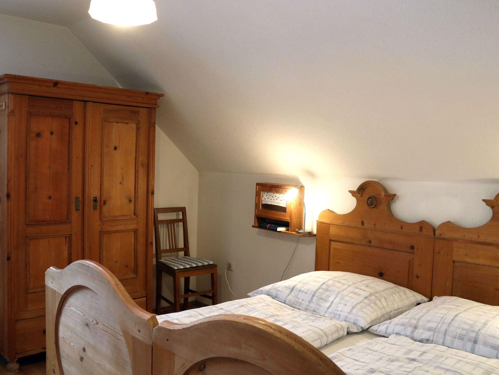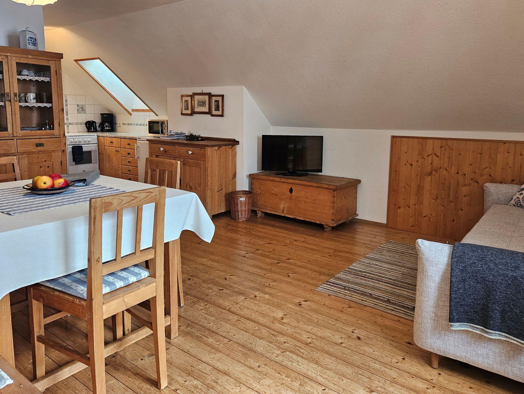 Willkommen in unserer gemütlichen 45 m² Ferienwohnung, ideal für Paare oder kleine Familien mit bis zu 4 Personen. Für das besondere Flair dieser Wohnung sorgen die liebevoll restaurierten alten Bauernmöbel. Die Wohnung liegt im Dachgeschoß und ist über eine Treppe zugänglich. Der Schlafraum mit einen Doppelbett ist durch einen Vorhang vom Wohnraum getrennt. Hier befindet sich ein zusätzliches Schlafsofa (1,60 m). Die kleine Küche ist angrenzend. Für die kleinsten Gäste stellen wir gerne Gitterbett und Hochstuhl bereit. Bettwäsche und Handtücher sind selbstverständlich im Preis inbegriffen. Als besonderen Service bieten wir Ihnen werktags und samstags einen morgendlichen Bäckerservice durch unseren lokalen Bäcker an.