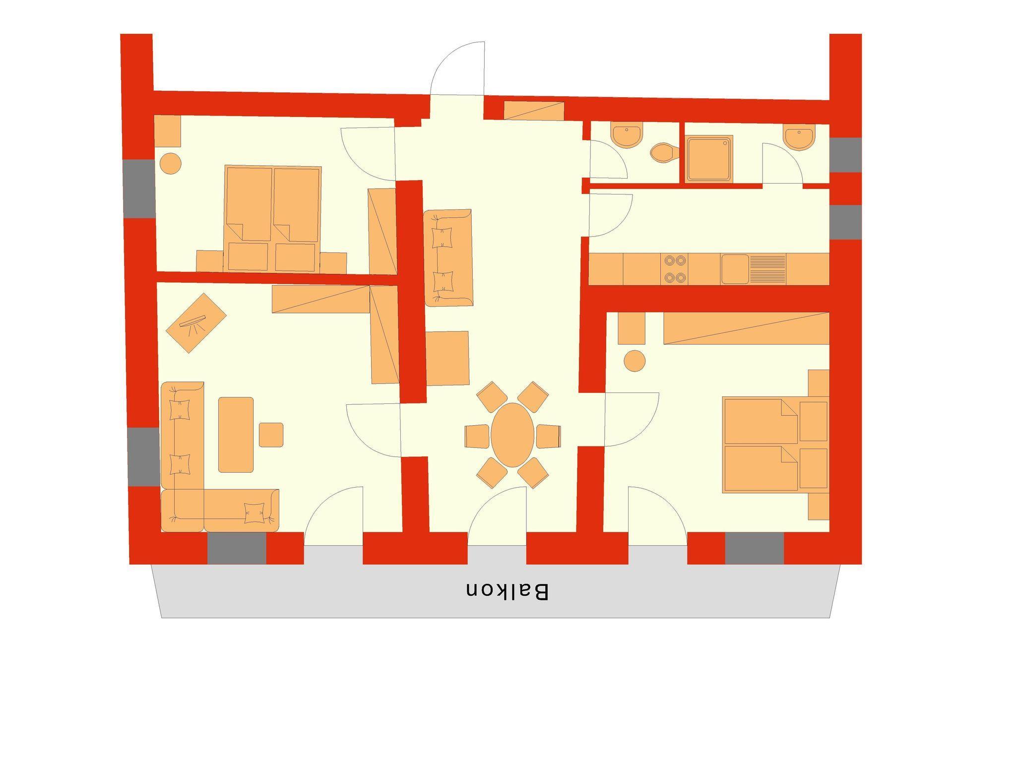 Wohnung Typ/C 82m² für 2-5 Pers.: 2 Schlafzimmer (1 Zustelbett möglich), 1 sep. Dusche/WC, Esszimmer (mit Ausziehtisch bis 8 Pers.), Wohnzimmer mit Couch, Küche: E-Herd mit 4 Platten Ceranfeld und Backrohr, Kühlschrank mit Gefrierfach, Geschirrspüler, Filterkaffeemaschine, Mikrowelle, Wasserkocher, Geschirr für 10 Pers., Sat/TV, Föhn, Radio, Safe u. Balkon.
