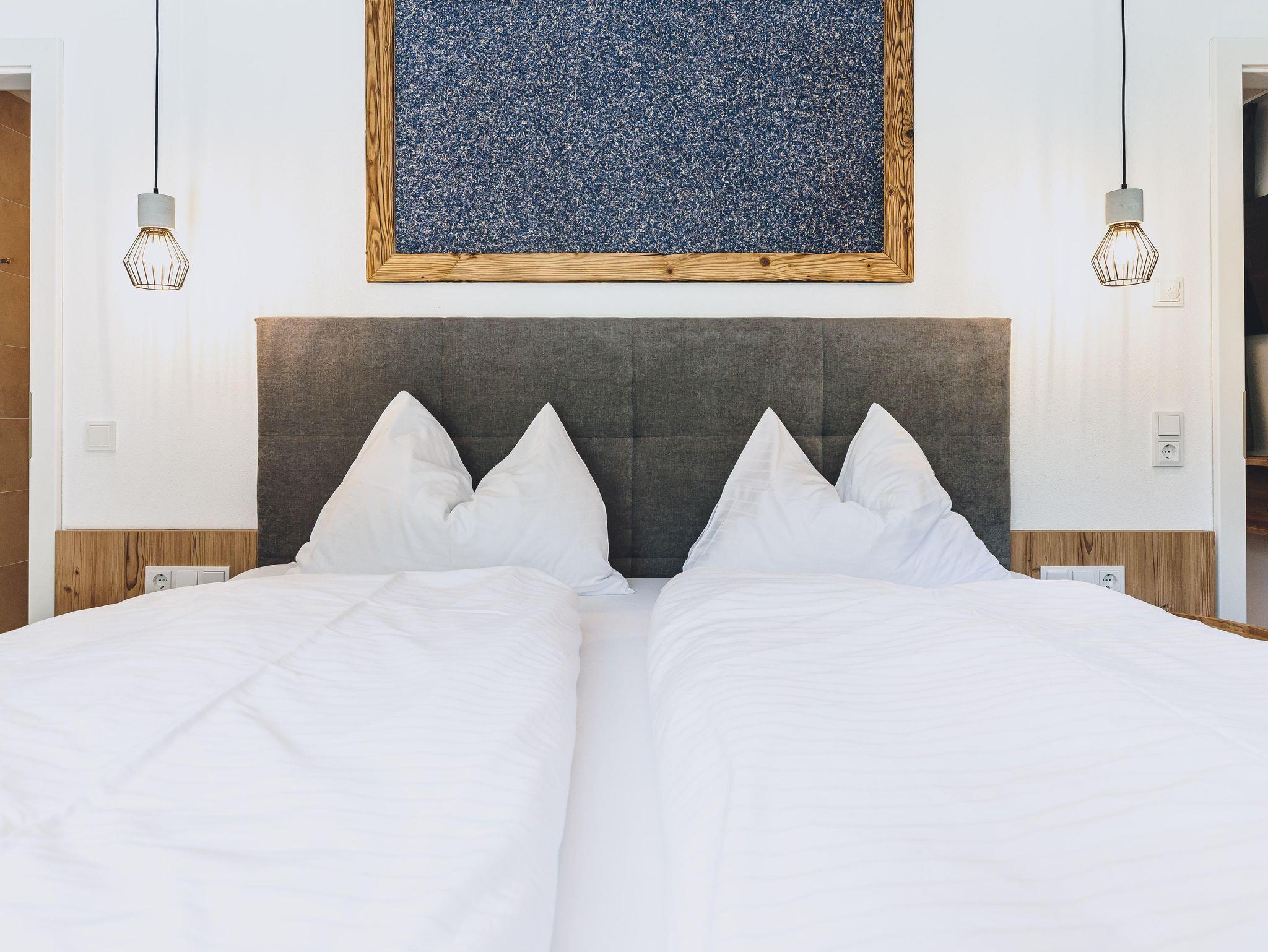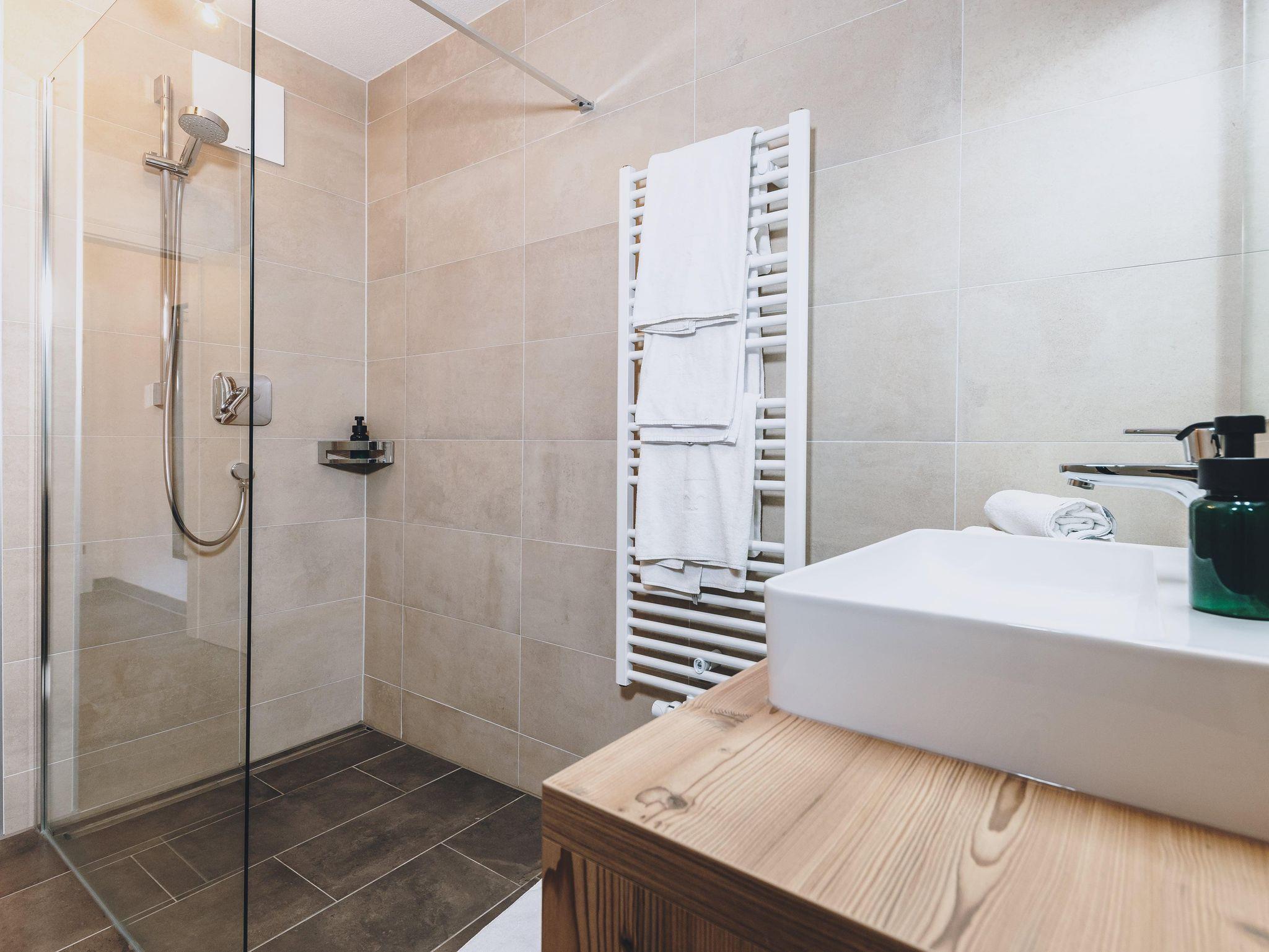 Die Apartments im 1. Obergeschoss verfügen über 50m² Wohnfläche (Wohnzimmer, separates Schlafzimmer, Badezimmer mit Dusche & WC und Balkon).