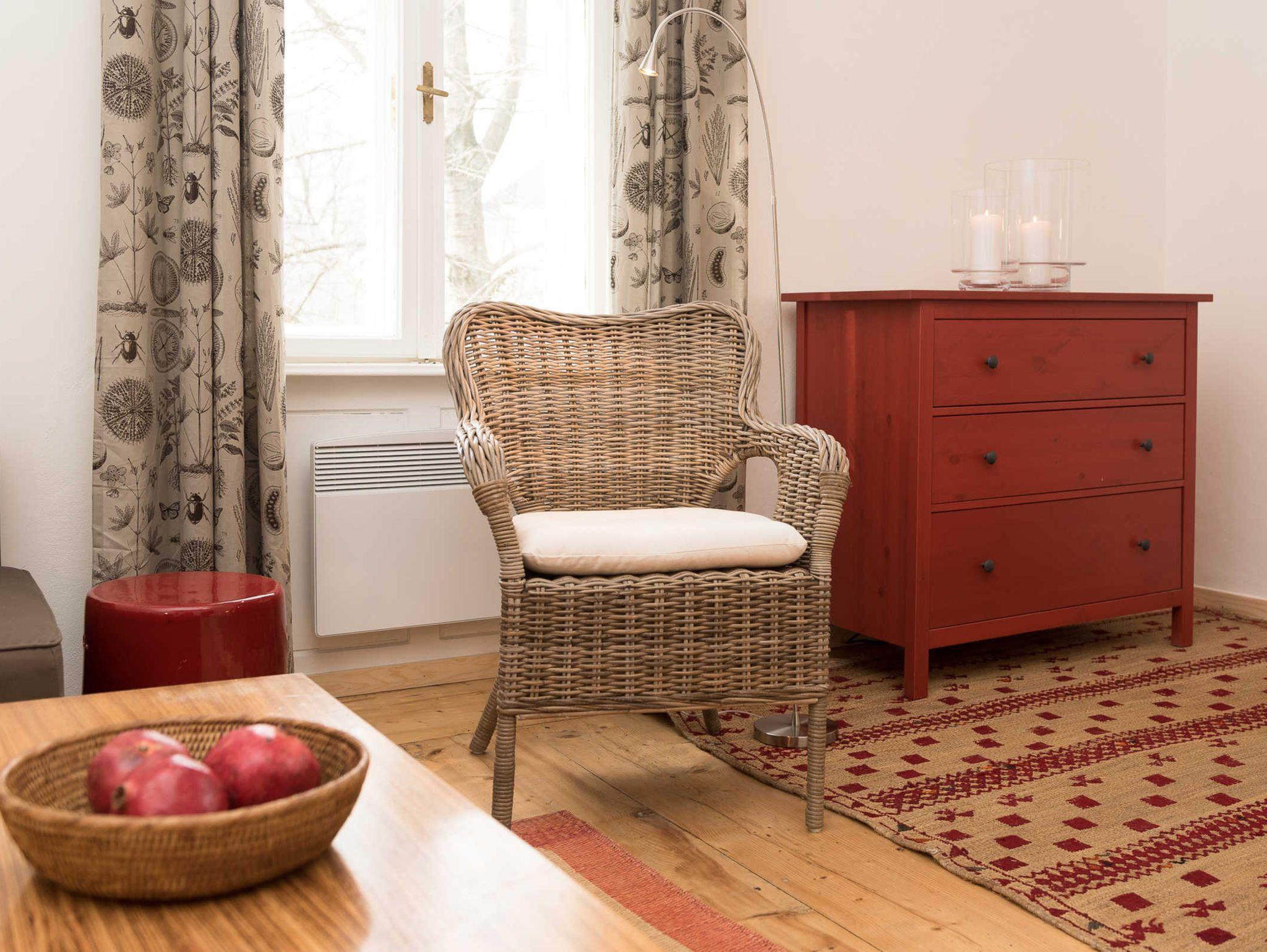 Ein gemütlich-gediegener Landhausstil zieht sich durch alle Apartments, mit Möbeln aus 3 Jahrhunderten. Alle Apartments sind nicht nur teppichbodenfrei, man bewegt sich überwiegend auf 120 Jahre alten Dielen. Dazu alle komfortablen Errungenschaften von heute: gemütliche Badewannen für Zwei (nicht in allen Apartments), Fußbodenheizung im Bad, durchgehend gratis WLAN, Ultraflachbildschirme mit SAT Anschluss (viele davon digital und damit streaming-fähig), DVD Player und eine Auswahl an DVDs etc. Pelletöfen in jeder Wohnung sorgen für gemütliche Wärme und Feuerschein auf Knopfdruck, auch wenn es jenseits des Winters einmal etwas kühler wird.