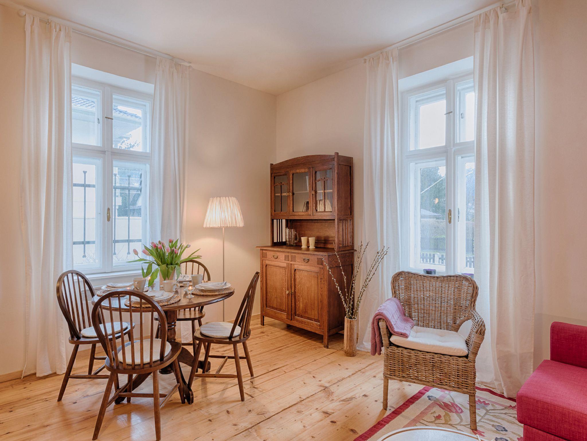 Ein gemütlich-gediegener Landhausstil zieht sich durch alle Apartments, mit Möbeln aus 3 Jahrhunderten. Alle Apartments sind nicht nur teppichbodenfrei, man bewegt sich überwiegend auf 120 Jahre alten Dielen. Dazu alle komfortablen Errungenschaften von heute: gemütliche Badewannen für Zwei (nicht in allen Apartments), Fußbodenheizung im Bad, durchgehend gratis WLAN, Ultraflachbildschirme mit SAT Anschluss (viele davon digital und damit streaming-fähig), DVD Player und eine Auswahl an DVDs etc. Pelletöfen in jeder Wohnung sorgen für gemütliche Wärme und Feuerschein auf Knopfdruck, auch wenn es jenseits des Winters einmal etwas kühler wird.