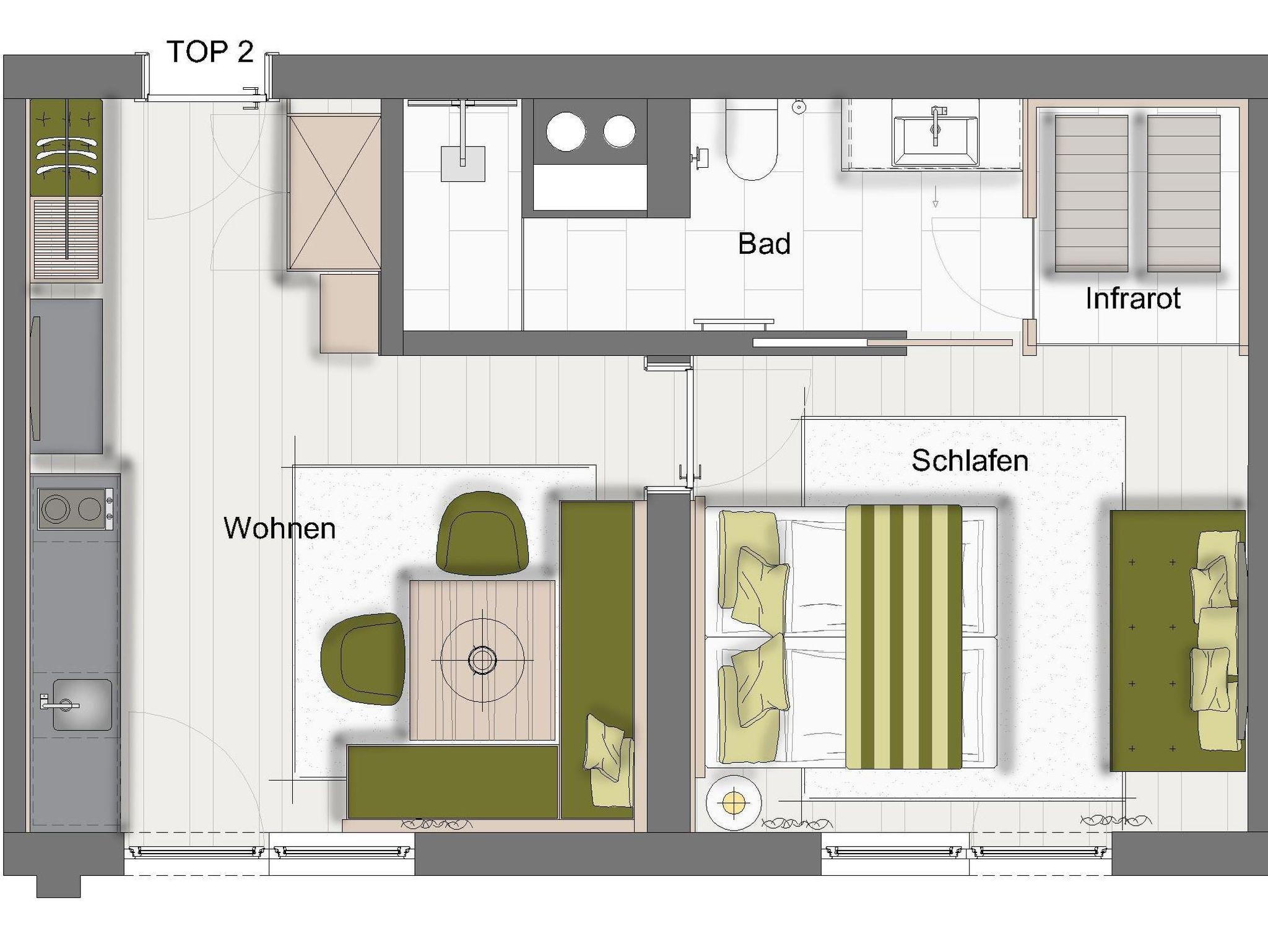Die südseitige, komplett renovierte Ferienwohnung Schatzberg (Umbau Herbst 2021) im das Luggi bietet Platz für bis zu zwei Personen. Die Wohnung befindet sich im zweiten Stock (mit Aufzug) und ist ausgestattet mit einer Wohnküche, einem Doppelzimmer, Badezimmer mit Dusche/WC. Besonderheit dieser Ferienwohnung ist eine Infrarotkabine. Weiters hat die Wohnung Kabel-TV und einen Balkon.
