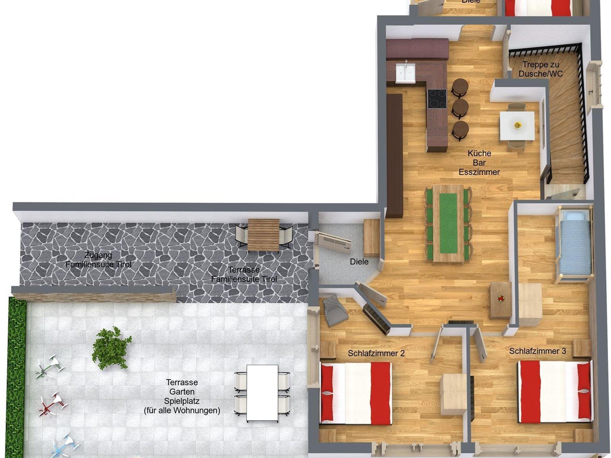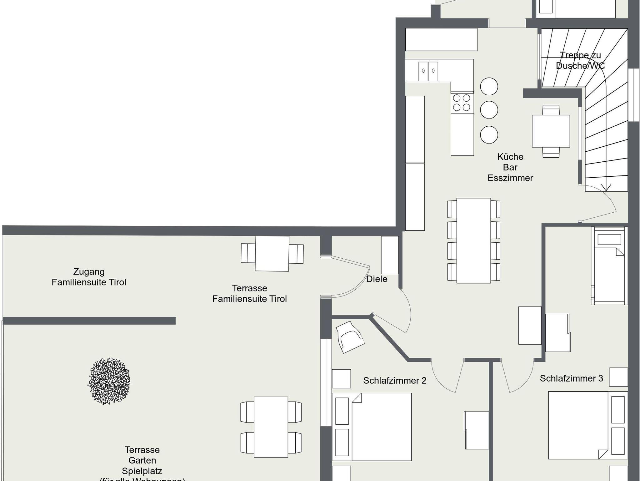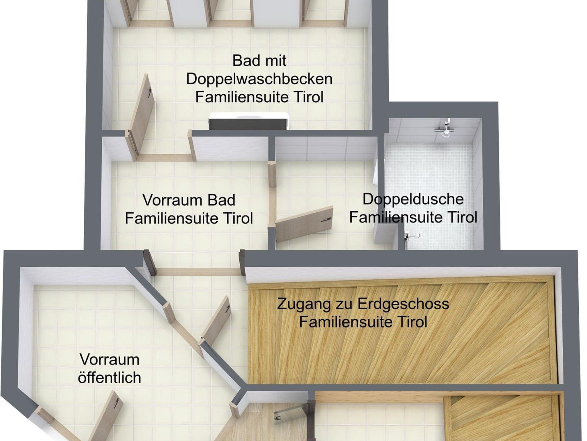 Die Familiensuite Tirol ist mit 116 m2 Wohnfläche überaus geräumig und überzeugt mit einem besonders gemütlichen Ambiente sowie einer hochwertigen Ausstattung im alpinen Chalet-Stil. Die Suite verfügt über insgesamt drei Schlafzimmer für bis zu sieben Personen (1 Doppelbett in der Bauernstube, 1 Schlafzimmer mit einem Boxspring-Doppelbett und einem zusätzlichen Einzel- oder Stockbett sowie 1 Schlafzimmer mit einem Boxspring Doppelbett). Zur hochwertigen technischen Einrichtung der Familiensuite gehören drei Flatscreen TV-Geräte mit internationalen Kanälen, kostenloses Highspeed-WIFI, eine Stereoanlage mit Internetradio und ein für Laptops geeigneter Safe. In der Familiensuite Tirol kann nach Rückfrage maximal ein Zustellbett für eine weitere Person zum Preis von EUR 15,00 pro Übernachtung und ein Babybett (kostenfrei für Kinder bis 2 Jahre) platziert werden.