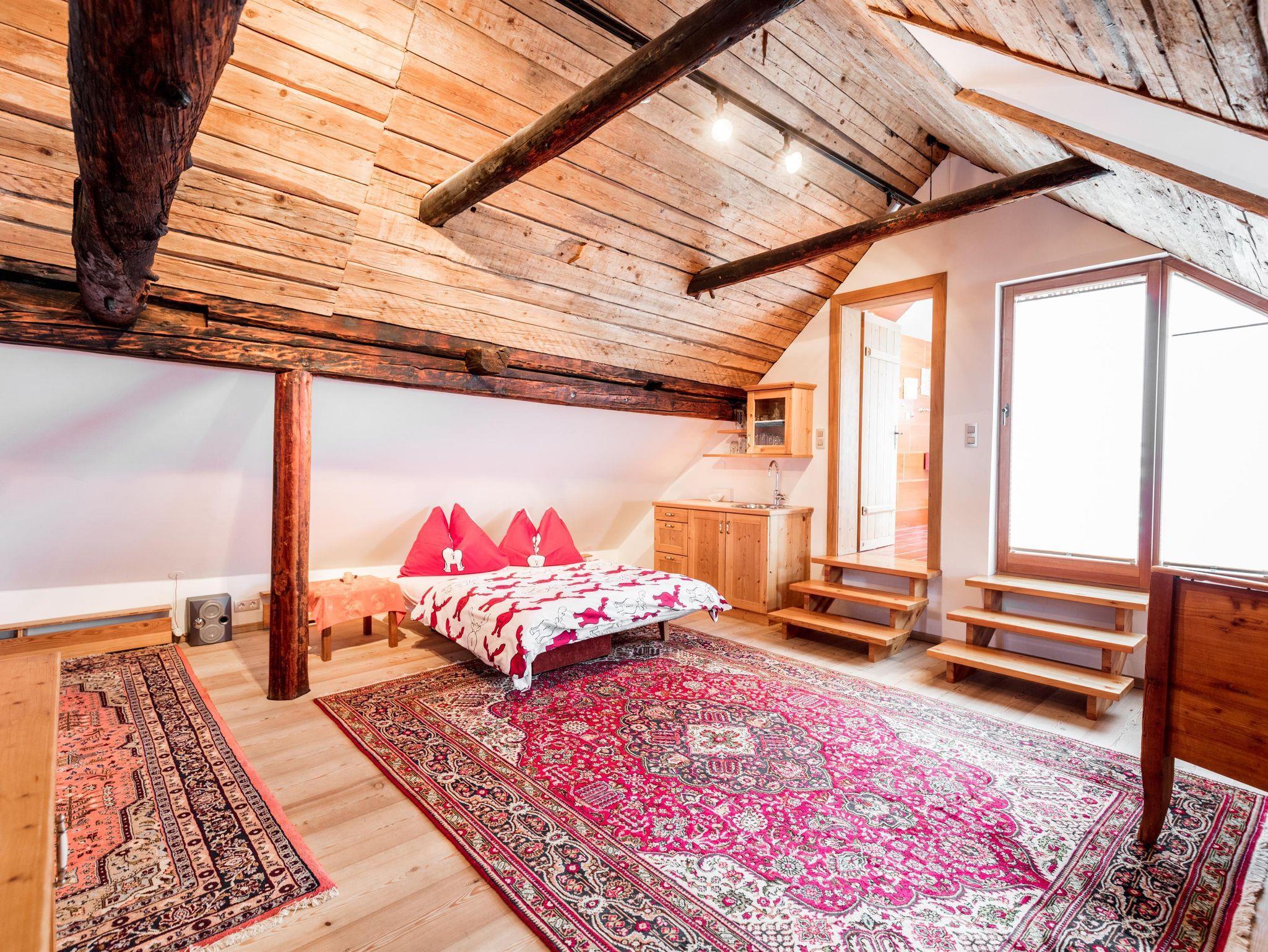 Das Franzosenstüberl ist das kleine Nachbarhaus der Napoleonvilla, ein uriger alter Getreidekasten, adaptiert für Pärchen und Kleinfamilien. Der über 200 Jahre alte, zweigeschossige Holzriegelbau bietet auf 40 m2 und zwei Etagen höchste Wohnkultur für zwei bis fünf Personen. Im Erdgeschoss steht eine vollständig eingerichtete Wohnküche mit massivem Kirschtisch und gemütlicher Eckbank bereit, außerdem ein kleines Badezimmer mit Dusche und WC, Haarföhn und ausreichend Stellage-Ablagen sowie Stereo-Anlage und Internet-Anschluss. Das Obergeschoss besteht aus einem originellem großen Wohnschlafraum mit kleinen Guckfenstern und Oberlichten, bestehend aus zwei Kopf an Kopf liegenden fixeingebauten Massivholz-Einzelbetten sowie einer ausziehbaren Couch (auch ein Gitterbett ist möglich). Für lange Abende steht ein Flatscreen-TV parat. Das Haus kann ganzjährig gebucht werden, tage- oder wochenweise – mit oder ohne Service von der täglichen Reinigung übers Einkaufen bis zur Haushaltsführung. Beschreibung: Holzriegelbau auf Steinsockel Fußbodenheizung unter Eichenholzboden im Erdgeschoss Stromheizung auf beiden Geschoßen 1 Badezimmer (bestehend aus Dusche und WC) im EG 1 voll ausgestattete Wohnküche sowie massiver Küchentisch (Eckbank) 1 Schlafkammer im OG mit 1 Doppelbett, 1 Einzelbett und 1 ausziehbaren Couch Sat-TV, Internet und Stereoanlage Veranda mit Sitzgelegenheiten Liegestühle