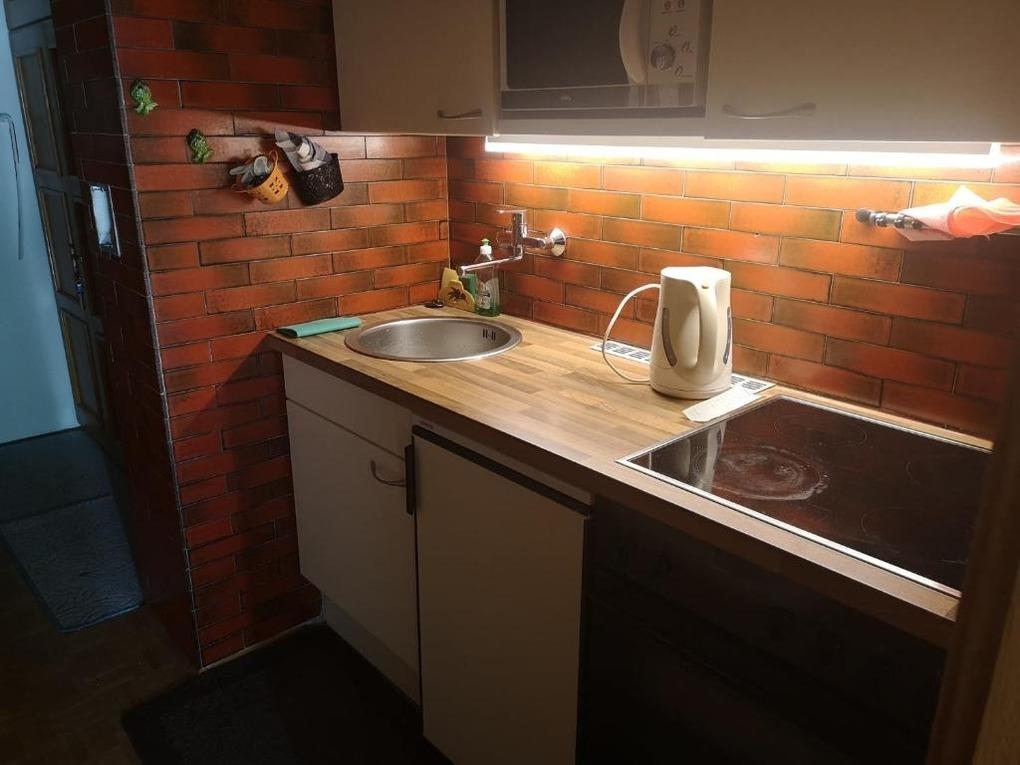 In der gut ausgestatteten Küche finden Sie neben einem Kühlschrank auch eine Mikrowelle und einen Backofen.