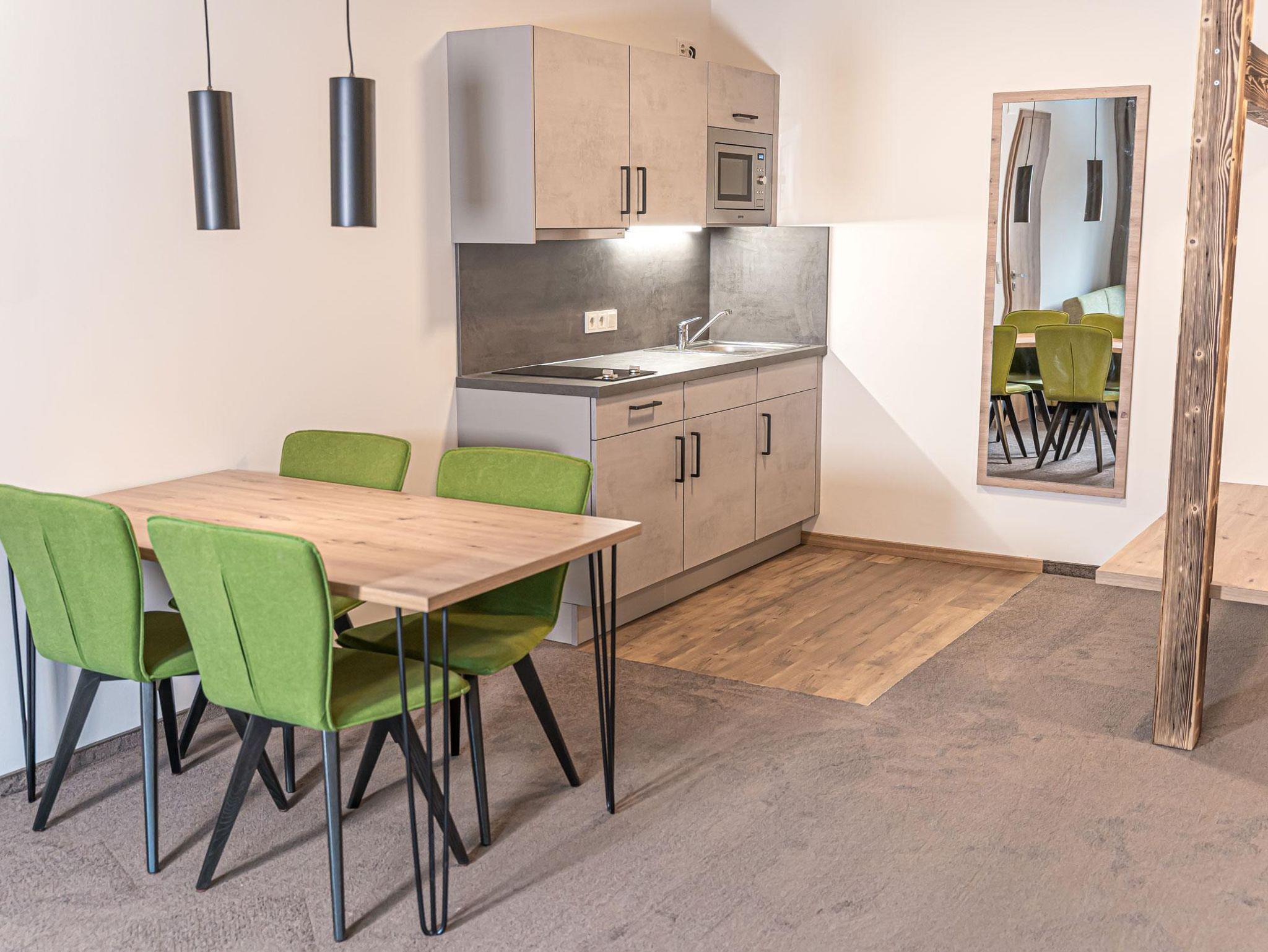 Doppelzimmer mit Balkon und Blick auf das Fellhorn. Ausgestattet mit modernen Möbeln im Eichenholzstil, einem Esstisch mit Stühlen sowie einer Küchenzeile und einer ausziehbaren Couch. Bad mit Dusche, WC und Föhn.
