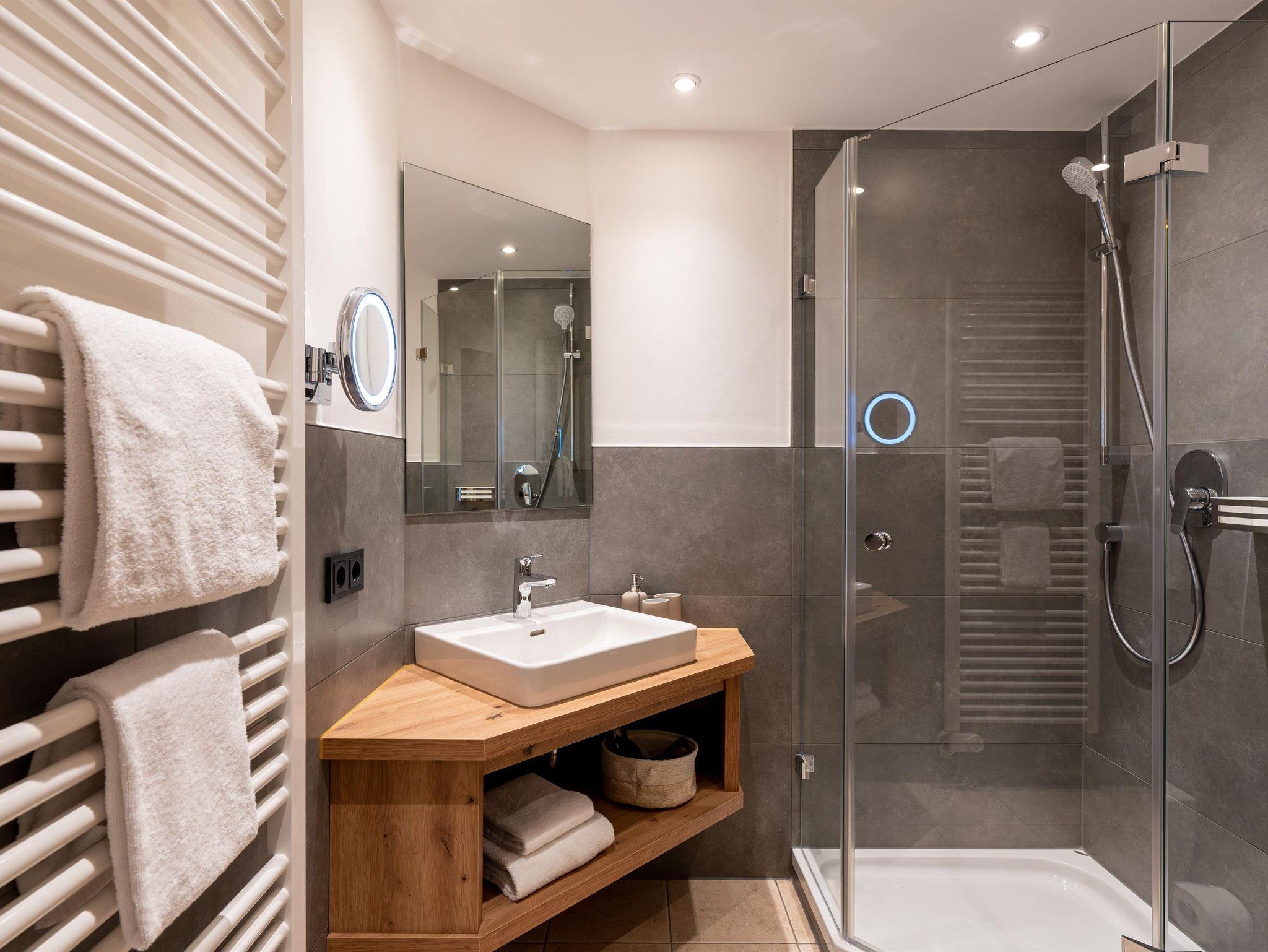 • großes Badezimmer mit Dusche, WC, Föhn und Handtuchwärmer