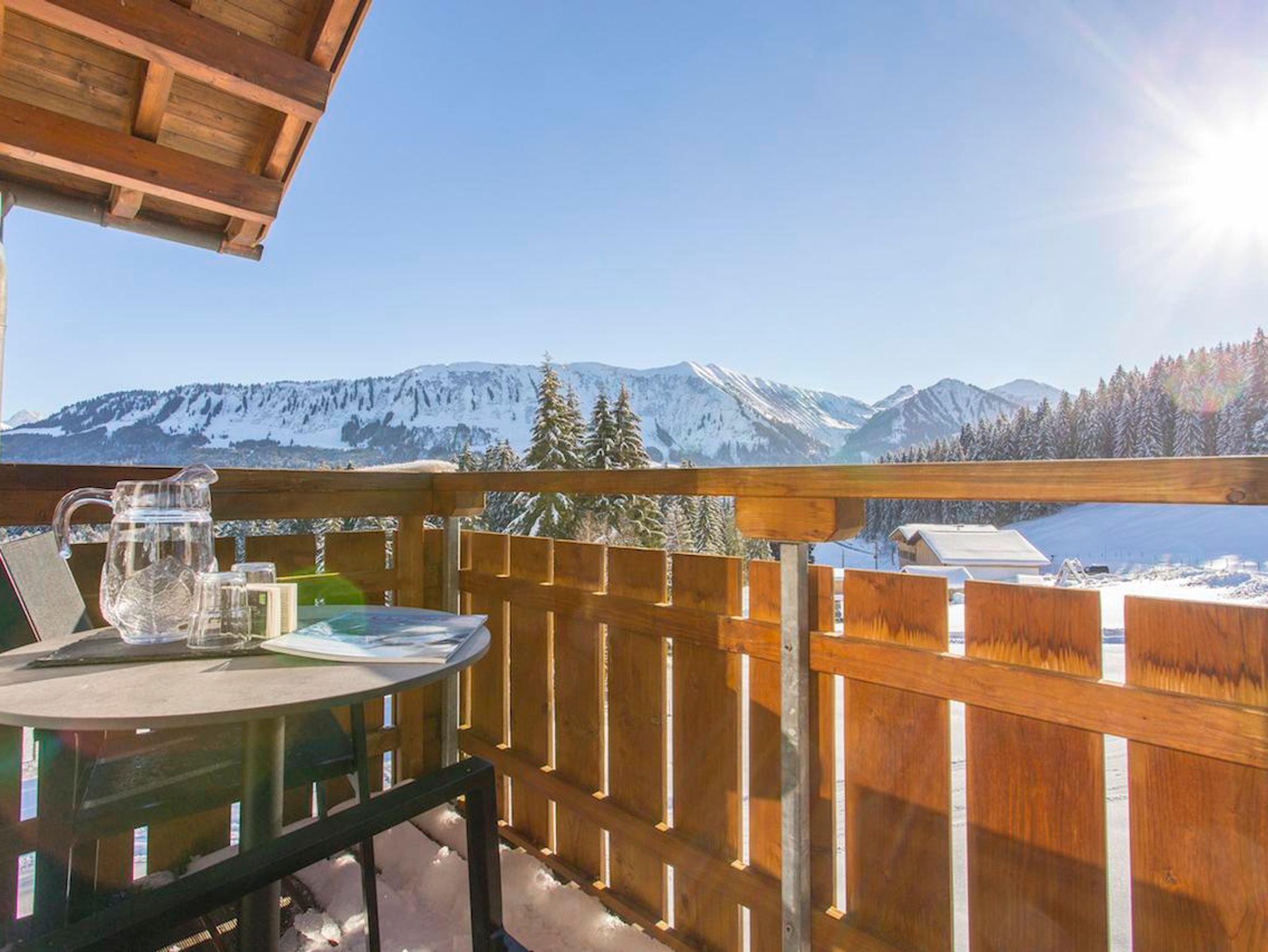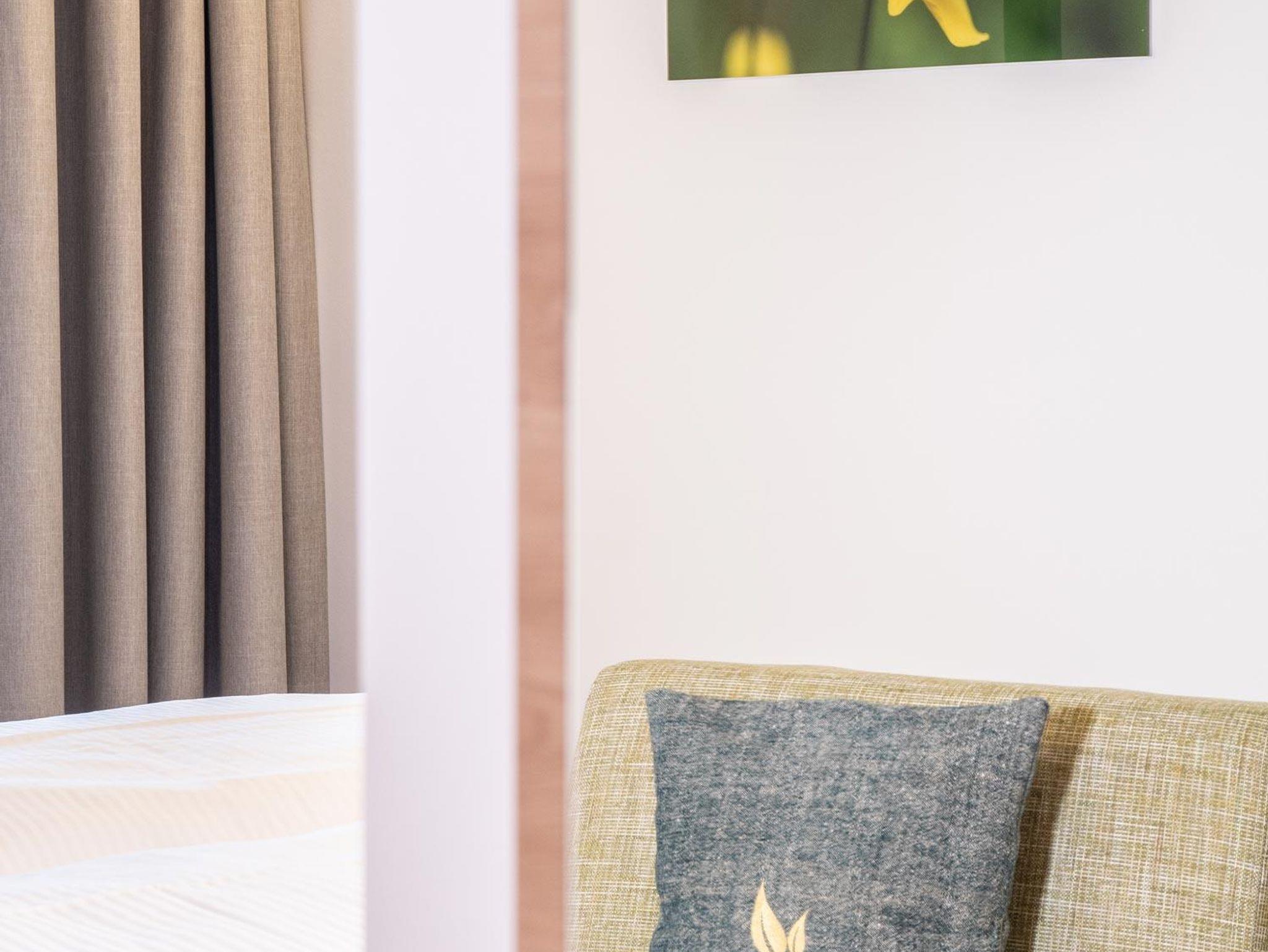 Die Trollblume Chalets bieten einen großzügig geschnittenen Wohn-Schlafraum für unbeschwerte Urlaubstage. Das zeitlose Design und das gesunde Raumklima sorgen für ein luftiges Wohngefühl. Vom Balkon aus führt der Blick in Richtung Riezler Alp und Fellhorngrat.