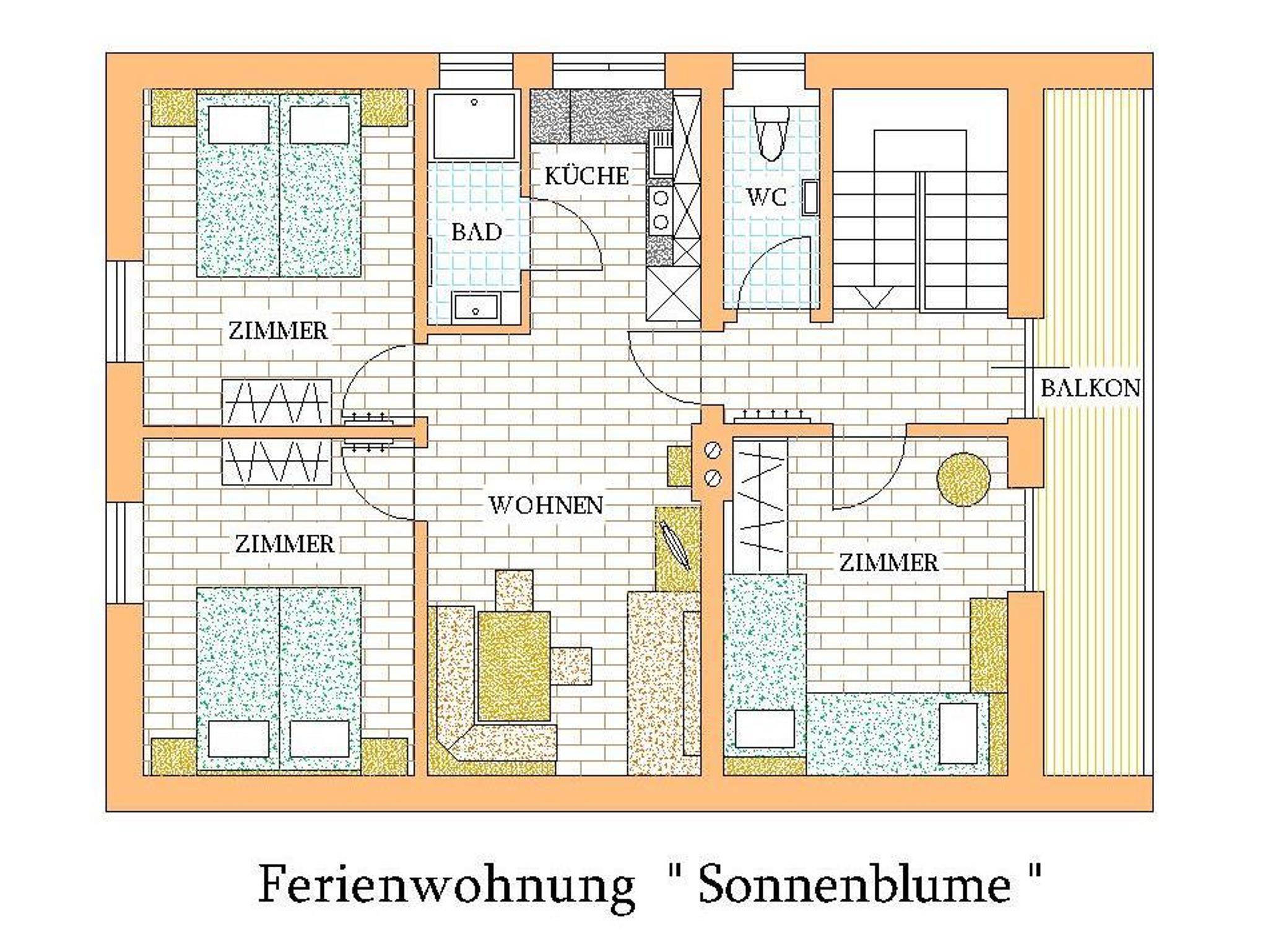 Unsere Ferienwohnung SONNENBLUME ist eine gemütliche und geräumige Mansardenwohnung mit 78 m². Sie ist komplett eingerichtet und hat eine große Wohnküche mit Sitzecke, Couch und Satelliten TV. Für den Schlaf unserer Gäste stehen zwei gleichwertig große Doppelzimmer und ein Zweibettzimmer (eventuell mit Zustellbett) zur Verfügung. Die Wohnung hat zudem einen Vorraum, das Badezimmer hat eine Dusche und das WC ist in einem eigenen Raum.