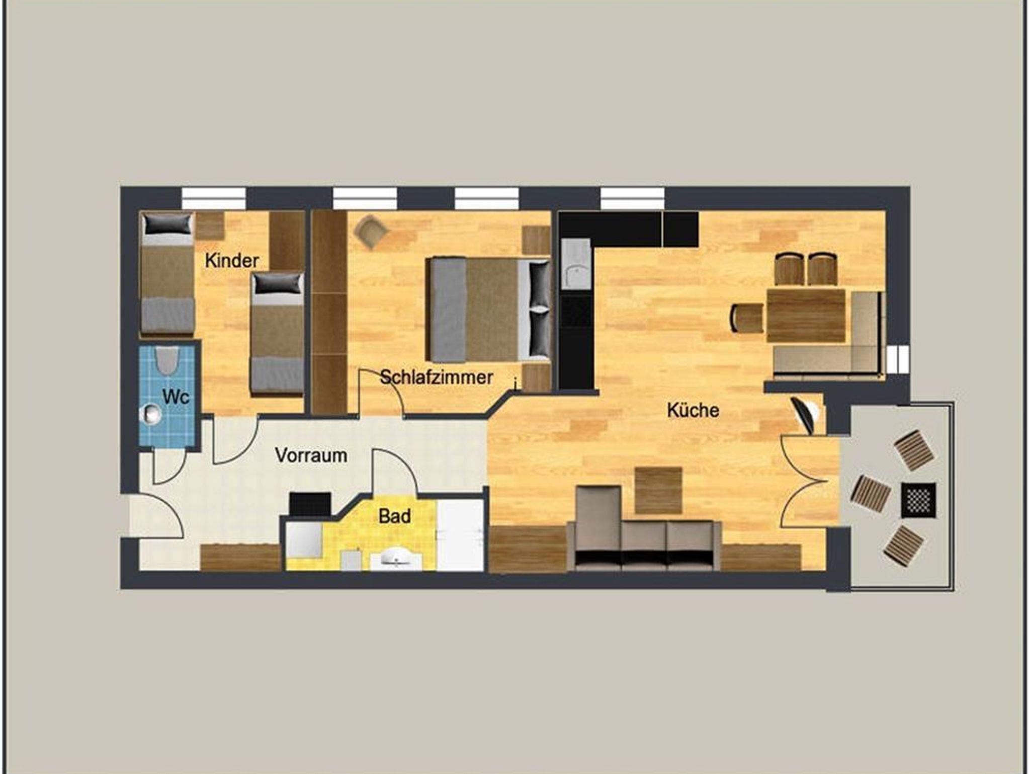 Schöne, helle Ferienwohnung für 1-5 Personen mit 70m². Geräumiger Wohn- und Essbereich mit großem Balkon. Die Küche ist mit Geschirrspüler ausgestattet. Dusche und WC getrennt. Ein Doppelbettzimmer, ein Kinderzimmer mit 2 Einzelbetten und eine ausziehbare Couch im Wohnbereich. Die Fewo liegt im 2. Stock des Hauses.
