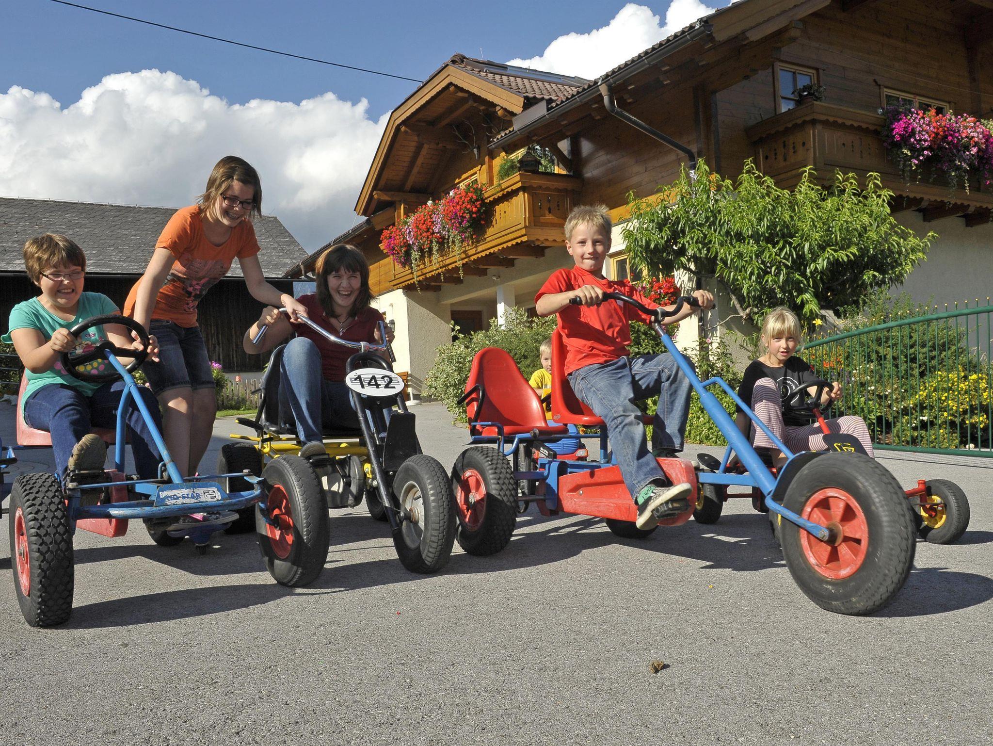 Auf unserem Hof dürfen Kinder noch Kinder sein. Ein riesengroßer Spielplatz, Gokarts und vieles mehr bieten viel Action.