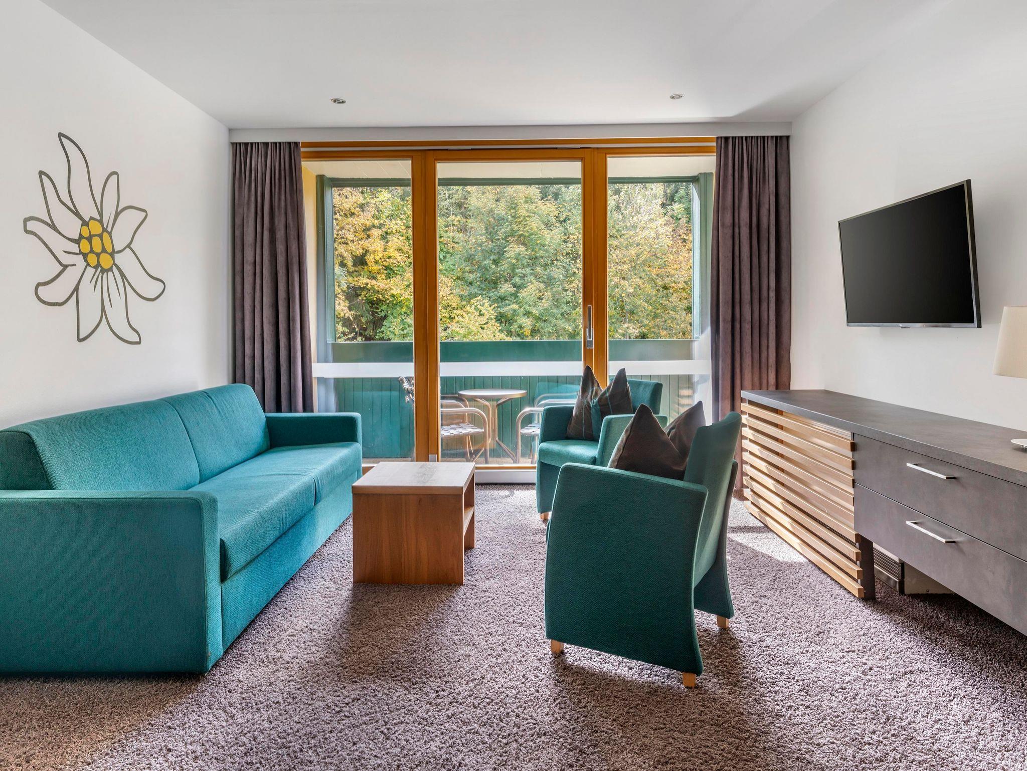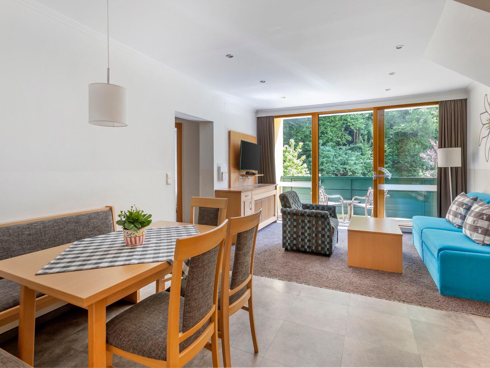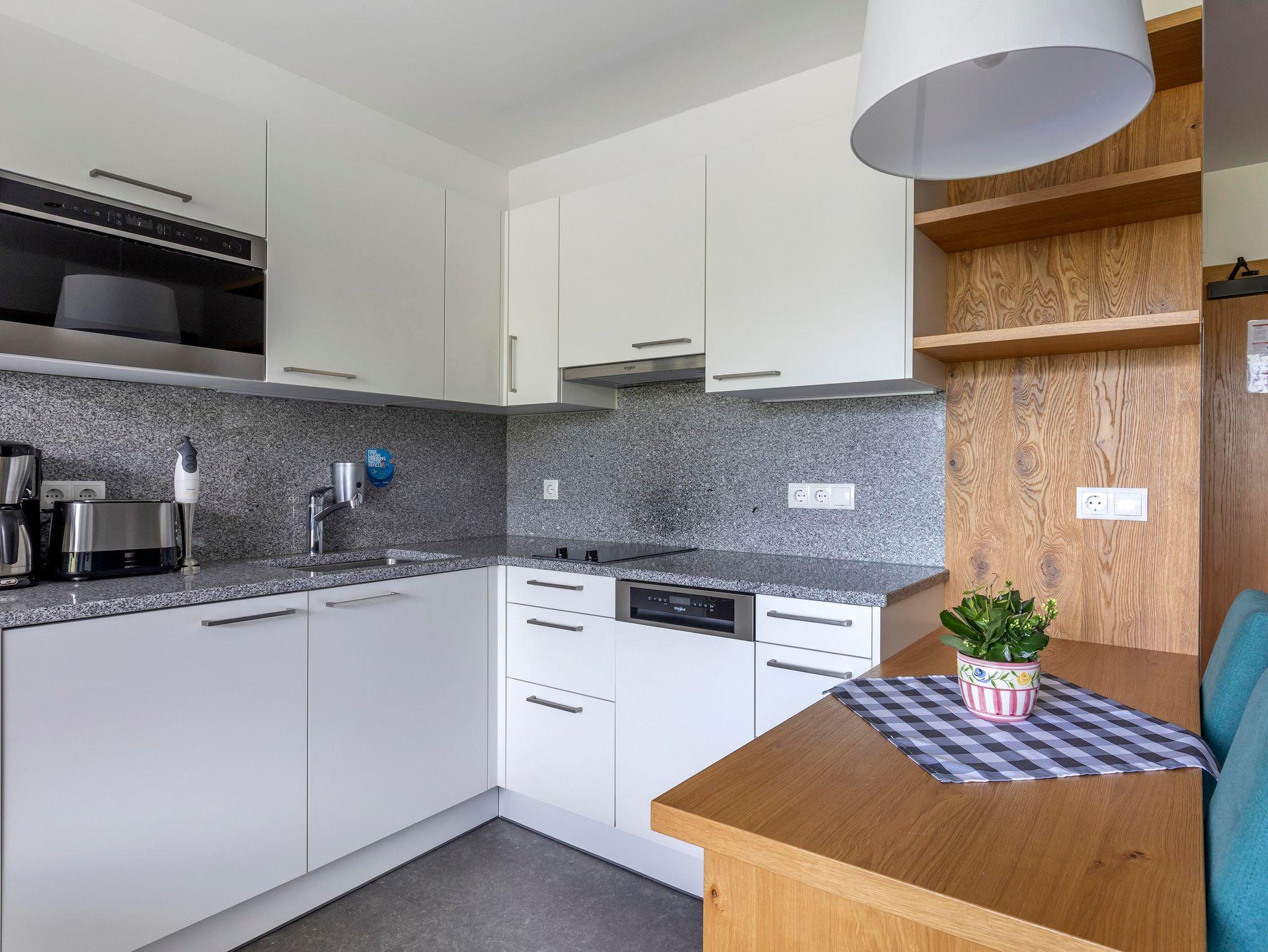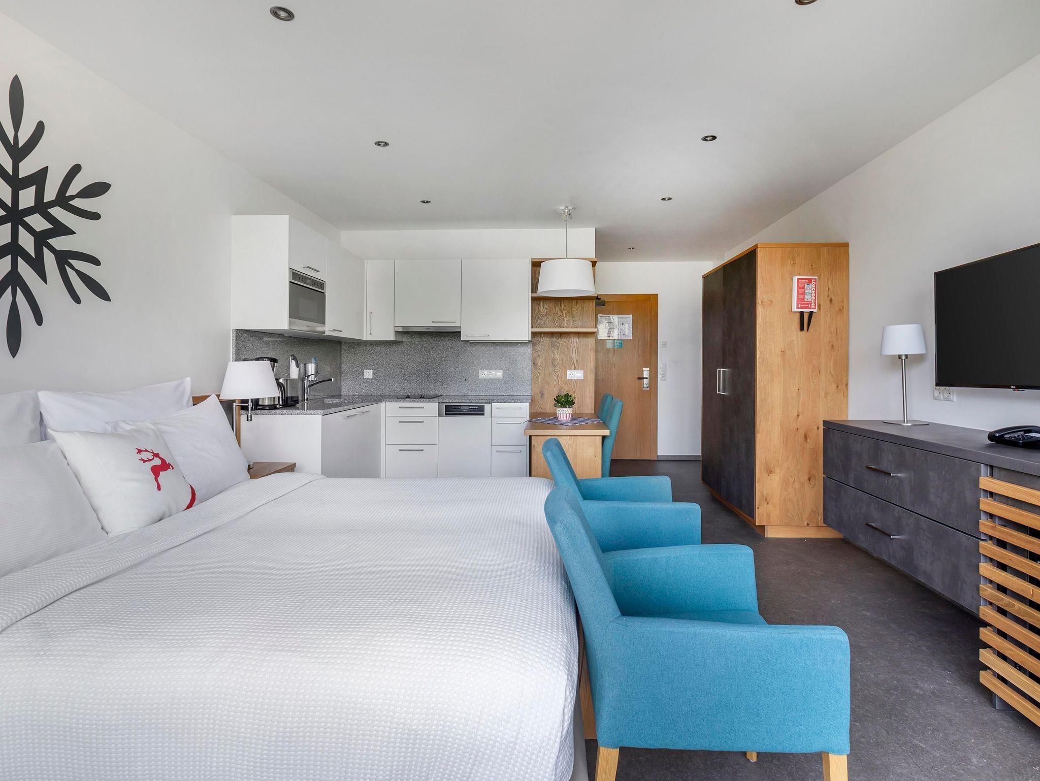 Jedes One bedroom Apartment verfügt über ein Schlafzimmer mit Doppelbett, das mit einer Topmatratze, luxuriöser Bettwäsche und Smart-TV ausgestattet ist, sowie einen offenen Wohnbereich mit Schlafsofa und Smart-TV. In der gut ausgestatteten Küche befinden sich ein Kochfeld, eine Mikrowelle, ein Toaster, Geschirrspüler, Wasserkoche, Kühlschrank, umfangreiche Kochutensilien und Reinigungsmittel. Jedes Appartement hat ein Badezimmer mit Badewanne oder Dusche, einen eigenen Balkon oder eine Terrasse und bietet einen herrlichen Blick auf die Berge oder den Wald.