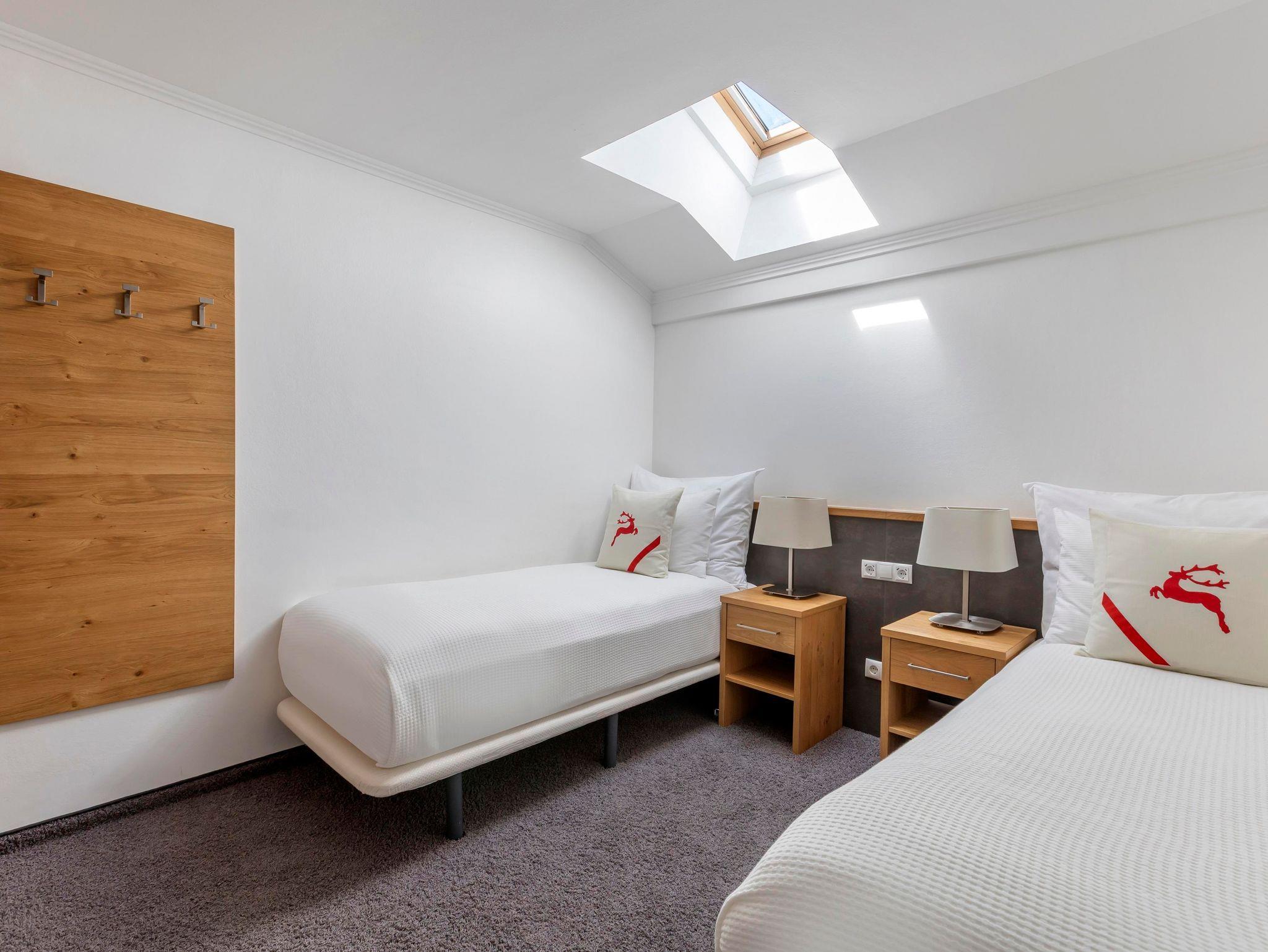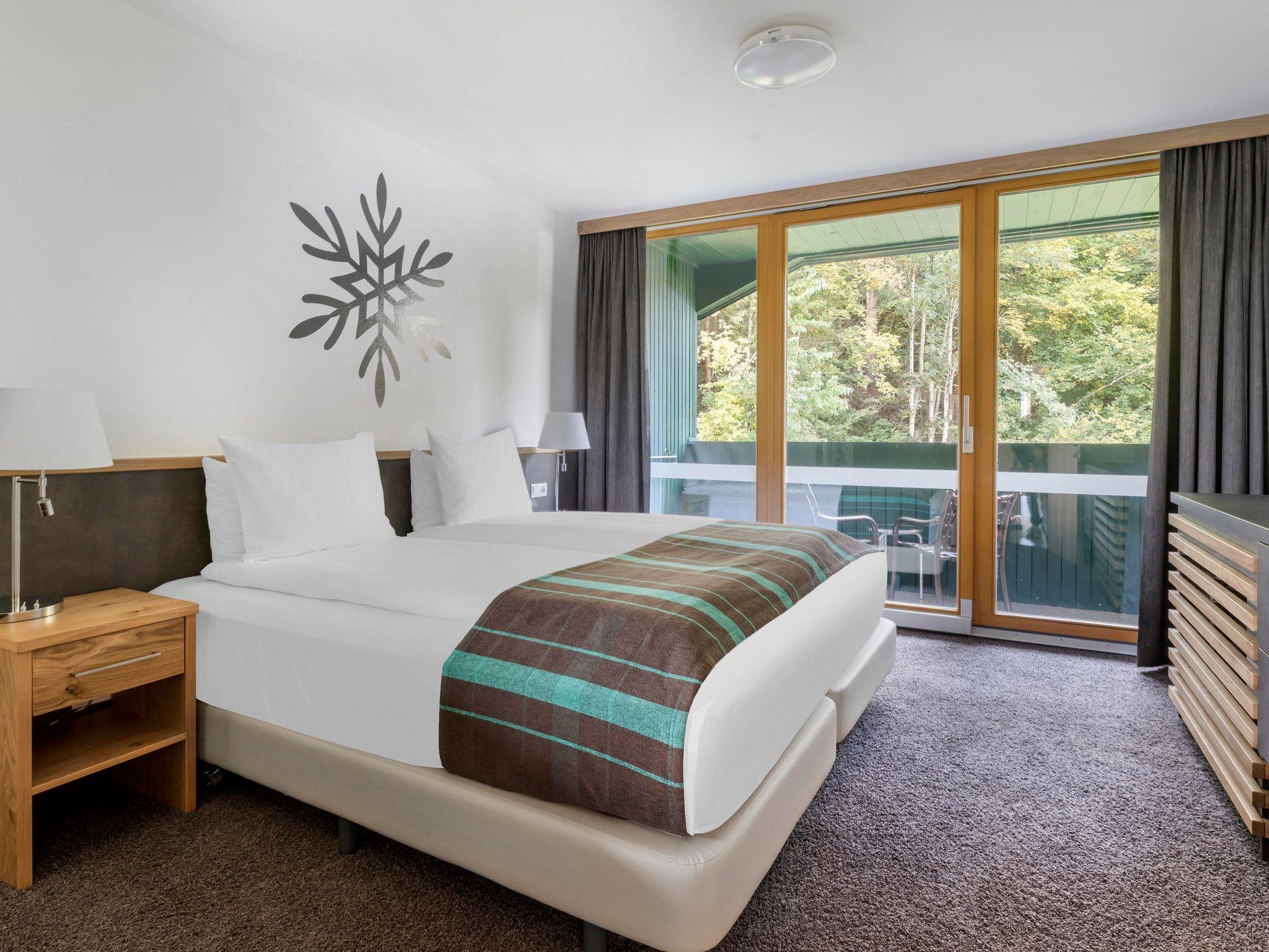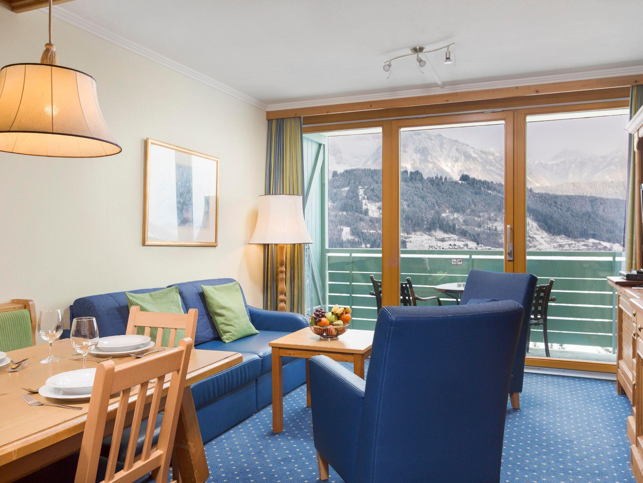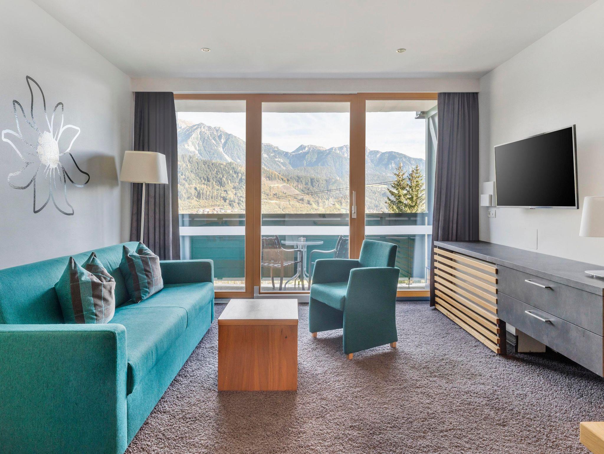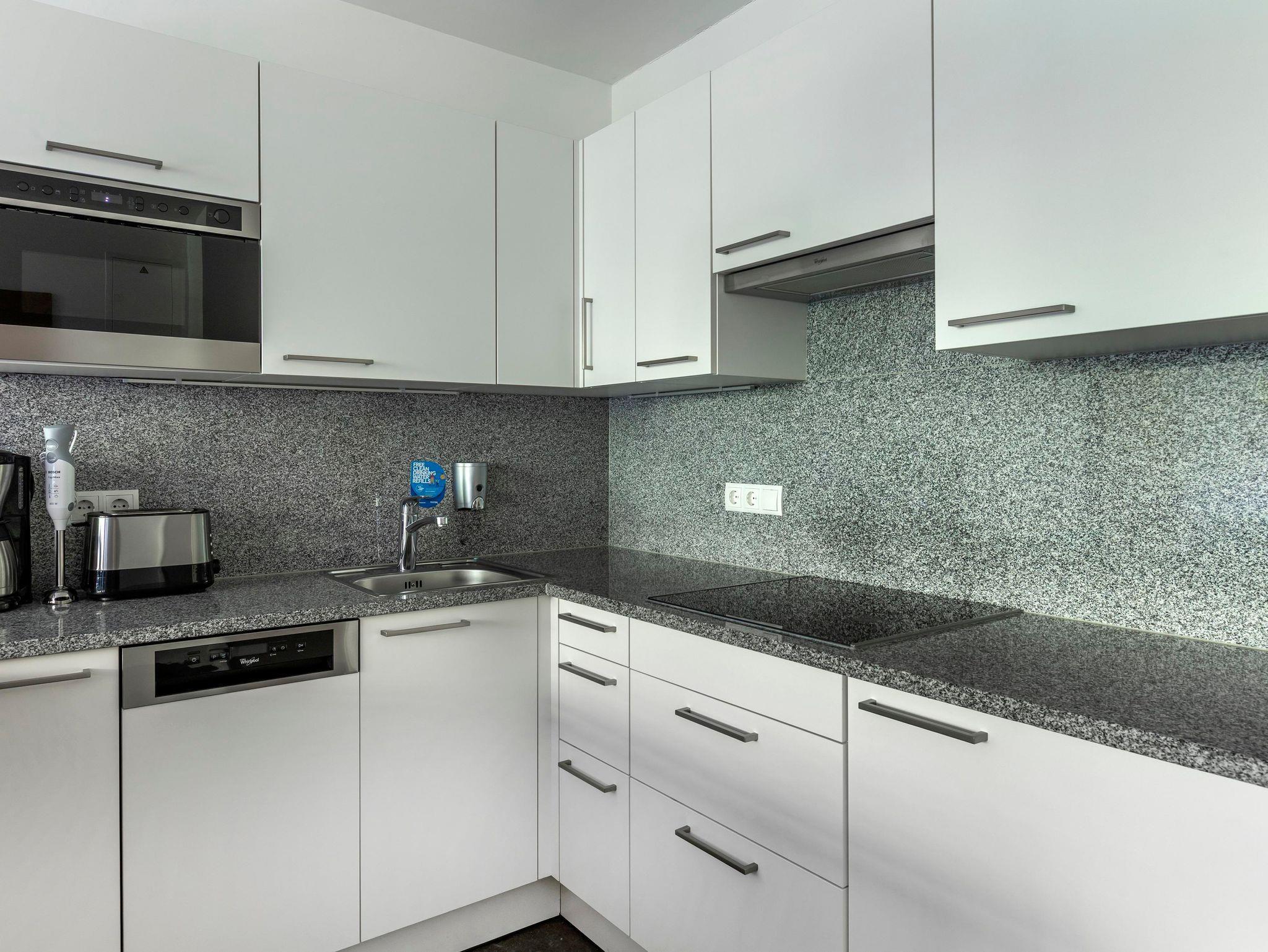 Jedes One bedroom Apartment verfügt über ein Schlafzimmer mit Doppelbett, das mit einer Topmatratze, luxuriöser Bettwäsche und Smart-TV ausgestattet ist, sowie einen offenen Wohnbereich mit Schlafsofa und Smart-TV. In der gut ausgestatteten Küche befinden sich ein Kochfeld, eine Mikrowelle, ein Toaster, Geschirrspüler, Wasserkoche, Kühlschrank, umfangreiche Kochutensilien und Reinigungsmittel. Jedes Appartement hat ein Badezimmer mit Badewanne oder Dusche, einen eigenen Balkon oder eine Terrasse und bietet einen herrlichen Blick auf die Berge oder den Wald.