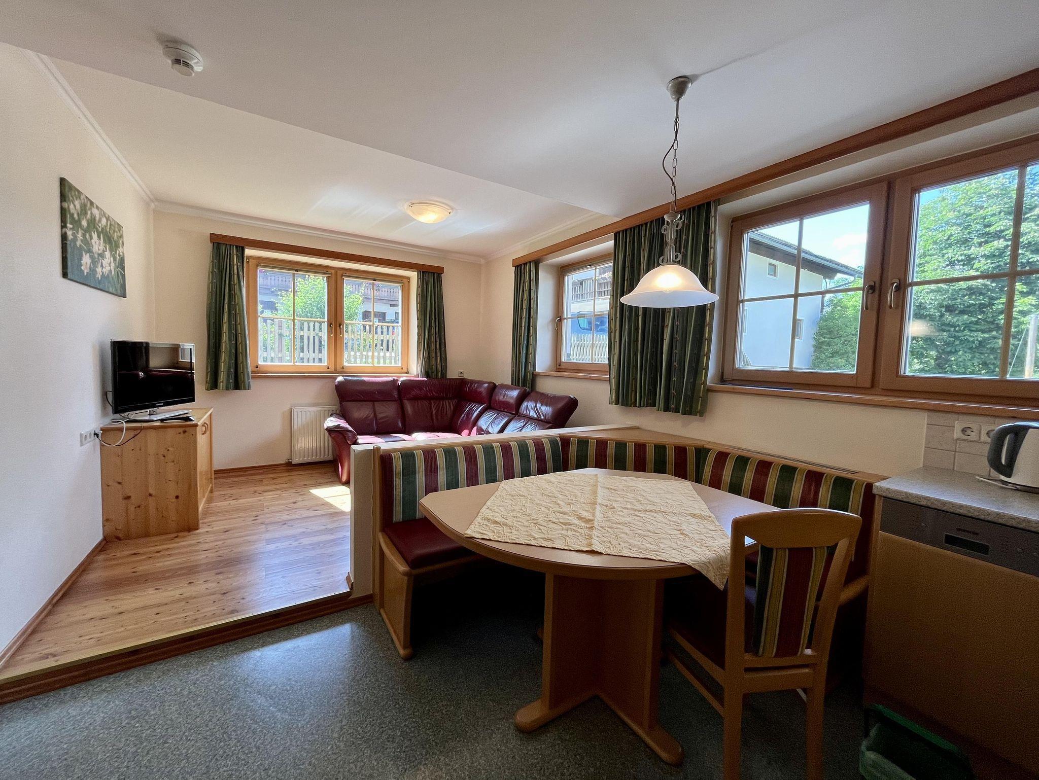 Die Feriewohnung Reiteralm ist im Erdgeschoß, eine Wohnküche mit Sofaecke.