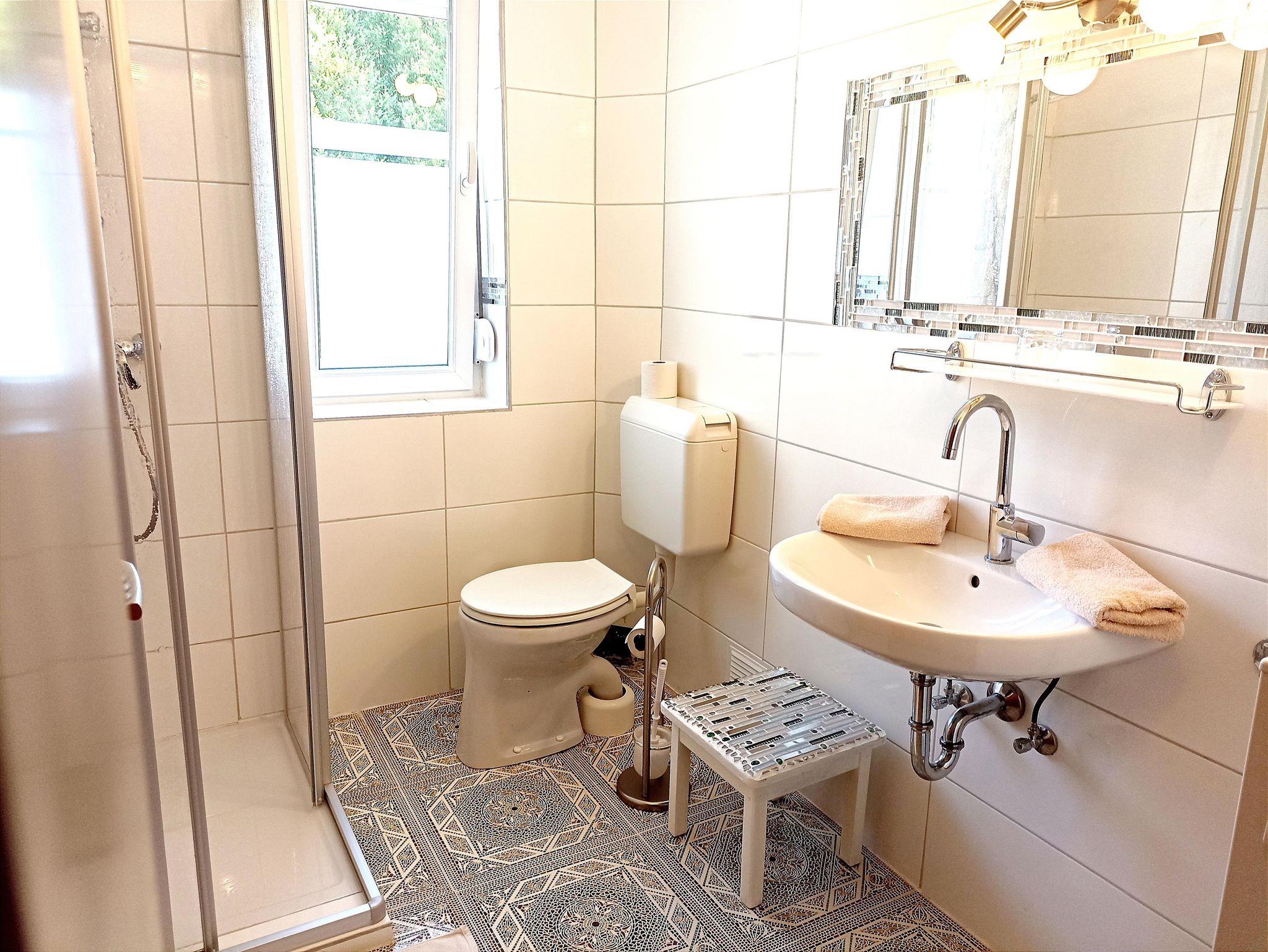 Im Badraum befindet sich eine Dusche, ein Waschbecken, darober großer Spiegel, Ablage, Etagiere, Wasserglas, Beleuchtung, Toilette