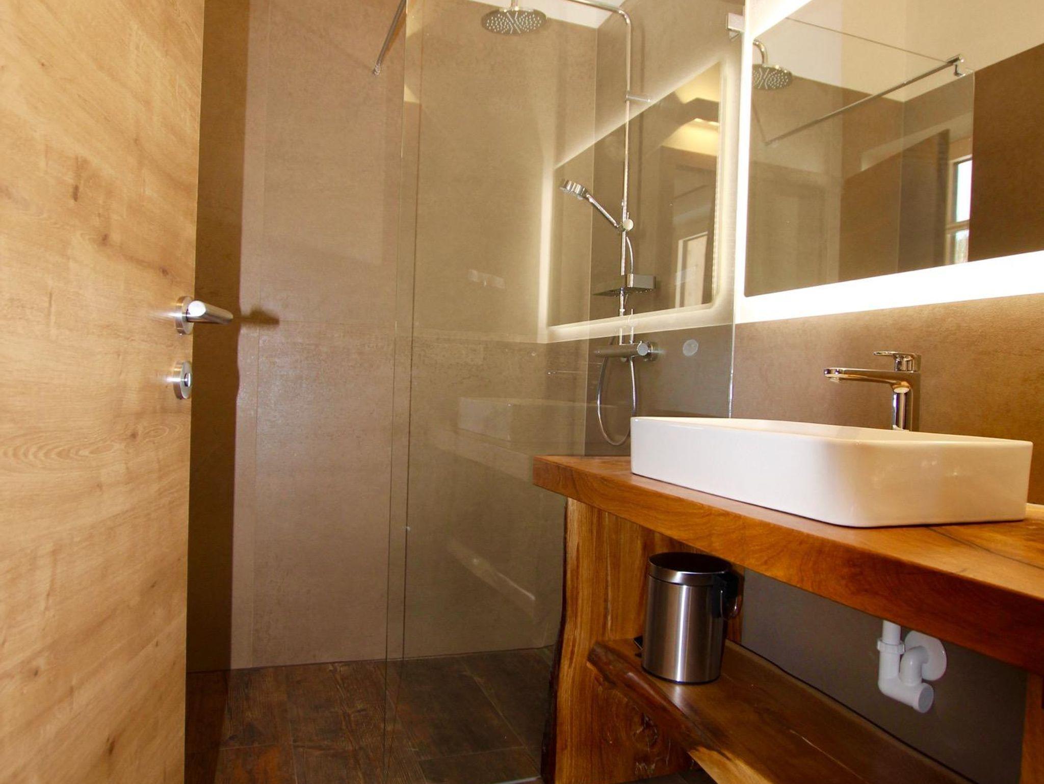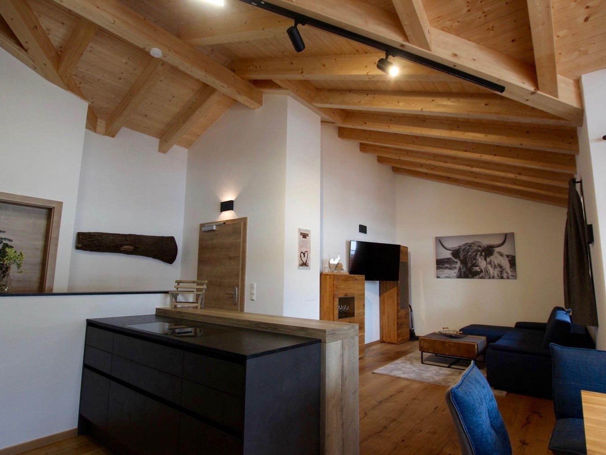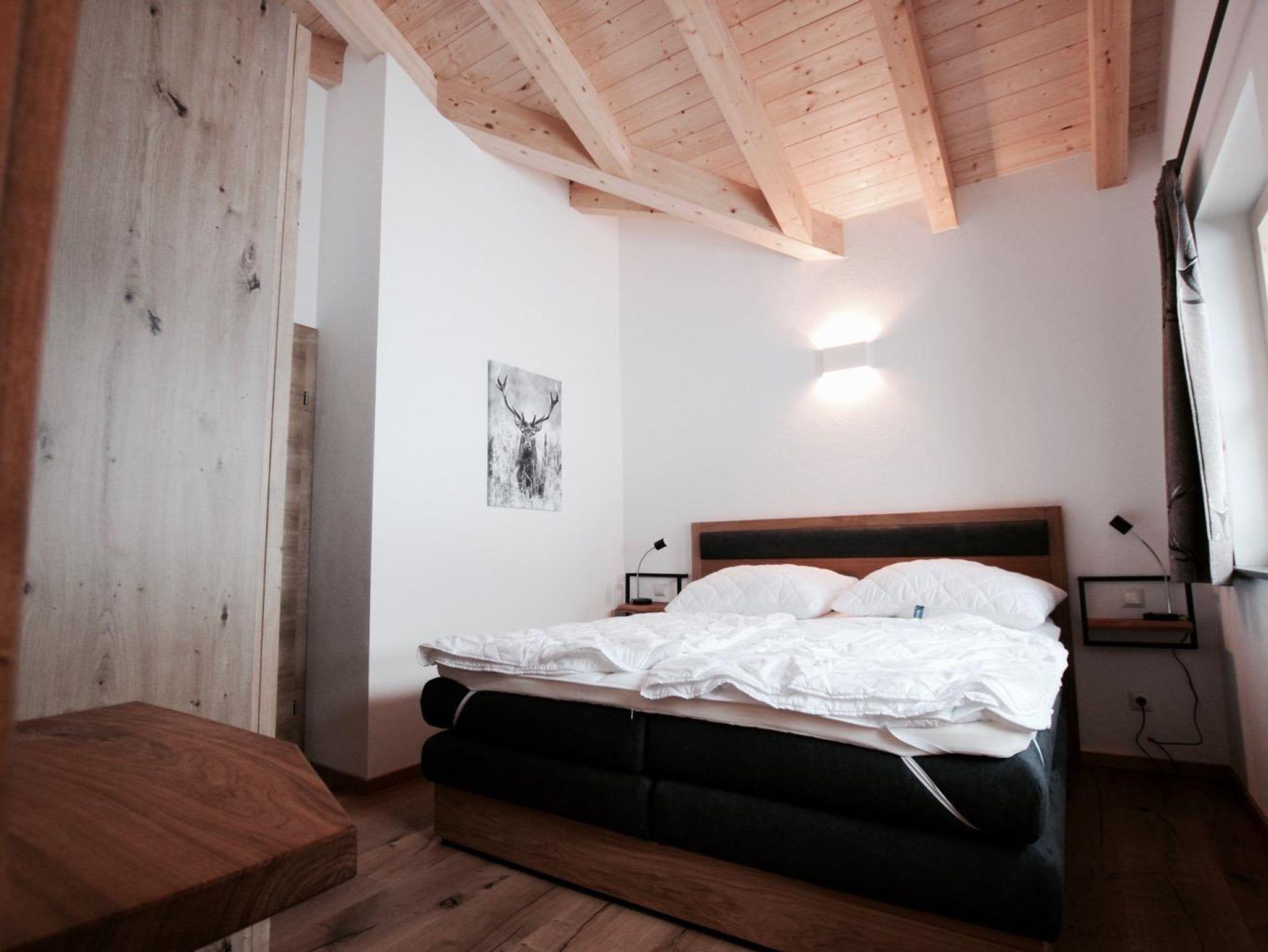 Die beiden Suiten im OG (AO und BO) hingegen überzeugen mit ihrer großzügigen Raumaufteilung, dem Sichtdachstuhl und den schönen Terrassen mit Bergblick und reiner Südlage. Diese Suiten sind noch etwas hochwertiger ausgestattet als die beiden im EG.