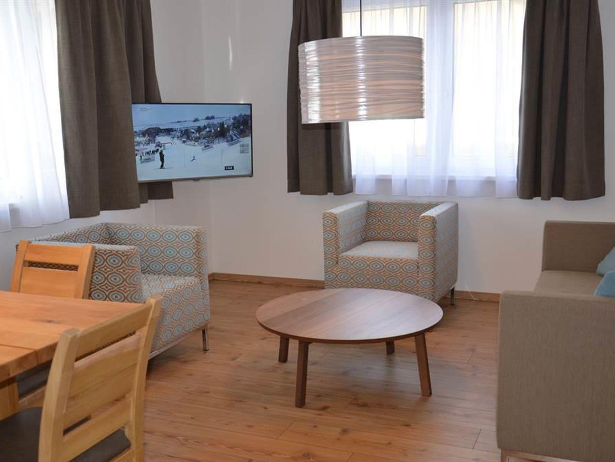 Ein gemütliches Apartment vom 65 m2 mit Balkon, sehr geeignet für eine Familie mit 2 oder 3 Kindern oder für 4 bis 5 Erwachsenen. Das Apartment befindet sich auf dem 1. Stock und verfügt über eine gute Aussicht auf die Berge und das Dorf. Das gemeinschaftliche Wohnzimmer hat eine reich ausgestattete offene Küche mit einem großen Esstisch um gemütlich mit einander zu speisen. Es gibt ein Elternschlafzimmer und ein Schlafzimmer mit einem Einzelbett und einem Stapelbett, 1 Badezimmer und 1 getrennte Toilette. Bettwäsche und Handtücher sind vorhanden. Im Haus gibt eine erwärmten Skikeller und für die Mieter dieses Apartments ist 1 Parkplätze auf dem eigenen Gelände reserviert.