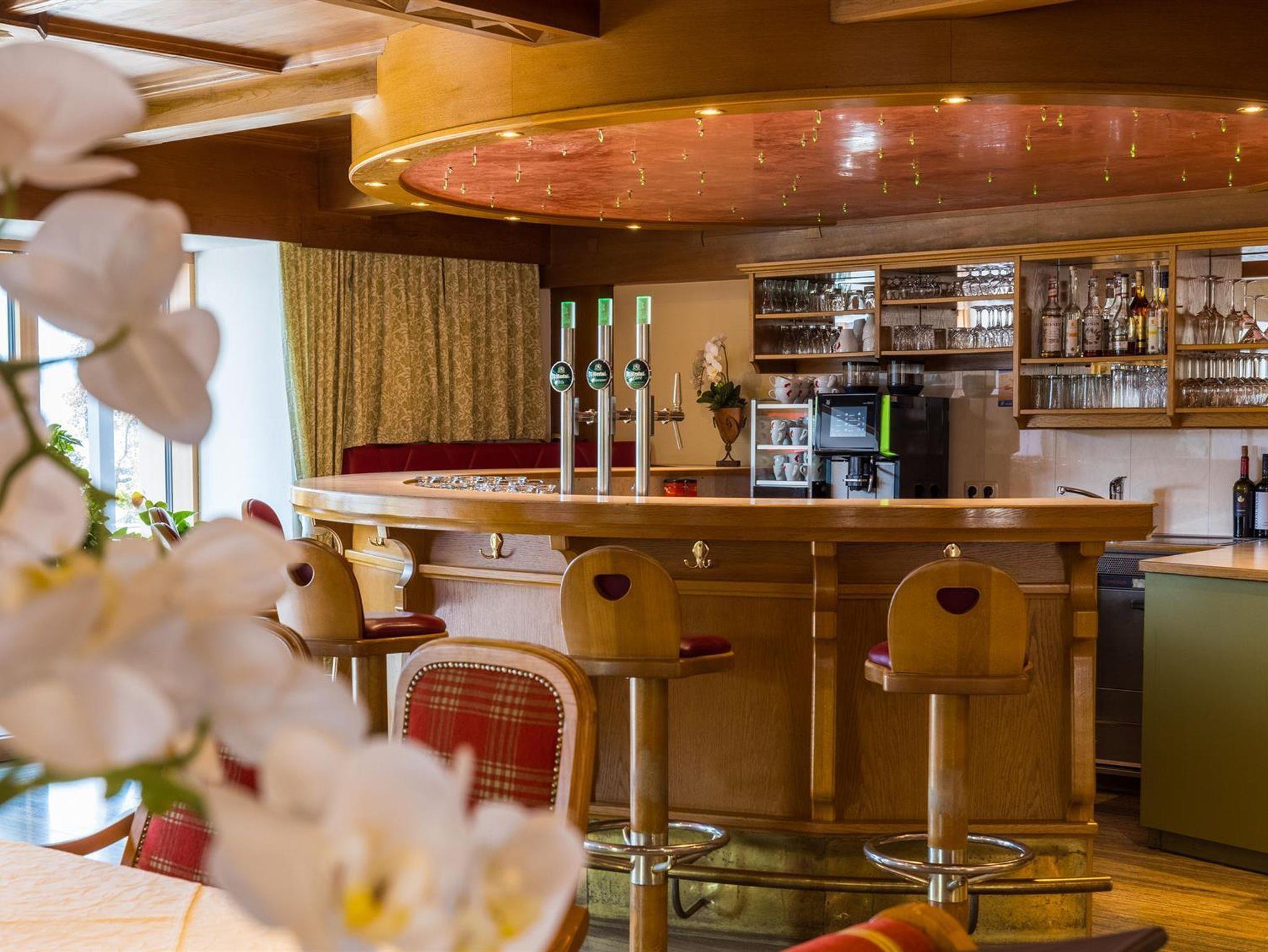 Die Hotelbar ist ein beliebter Treffpunkt bei Gästen und Einheimischen, ebenso in den Sommermonaten die Terrasse mit wunderbarem Blick auf die Tiroler Bergwelt.