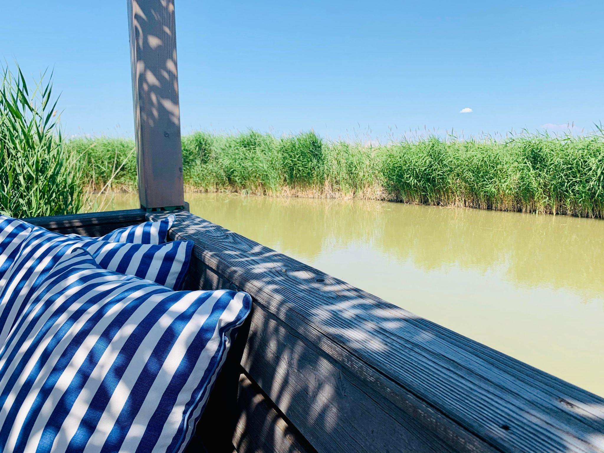 Vor der Hütte gibt es einen großzügigen Schwimmbereich, wobei der gesamte See nicht sehr tief ist. Ein großes Sonnendeck mit gepolsterten Auflagen lädt zum Sonnenbaden und Entspannen ein. Neben dem großen Esstisch in der Hütte haben Sie auch Draußen auf der Terrasse, unter einem schattigen Segel, eine Eckbank mit Esstisch direkt über dem Wasser. Die Hütte liegt mitten im Naturschutzgebiet und ist von Wasser und Schilf umgeben. Der Neusiedler See und die Ruster Altstadt gehören zum UNESCO Weltkulturerbe. Damit misst die UNESCO der Kulturlandschaft Neusiedler See einen außergewöhnlichen Wert für die gesamte Menschheit bei.