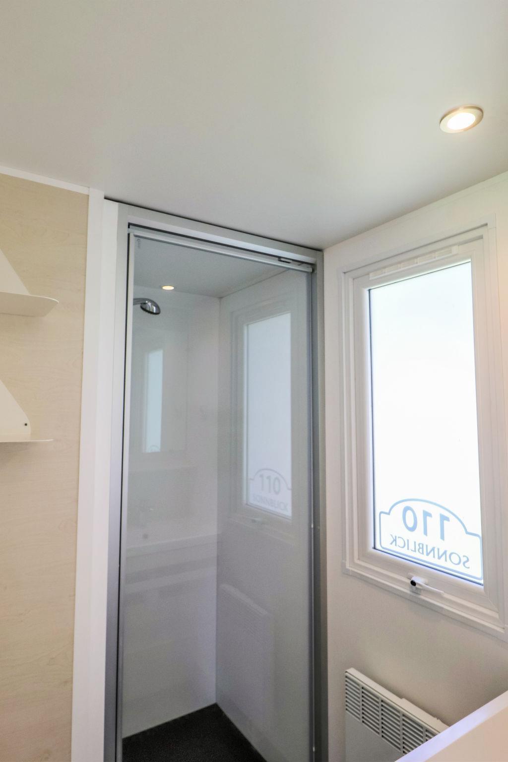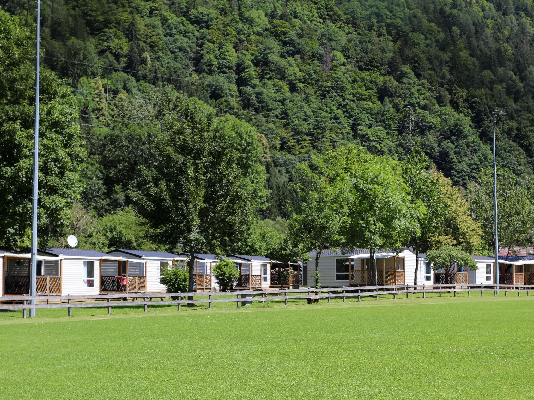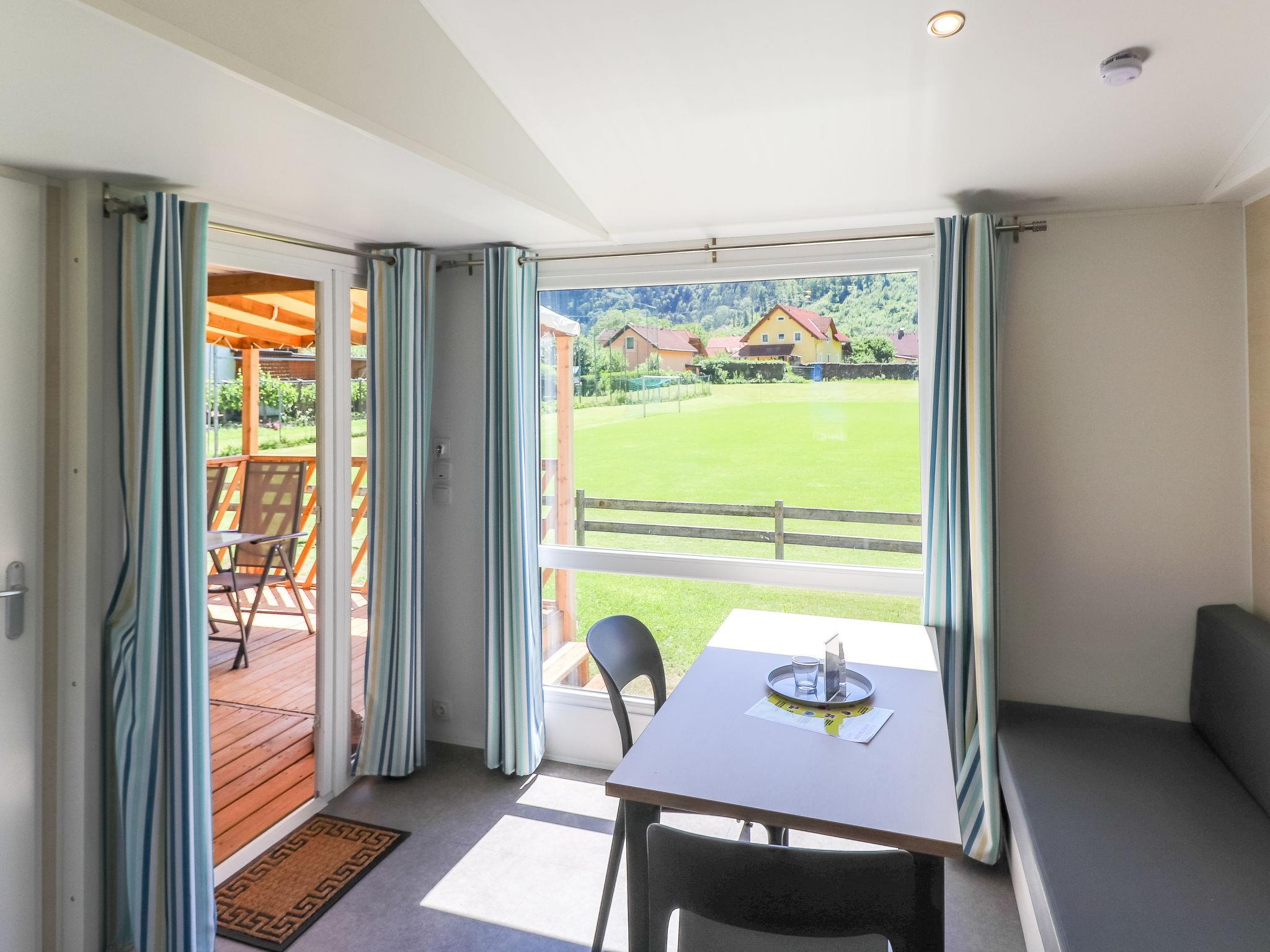 3-room mobile home 24 m2. Object suitable for 4 adults. Comfortable and modern furnishings: 1 double bedroom with 1 french bed (160 cm, length 200 cm). 1 room with 2 beds (80 cm, length 200 cm). Kitchen-/living room (4 induction hot plates, microwave, electric coffee machine, raclette grill) with 1 sleeping facility (130 cm, length 190 cm), dining table, satellite TV and air conditioning. Exit to the terrace. Shower, sep. WC. Electric heating, air-conditioning. Terrace 9 m2, roofed. Terrace furniture, electric barbecue (portable), deck chairs. View of the mountains and the countryside. Facilities: Internet (WiFi, free). Please note: non-smokers only. Private mooring (extra). Maximum 1 pet/ dog allowed. Smoke alarm. When there are less than the maximum number of guests staying at the property, not all of the housing units will be available for use.