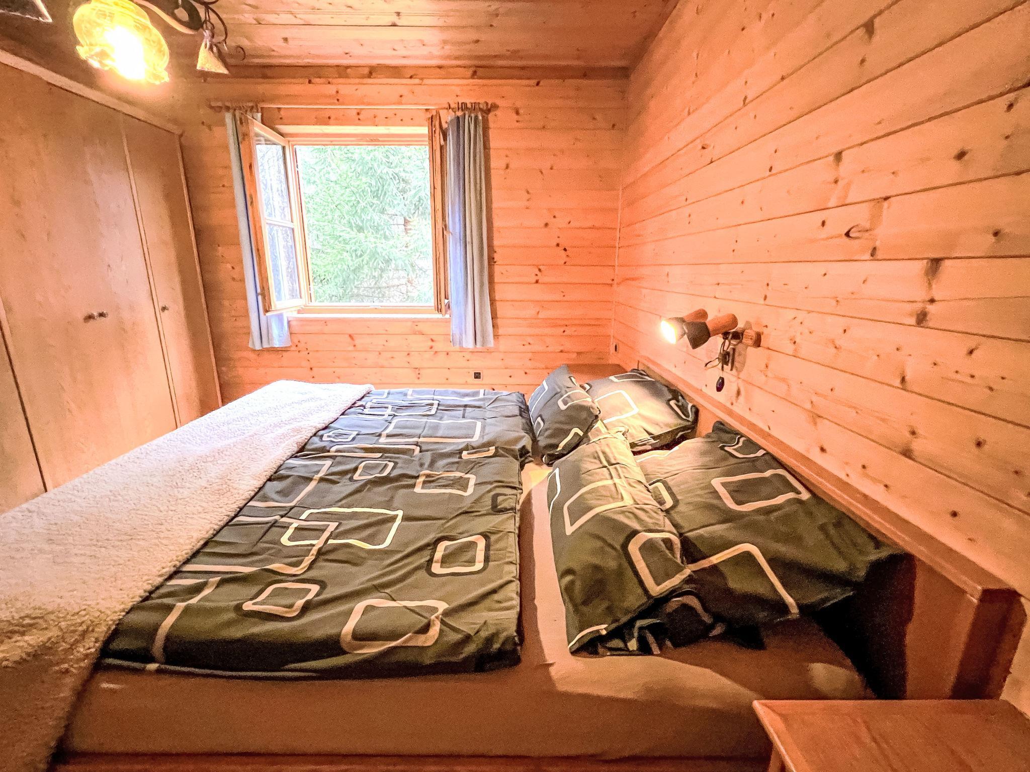 2-room chalet 65 m2. Comfortable and wooden furniture furnishings: entrance hall. Living/dining room with 1 double sofabed (160 cm, length 200 cm), dining nook, radio and tiled stove. Exit to the garden, to the terrace. 1 double bedroom with electric heating. Kitchen (oven, dishwasher, 4 ceramic glass hob hotplates, electric coffee machine) with dining nook. Bathroom, sep. WC. Electric heating. Wooden floors. Terrace. Terrace furniture, barbecue, deck chairs. Very beautiful view of the garden and the countryside. Facilities: hair dryer, logs (free). Internet (WiFi). Please note: non-smokers only. 1 pet/ dog allowed. Heating: tiled stove and 2 mobile electric heaters.