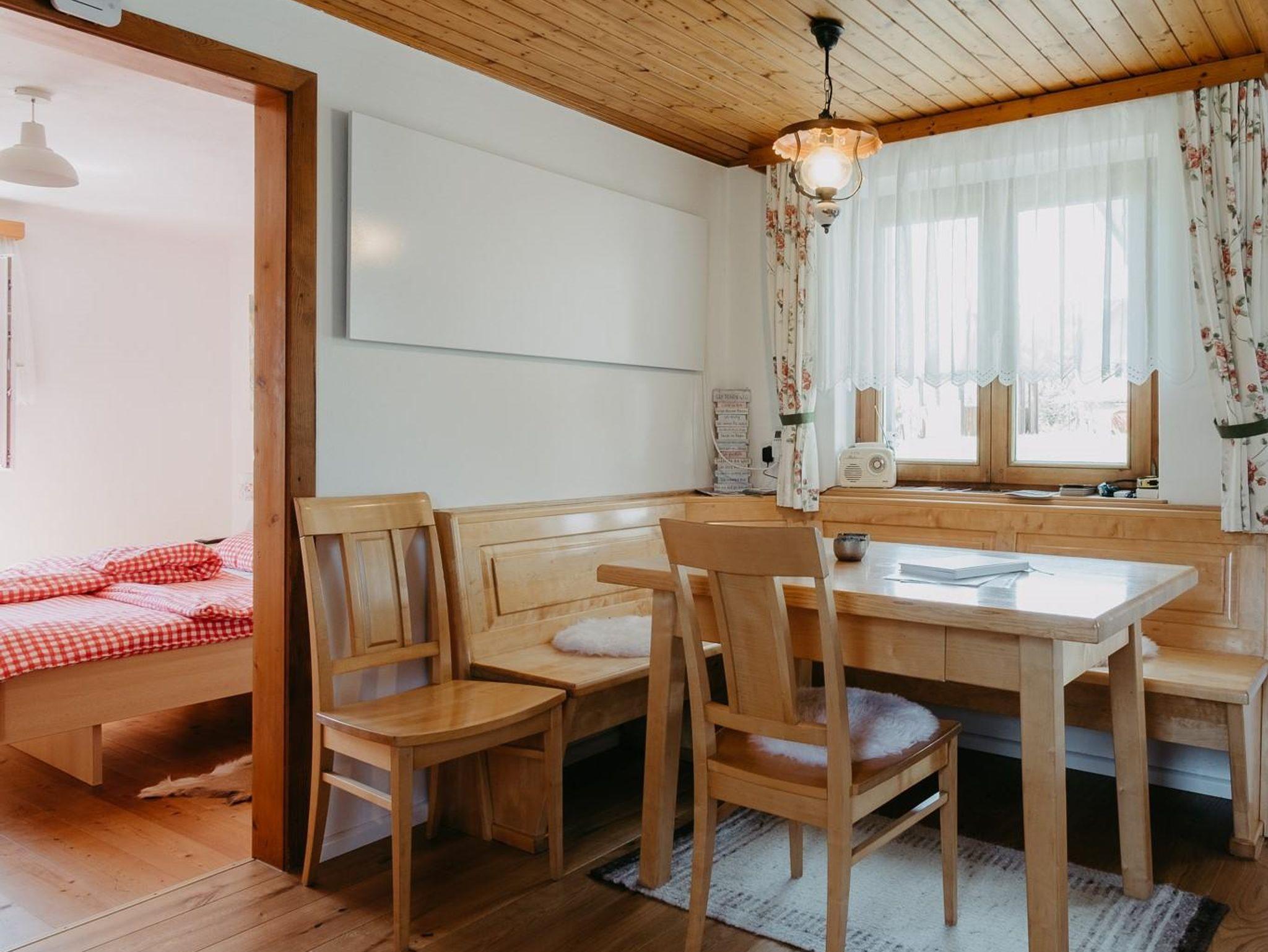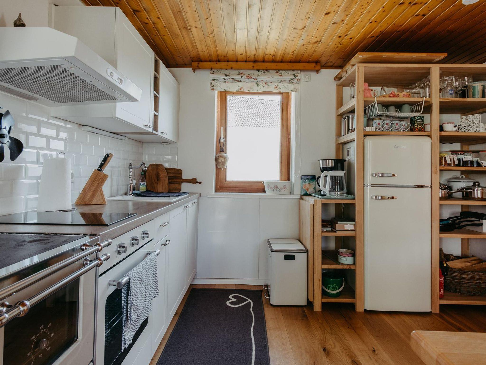 Im geräumigen Wohn-Essbereich bietet eine voll ausgestattete Küche jeglichen Komfort und Infrarotpanelen und ein romantische Küchenofen sorgen auch im Winter für wohlige Wärme.