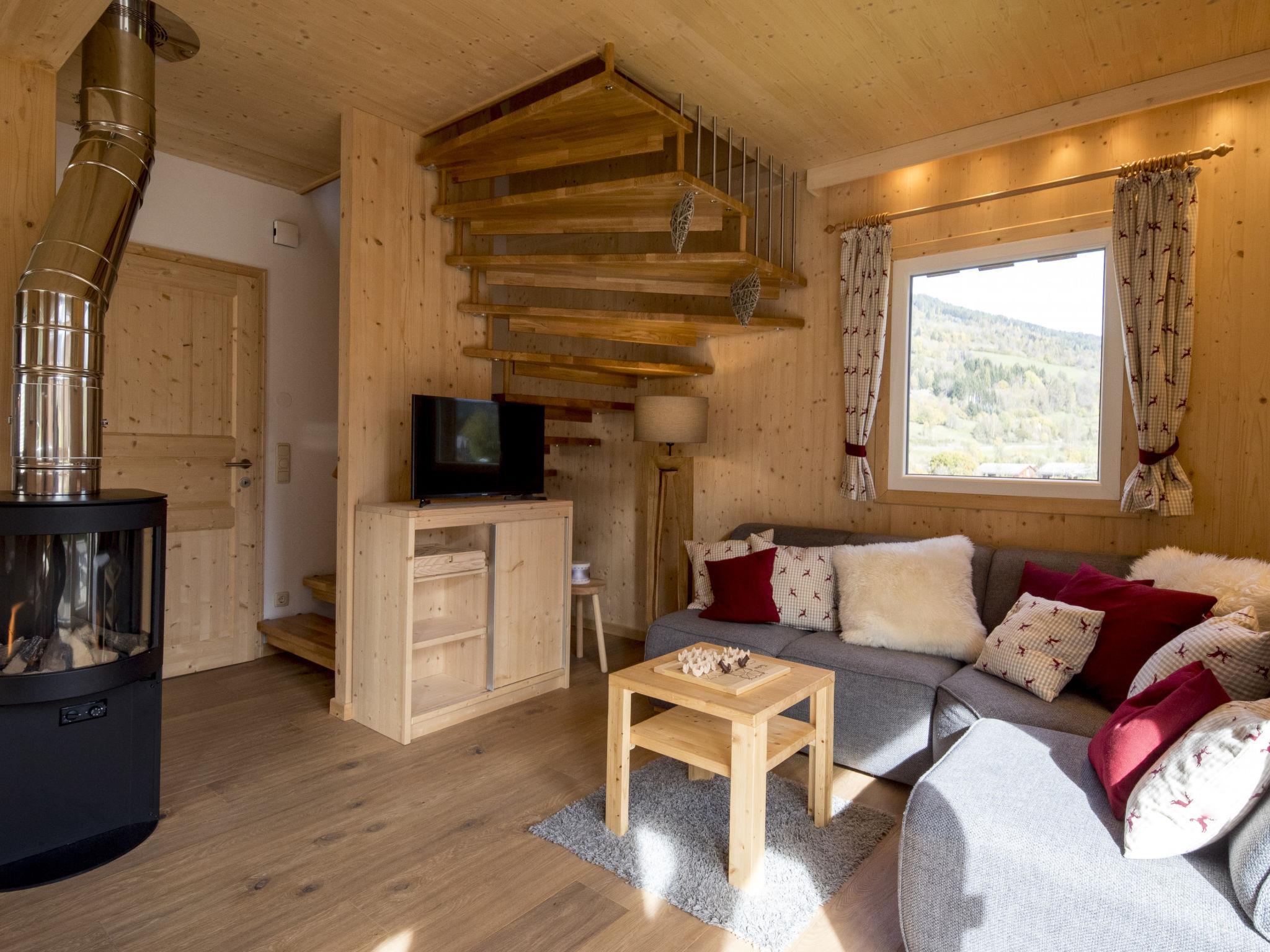 "Chalet mit 2 Schlafzimmern & IR-Sauna", 3-room chalet 70 m2 on 2 levels. Bright, comfortable and wooden furniture furnishings: entrance hall. Living/dining room with dining table and satellite TV (flat screen). 2 double bedrooms. Open kitchen (oven, dishwasher, 4 ceramic glass hob hotplates, microwave, electric coffee machine). Shower/WC, hydro massage shower, Sauna. Balcony, terrace. Very beautiful view of the mountains, the ski run and the countryside. Facilities: Internet (WiFi, free). Please note: non-smoking house. Smoke alarm. The property is one of a type of property or apartment. The chalets are individually furnished. The equipment of the saunas can therefore differ between an infrared sauna and a Finnish sauna.