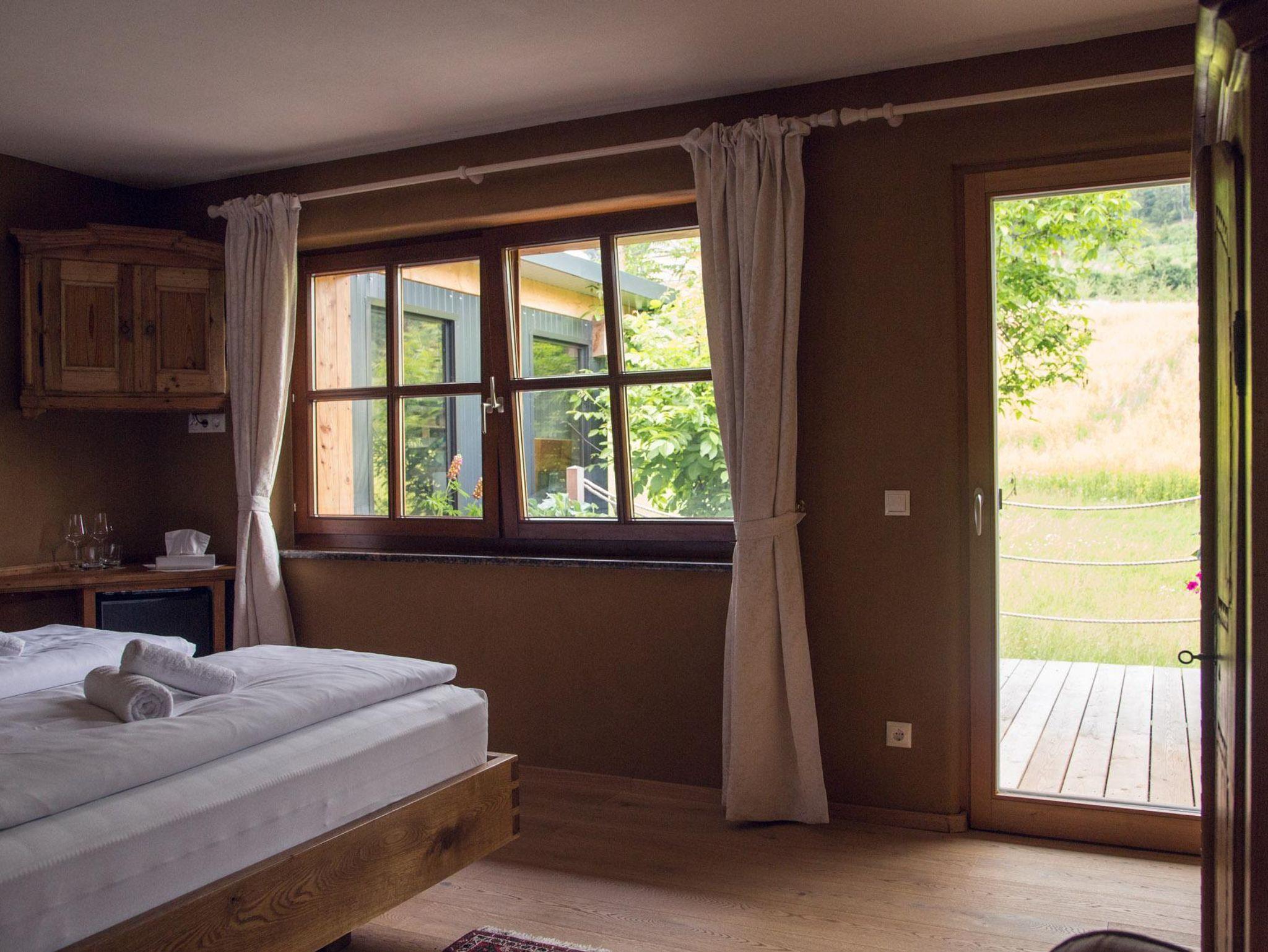 Gemütlichkeit und Raum, mit wunderbarem Blick über den Längsee. Vollholzmöbel, Lehmwände, feine Stoffe. Getrennter Schlaf- und Wohnbereich. Für alle mit dem Wunsch nach Raum und Weitblick.