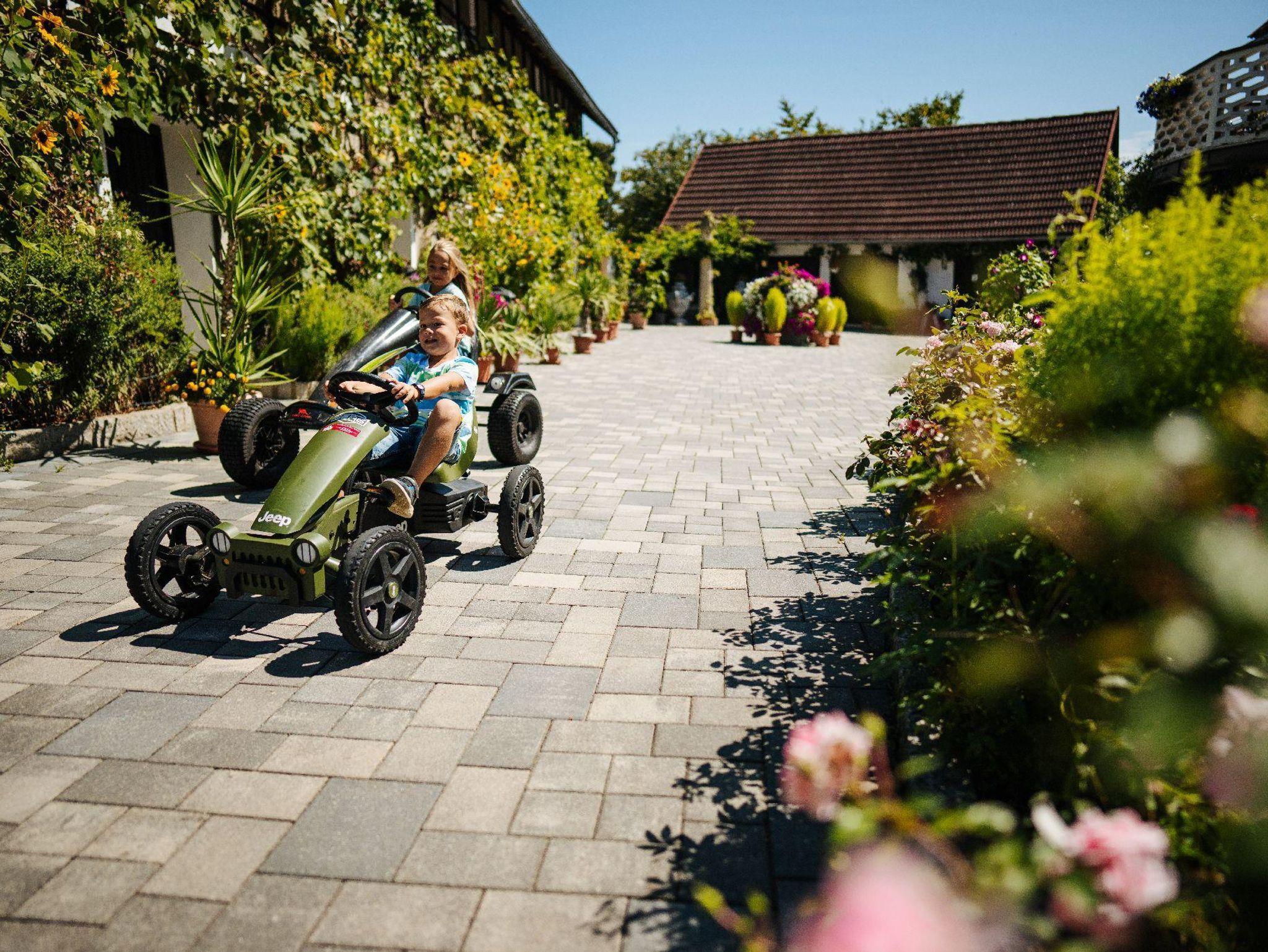 Genießen Sie auf unserem riesigen Hof-Areal die Ruhe, während sich die Kids bei den Streicheltieren oder am großen Spielplatz austoben.