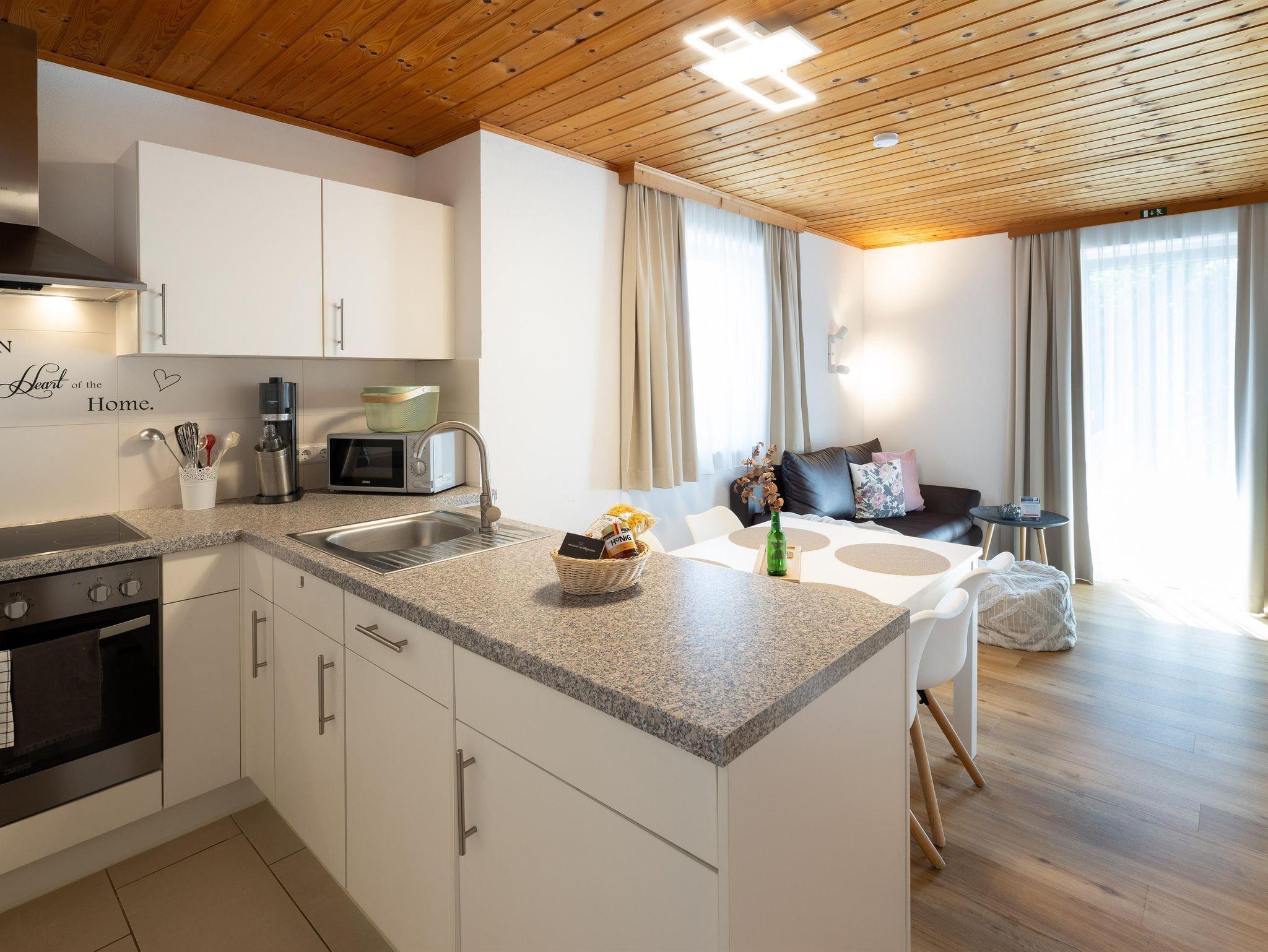 Die Wohnungen bestehen aus einem Vorraum, zwei Doppelzimmern, Dusche, sep. WC,Fön, Wohnzimmer (Schlafmöglichkeit für 1 Person), Esstisch, LCD-TV mit Musikkanal, Internet über W-LAN, komplett ausgestatteter Küche mit Mikrowelle, Geschirrspüler, Backofen, Kaffeemaschine uvm. sowie einem großen Balkon mit Terrassenmöbel. Bett- u. Tischwäsche, Geschirr- u. Handtücher werden bereitgestellt. Auf Wunsch Zustellbett (für 5. und 6. Person), Kinderbett (Gitterbett) und Hochstuhl. Waschservice gegen Gebühr im Haus.