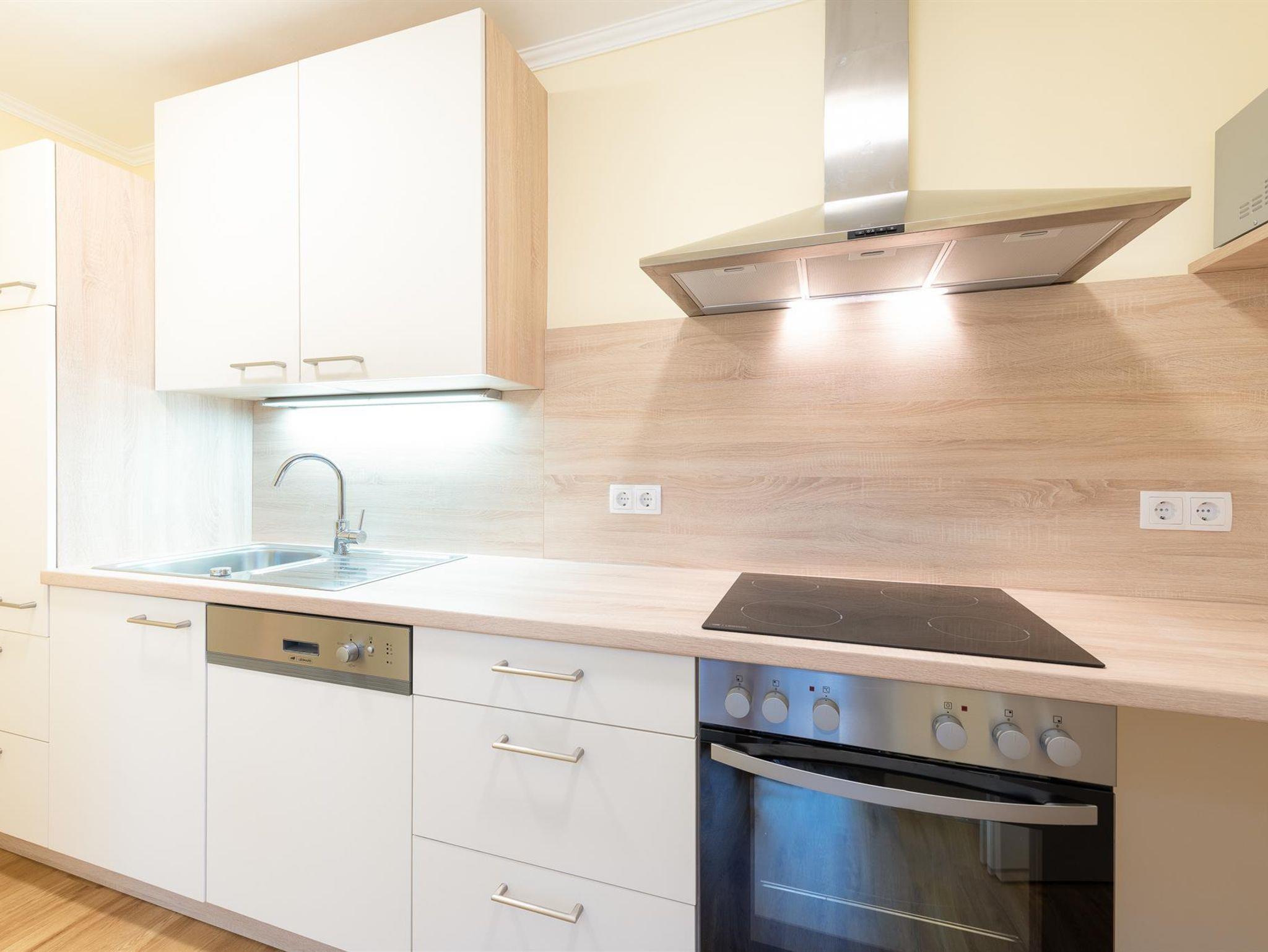 Die neue Küche ist komplett ausgestattet und besteht aus einem Geschirrspüler, Backofen, Herd, Mikrowelle, Kühlschrank, Besteck, Geschirr und einer Kaffeemaschine.