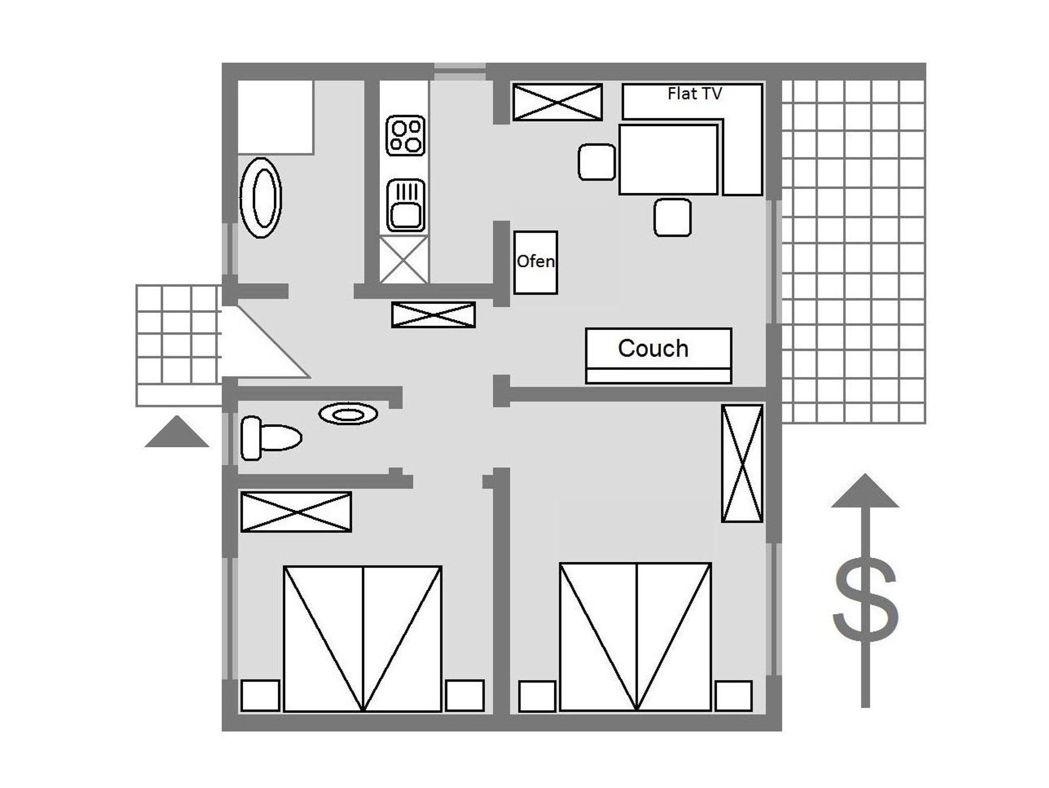 Es besteht aus zwei Doppelzimmern, Vorraum, Dusche, separatem WC, Wohnküche, 9m² Terrasse und einem Autounterstellplatz.