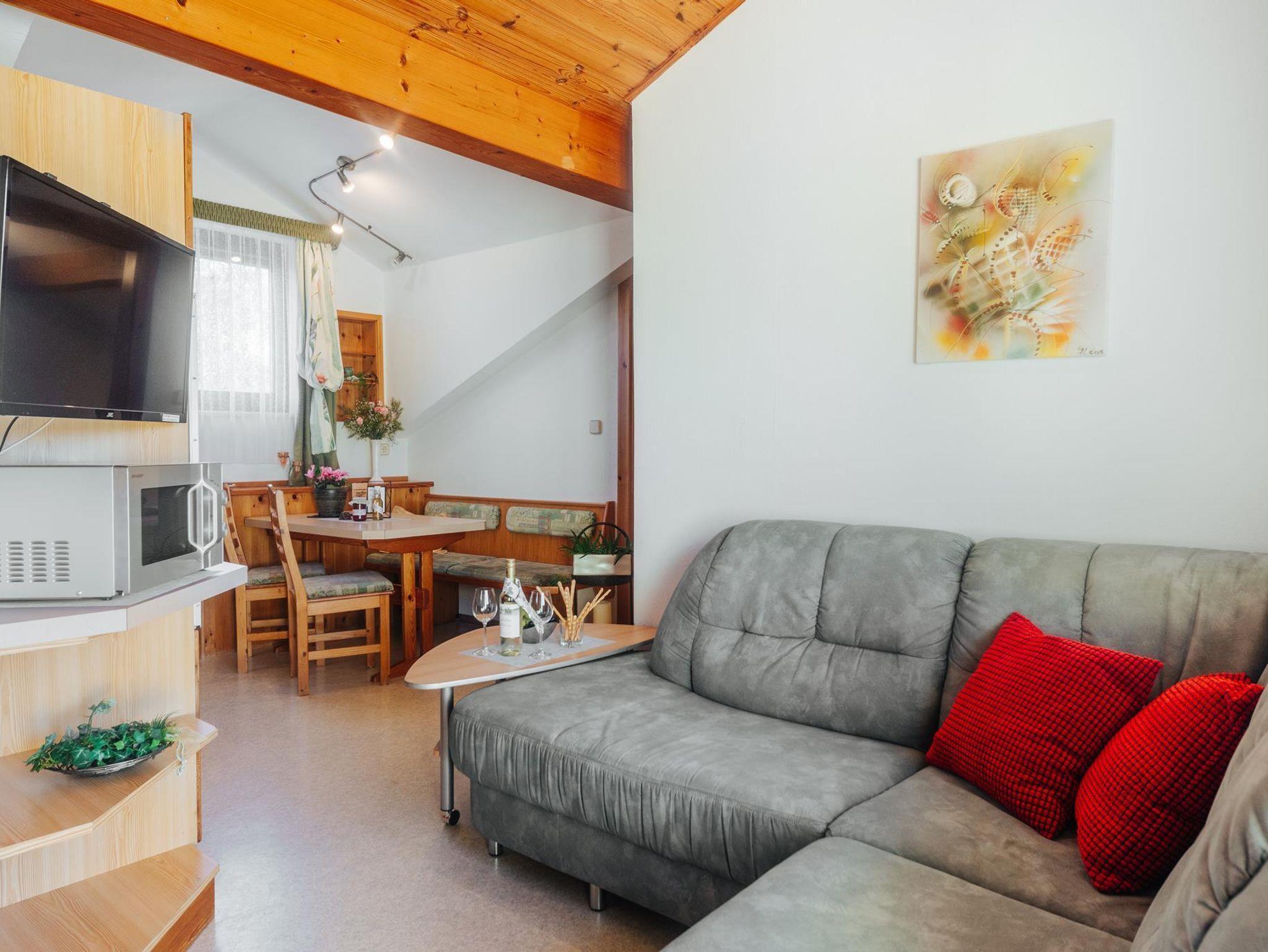 Die Ferienwohnung ist 46m² groß, bietet Platz für 4 Personen und beinhaltet zwei getrennte Schlafzimmer. Ein Schlafzimmer verfügt über ein Doppelbett mit Zugang zu einem eigenen Balkon, das zweite über ein Doppelbett. Weiters gibt es ein Wohnküche mit einer Essecke und eine Dusche mit WC. Die Wohnung verfügt zusätzlich über eine Sat/TV Anlage, Geschirrspüler, Kaffeemaschine, Küchenutensilien, Geschirr-, Handtücher und Bettwäsche. Sie liegt im 1.OG und ist an eine Dachterrasse angeschlossen, welche Sitzmöglichkeiten sowie einen Blick über den Turnersee und die Karawanken bietet.