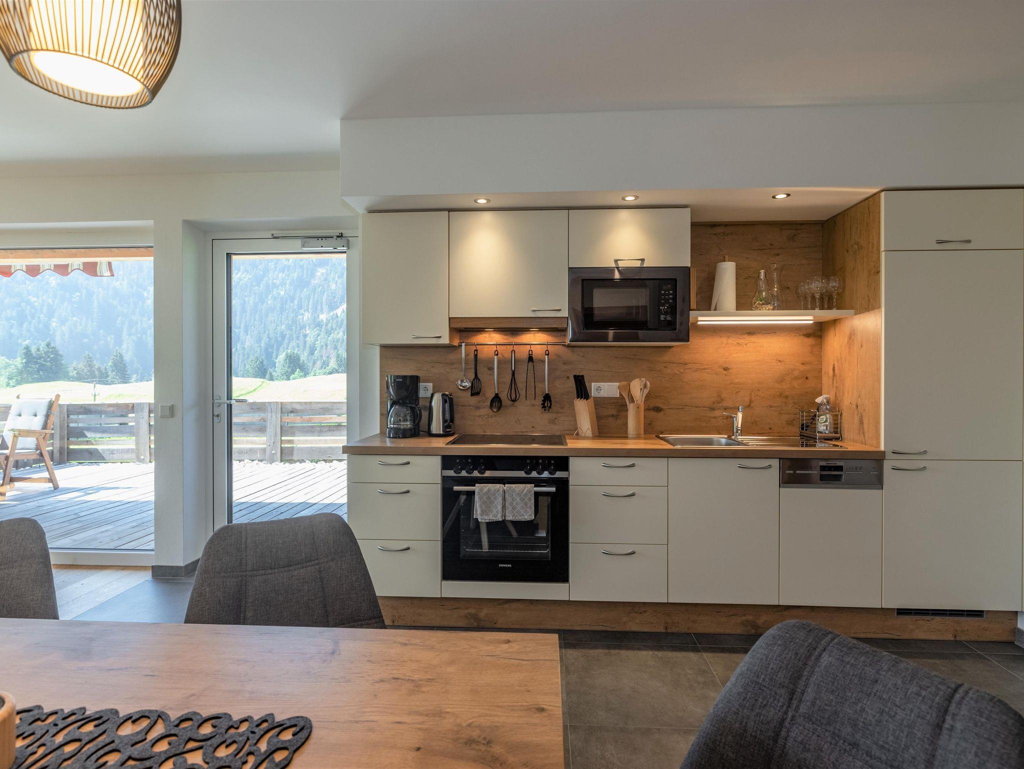 Die Fewo Sonnenaufgang mit 37 - 60 m² befindet sich im 1. Stock unseres Ferienhauses. Sie ist mit mit heimischem Holz liebevoll und komplett eingerichtet und besteht aus einer Wohnküche mit Sat/Tv, einem Schlafzimmer für 2 bis 3 Personen und ein zweites Schlafzimmer für weitere 2 bis 3 Personen und zwei Badezimmer mit DU/WC und Handtuchtrockner. Beide Zimmer verfügen über einen Vorraum mit Garderobe, sowie Sat / Tv, Wlan und großzügigem Ost-/Süd-/Westbalkon mit herrlicher Aussicht auf die karnische Bergwelt, unsern Garten und unsere Tiere