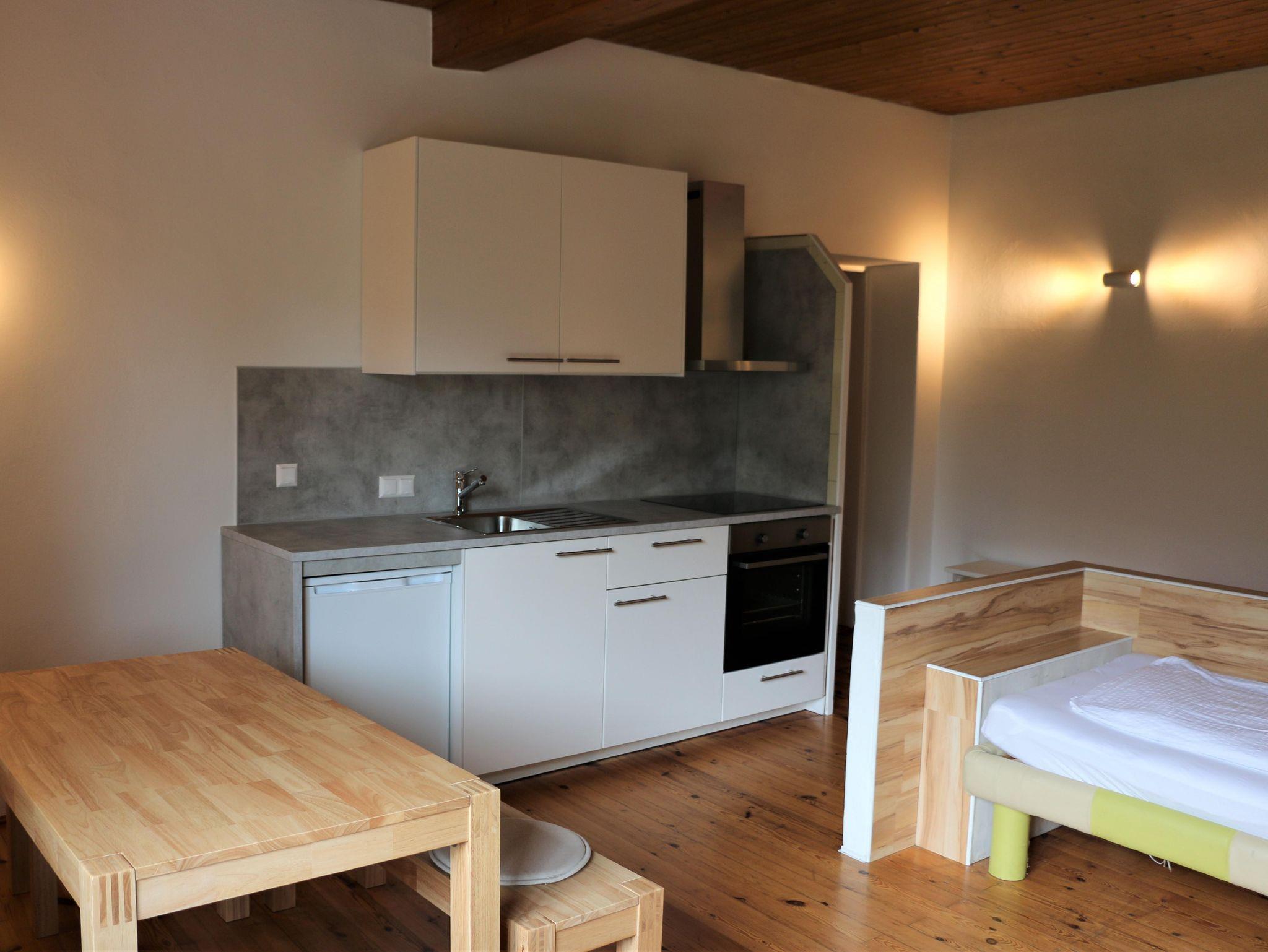 Geräumige Ferienwohnung mit einem Wohn-Schlafraum und integrierter Küchenzeile. Seperater Schlafraum mit 3 Betten. Blick nach Süden zum Hausberg Petzen.