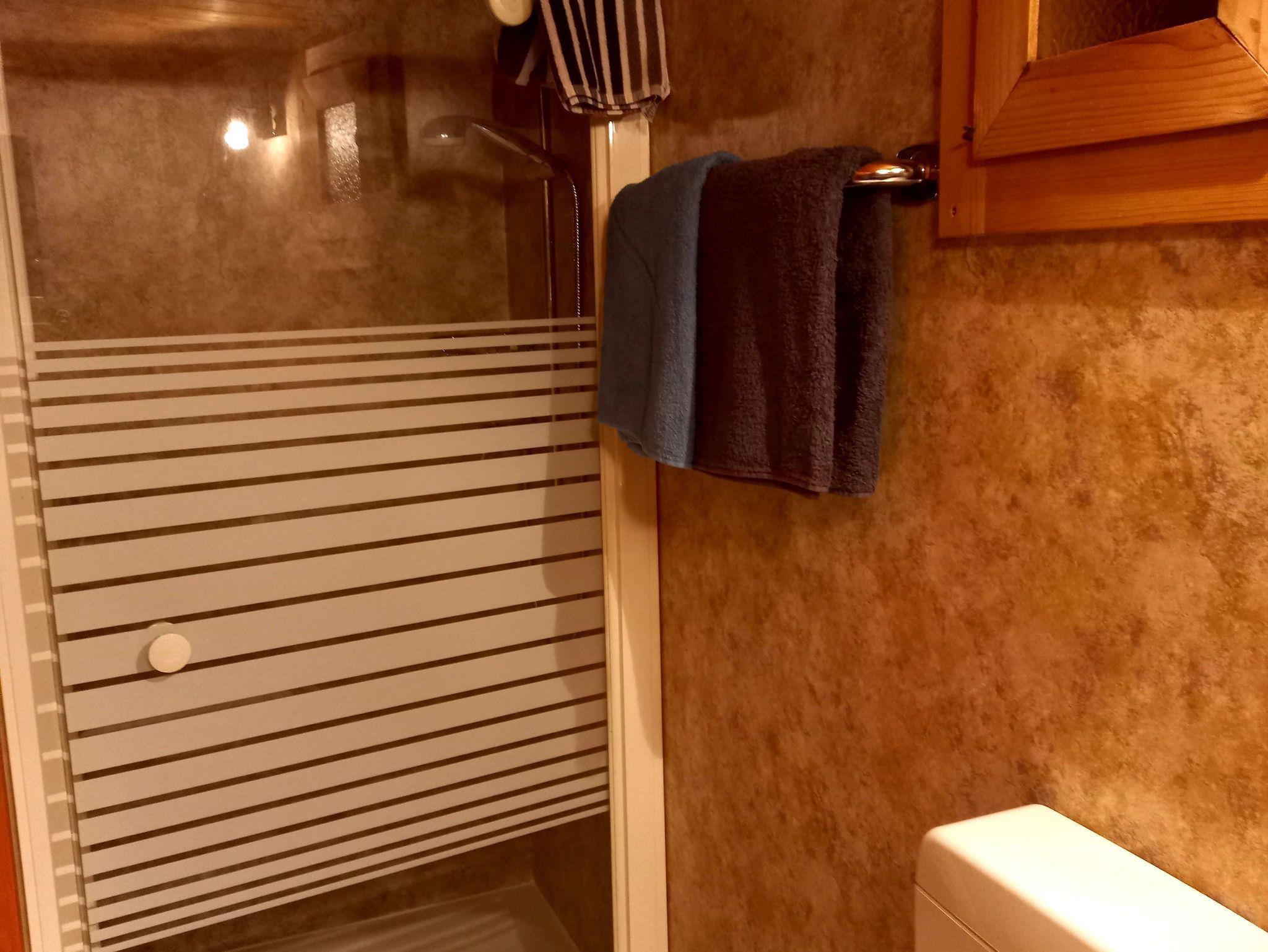 • Bad mit Dusche, Waschbecken und WC