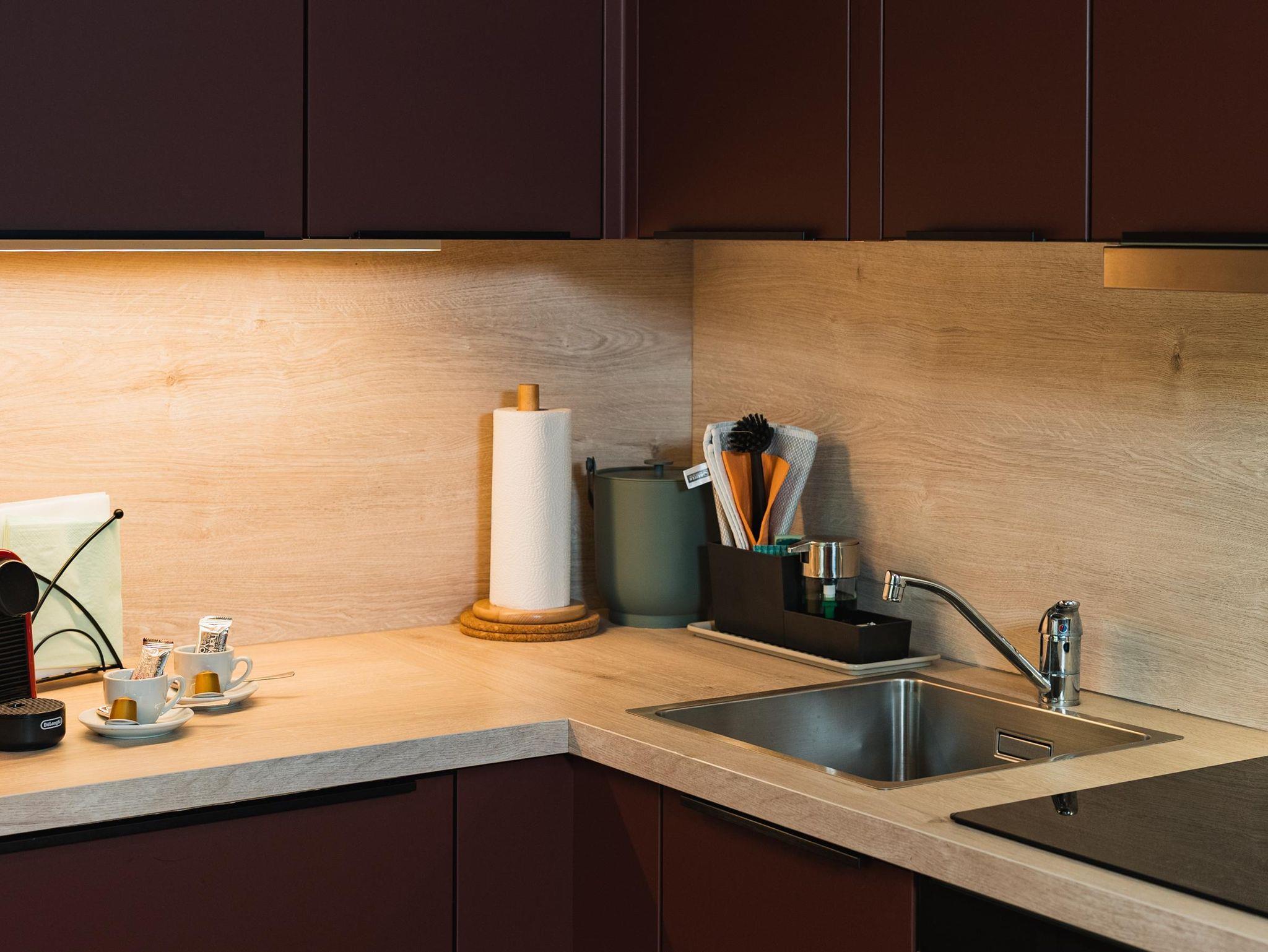 • Vollwertige Küche mit Herd, Backrohr, Microwelle, Kühlschrank und Geschirrspüler, Nespresso Essenza Mini