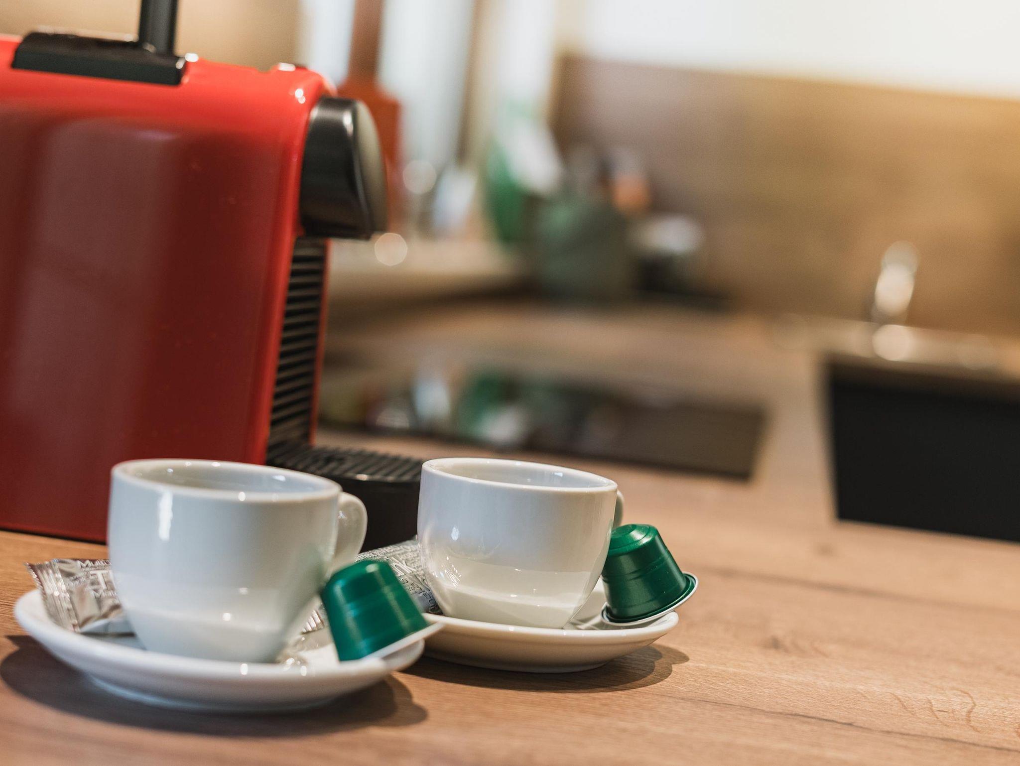 • Vollwertige Küche mit Herd, Backrohr, Microwelle, Kühlschrank und Geschirrspüler, Nespresso Essenza Mini