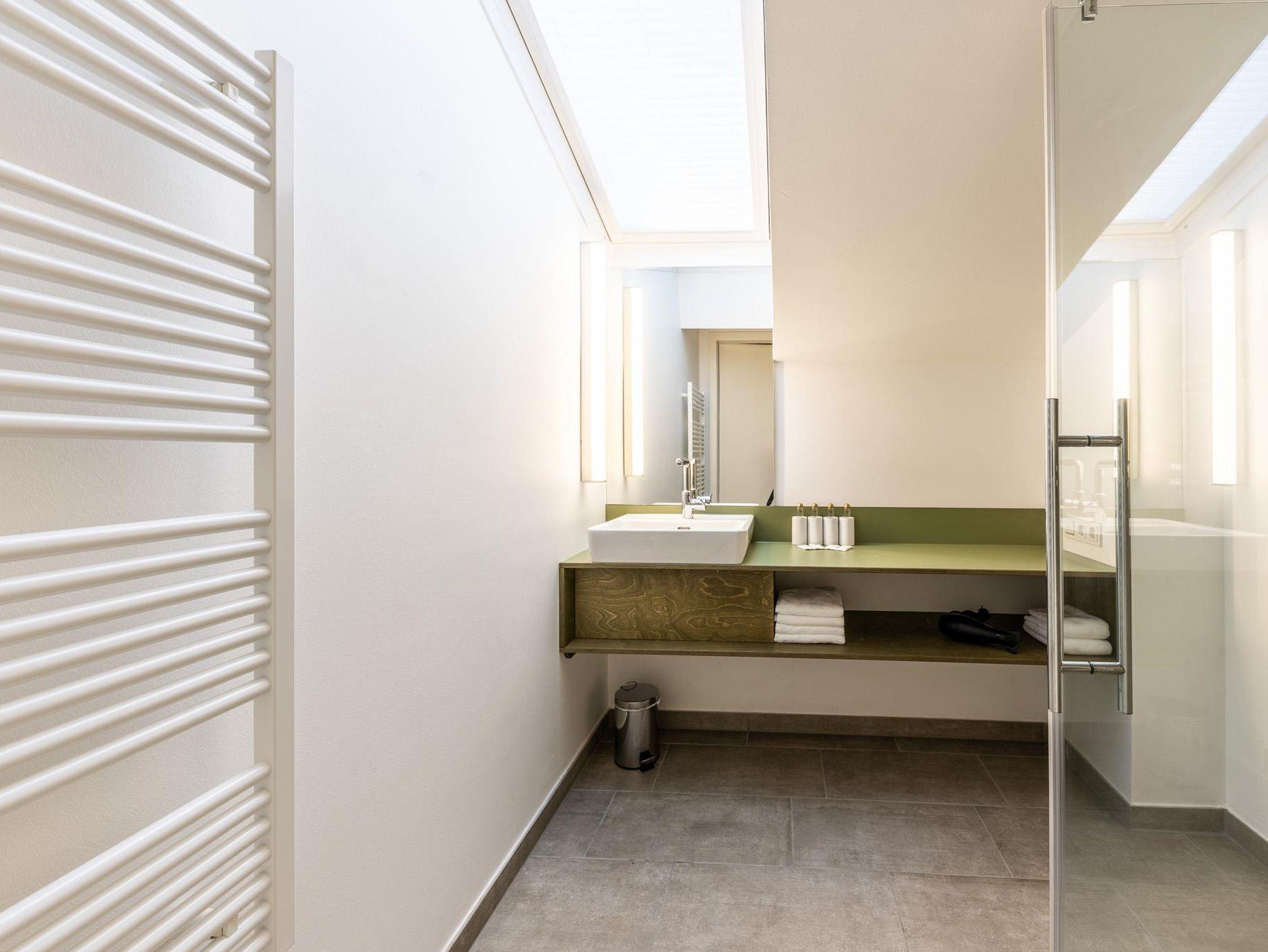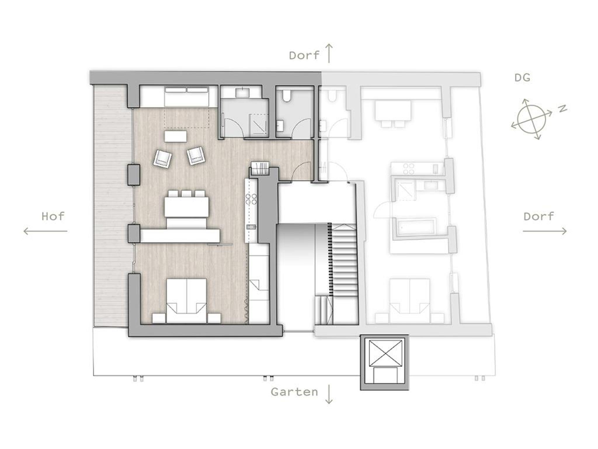 Zum Appartment Nuss im Dachgeschoss gelangt man mit dem Lift (bis zum 2. OG) und dann über ein paar letzte Stufen unters Dach. Die loftartigen Räume mit großzügigem Wohn- und Schlafraum sind mit großem Balkon Richtung Süden ausgerichtet. Ein Doppelbett, zwei Schlafkojen und ein Schlafsofa bieten bis zu sechs Personen Platz. Die Kochecke ist komplett bestückt mit allem was man zum gemütlichen Kochen braucht.