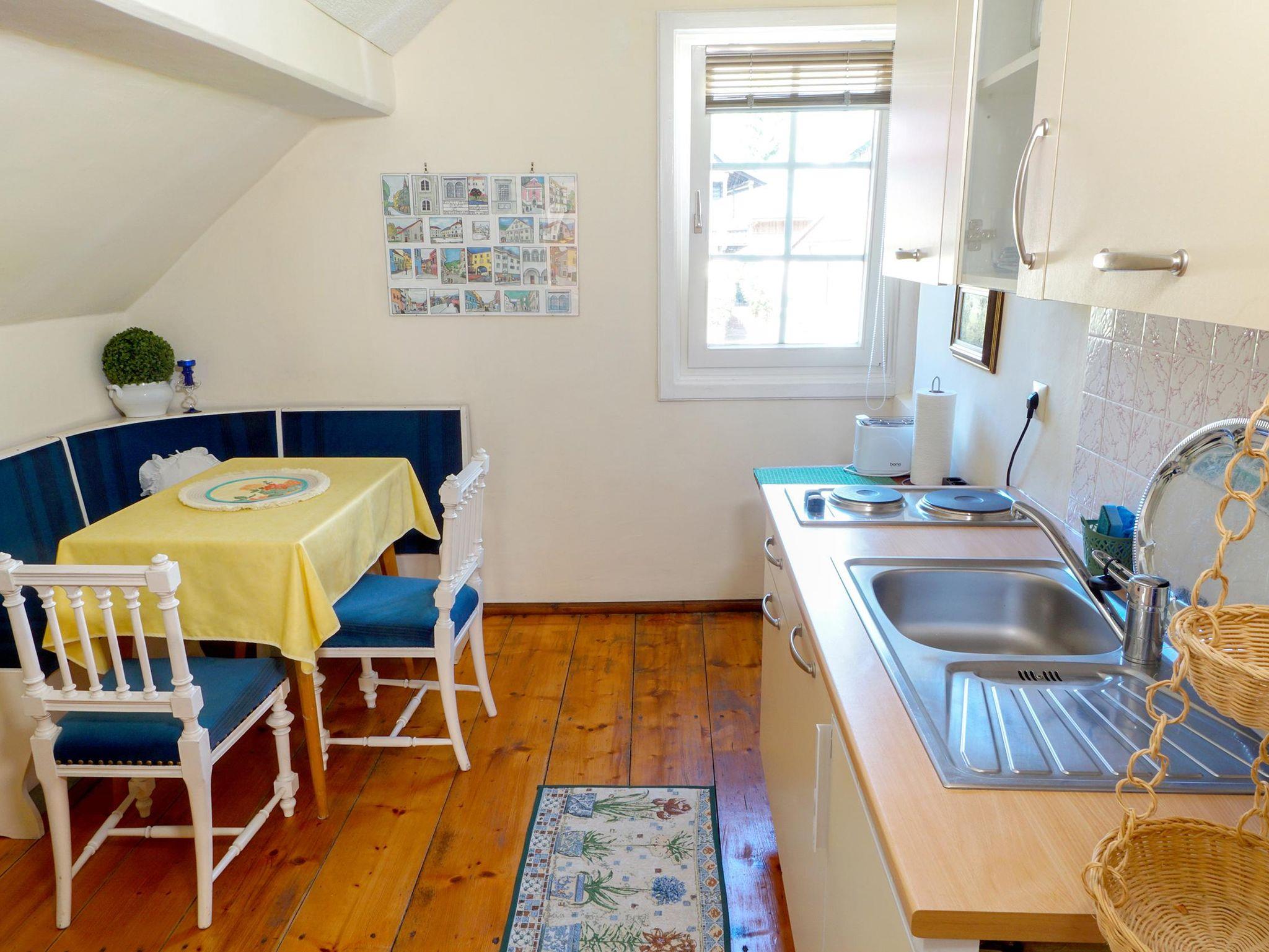 Das Badezimmer verfügt über Dusche und WC. In der Küche mit kleiner Sitzgarnitur, Mikrowelle und allen wichtigen Küchenutensilien (kein Geschirrspüler) bereiten Sie bequem Ihre Mahlzeiten zu.