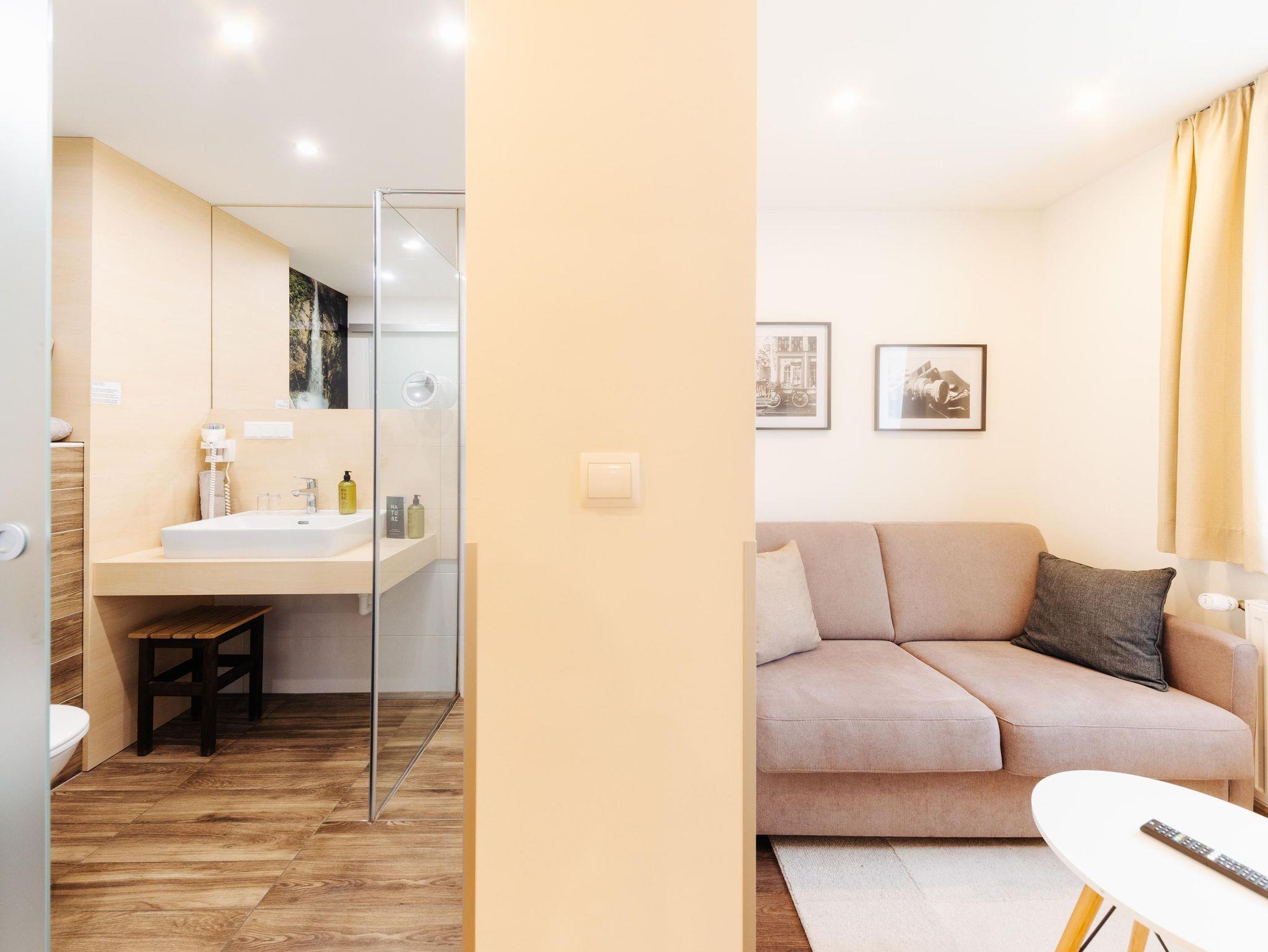 Schlafzimmer mit Flath TV und Desingbild , Verbindungstüre zu Wohnbereich mit 2. Flath TV und hochwertiger Hotelcouch ( ausziehbar mit Klatschaumatratze). Duschbereich im modernen Design mit Riesen Spiegel - Glas und Designbildern.