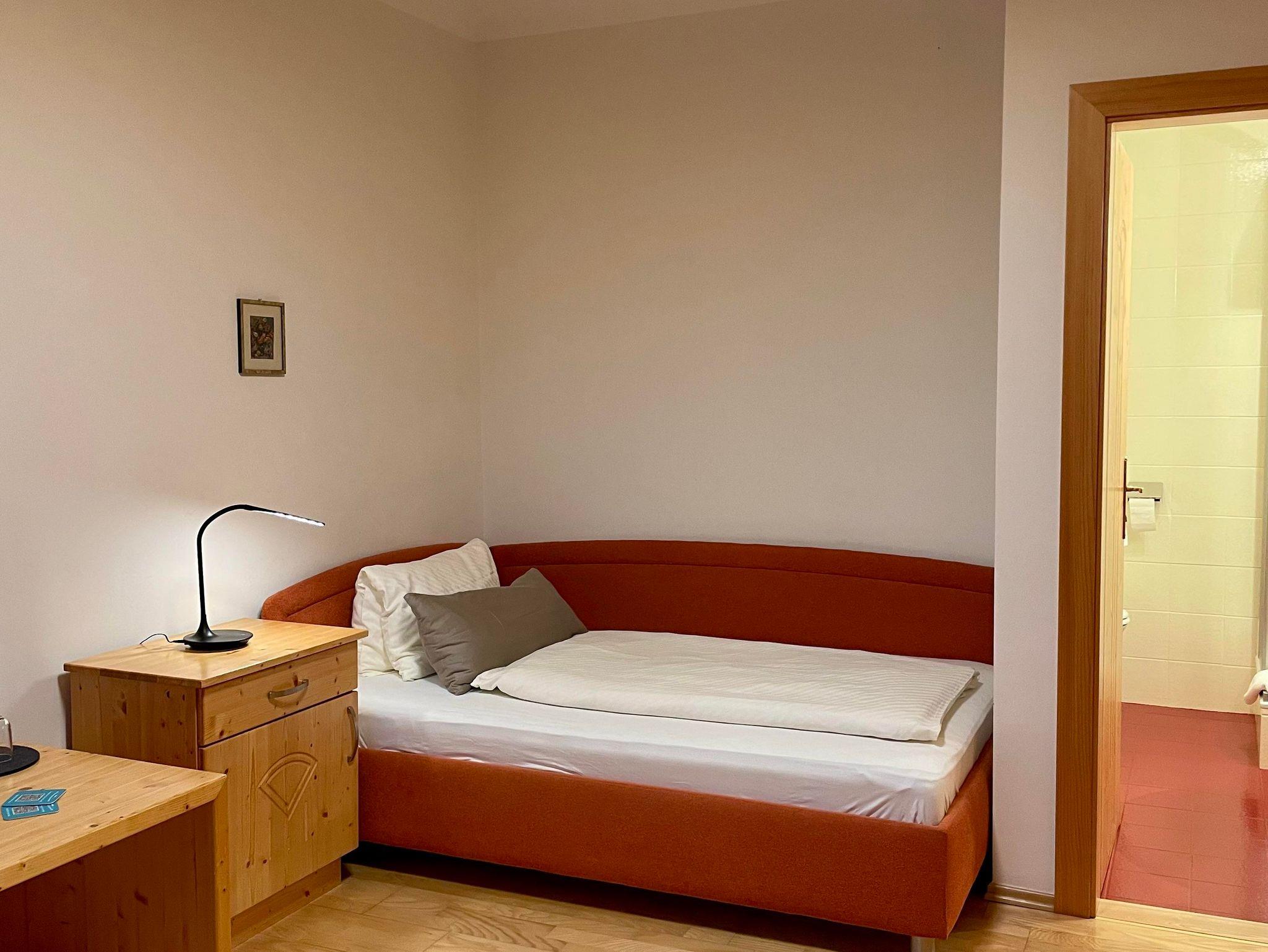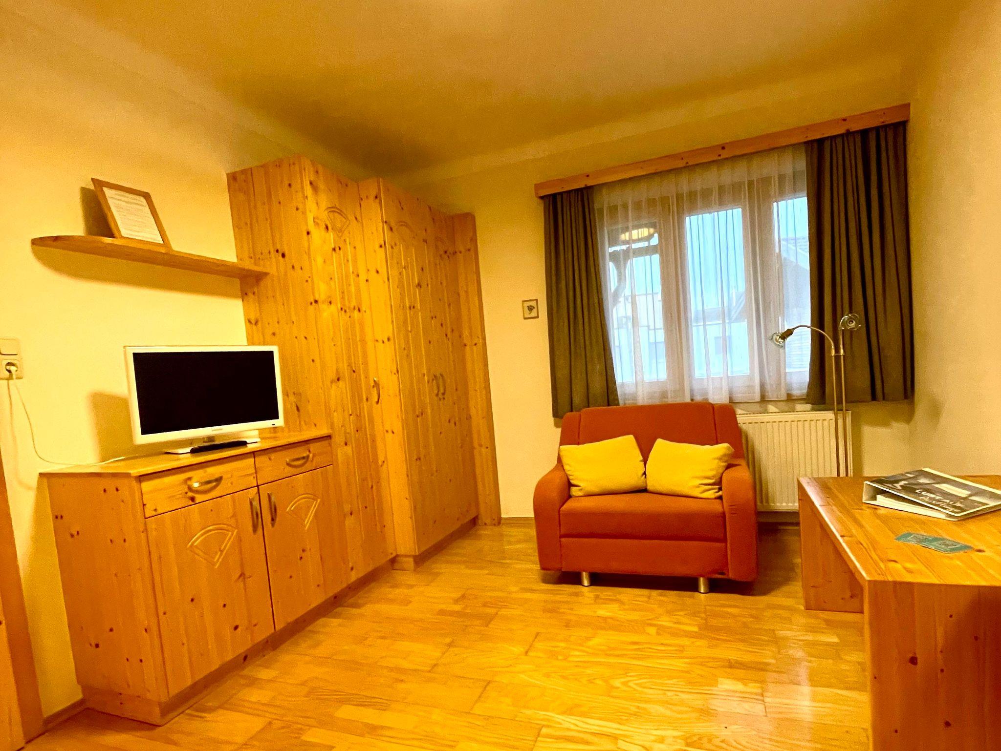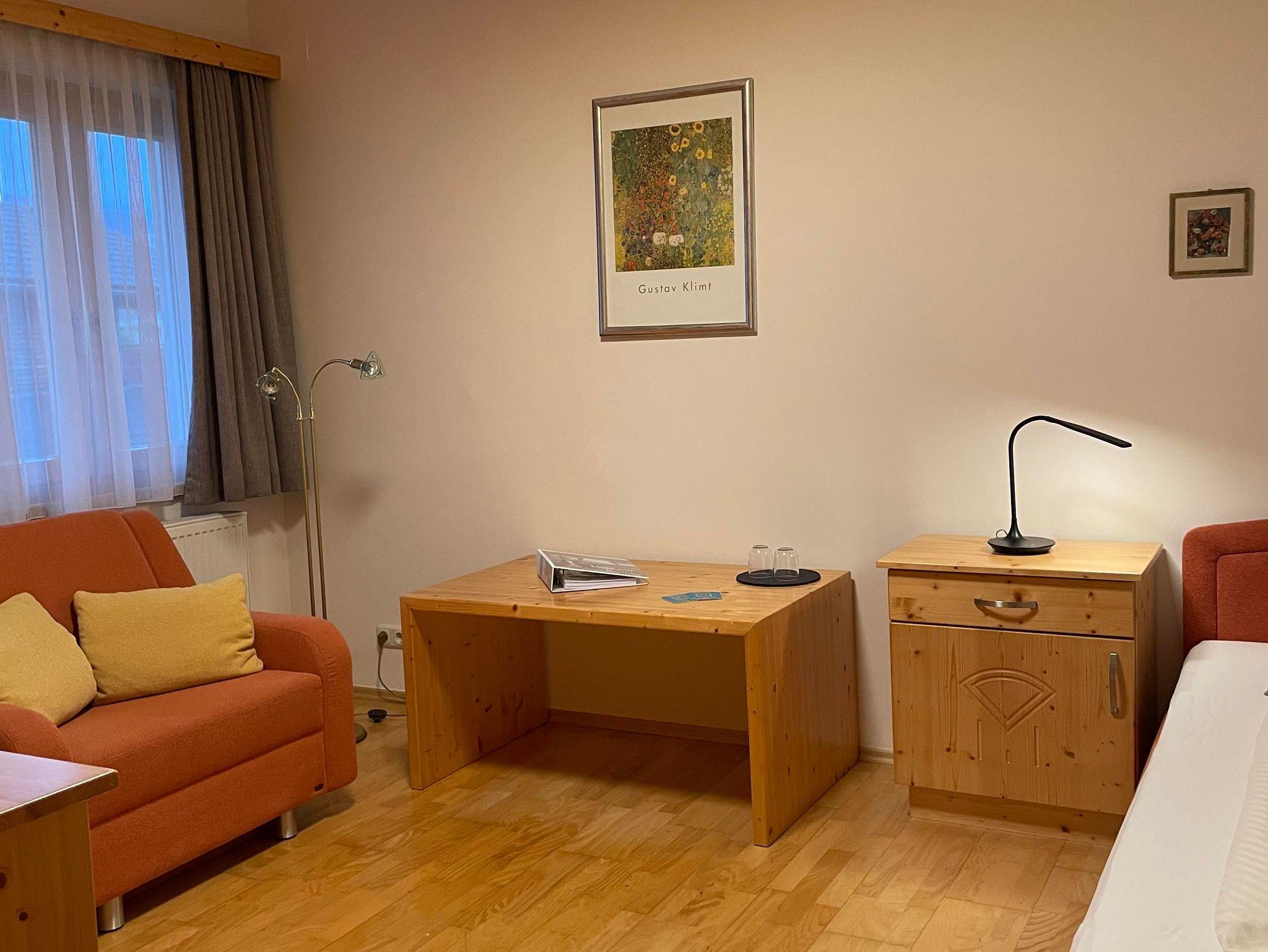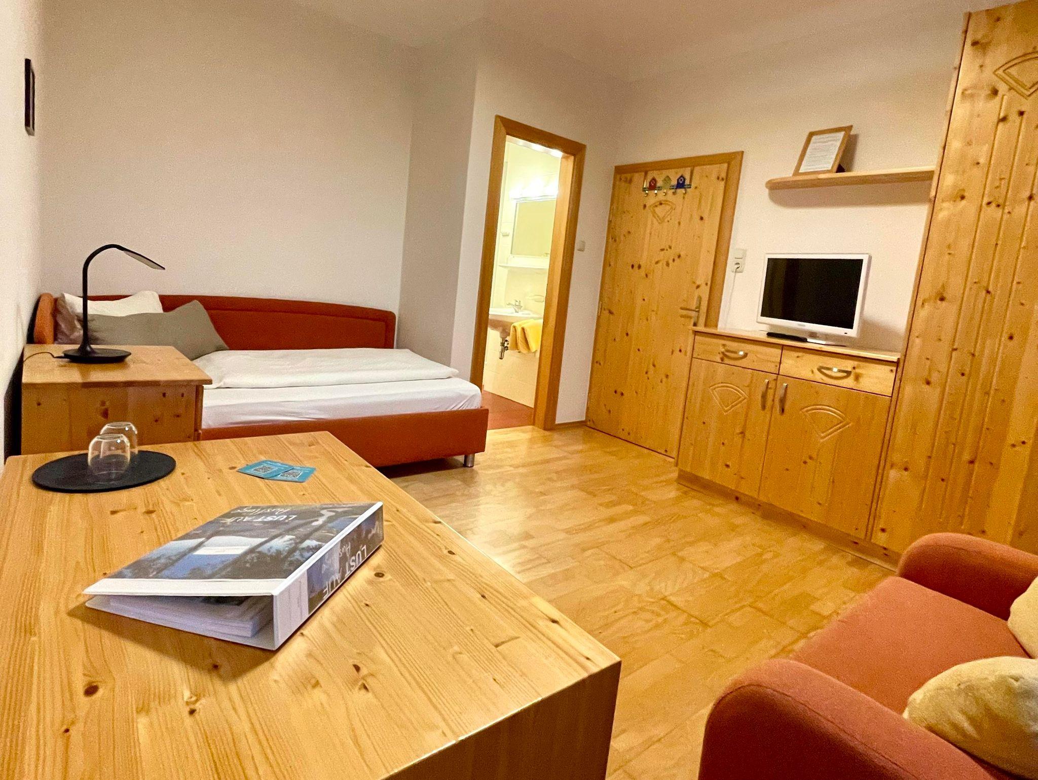 Das Einzelzimmer ist im Haus Frühauf. Es ist komfortabel groß, mit Vollholzmöbel und Holzboden.