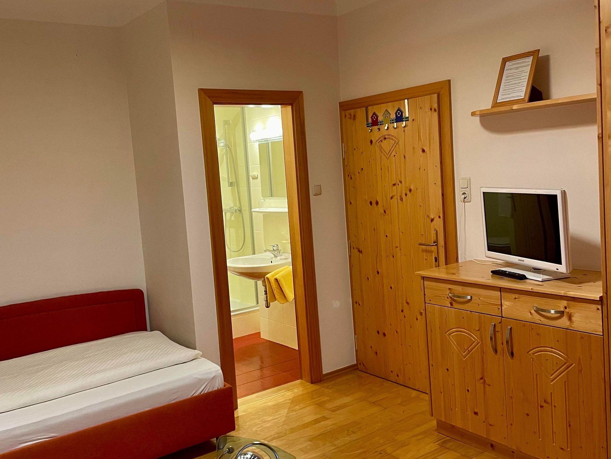 Dusche/WC, TV mit SAT, WLAN und Kühlschrank gehören zur Zimmereinrichtung.